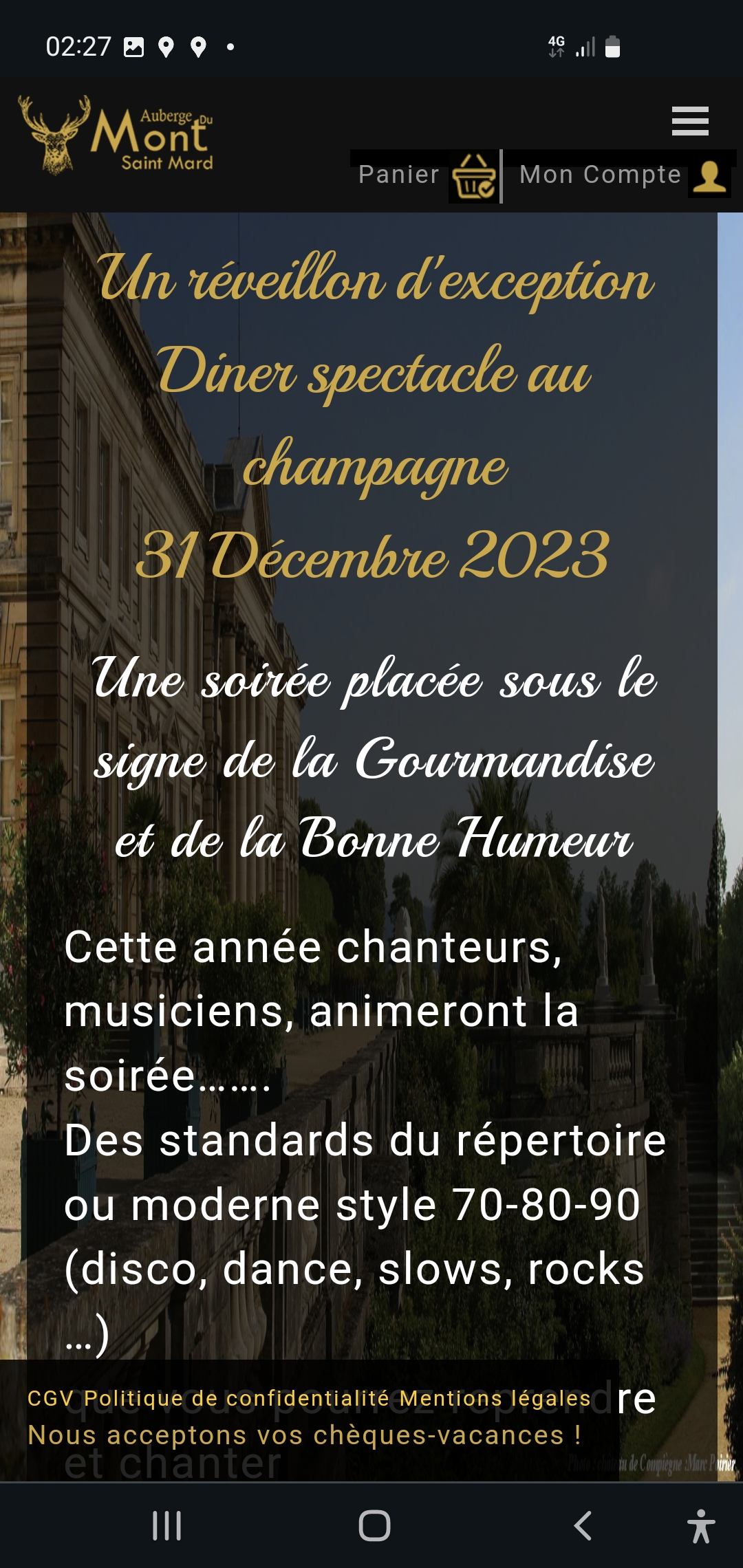 Très déçu de la soirée Saint Sylvestre annoncé comme une soirée d exception et dîner spectacle Un musicien et un chanteur inaudible dans un coin de la pièce et où est le spectacle ? Dommage nous ne reviendrons pas.
