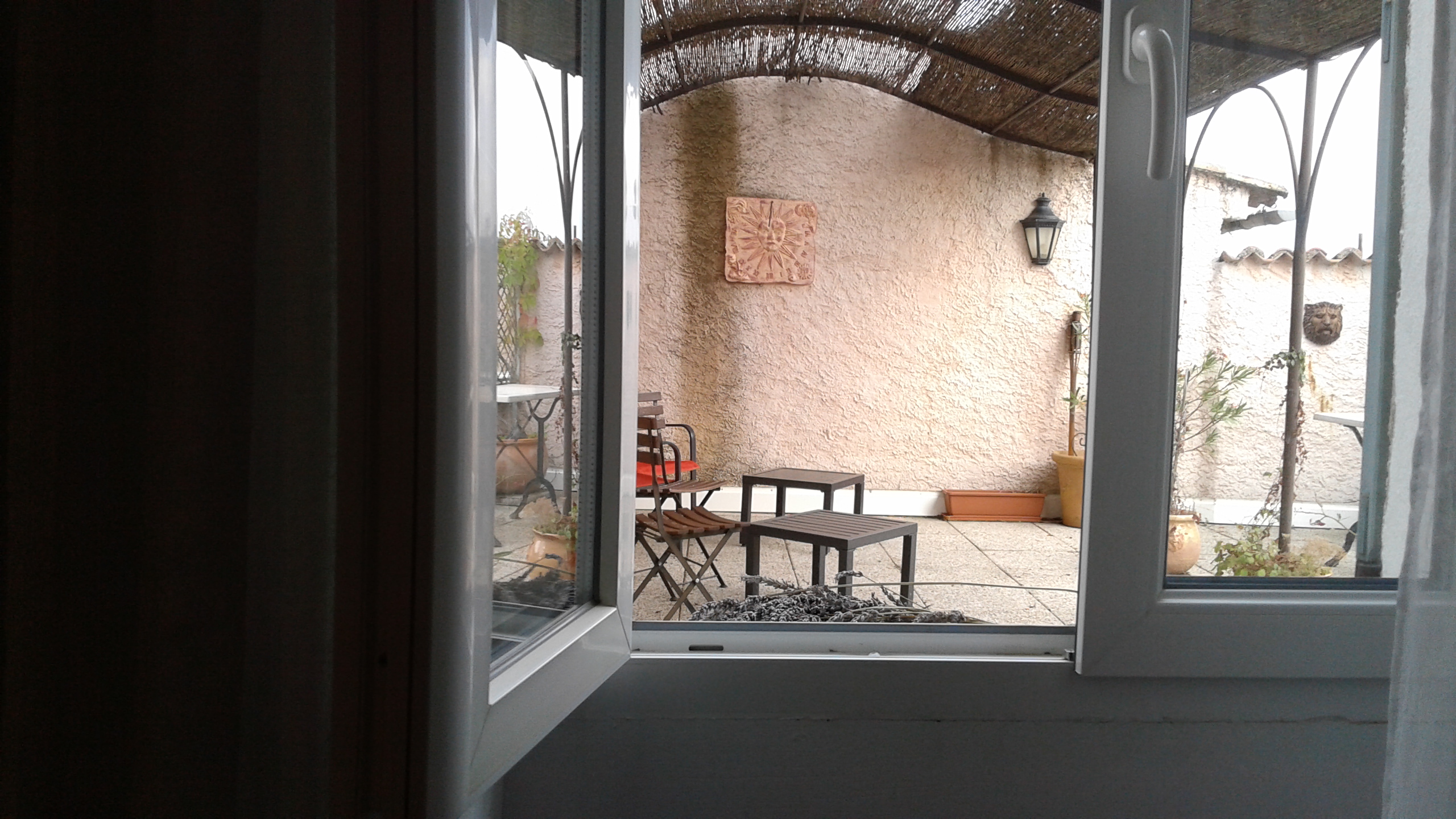 Terrasse commune avec une très belle vue. Chambre grande et propre.