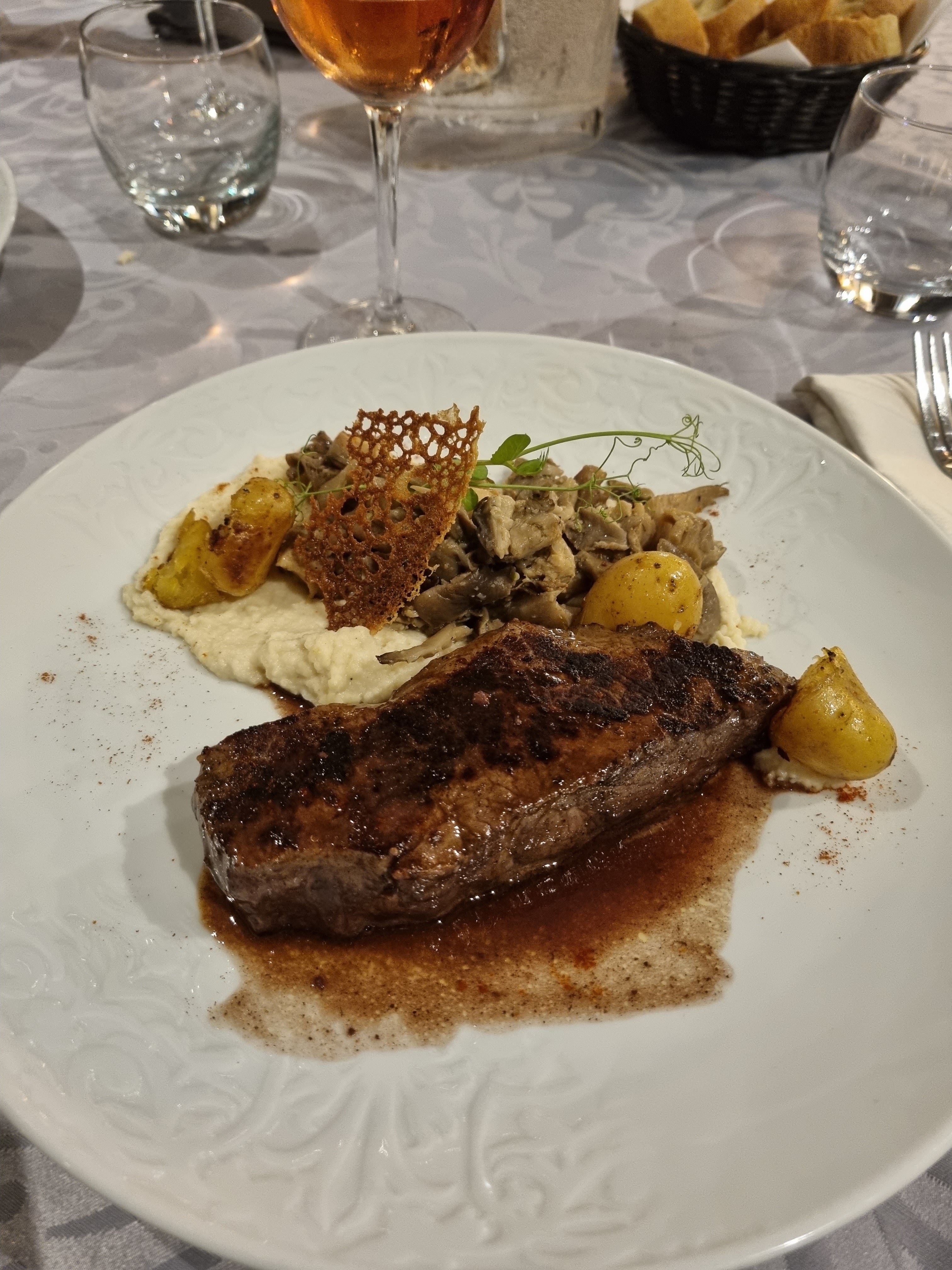 Excellent cadre, la terrasse est magnifique ! Les plats sont exquis mon entrecôte était très bien cuite, tendre et sans nerf. Mon entrée était très bonne et le dessert était vraiment très bon également ! Je ne peux que recommander cet excellent restaurant !