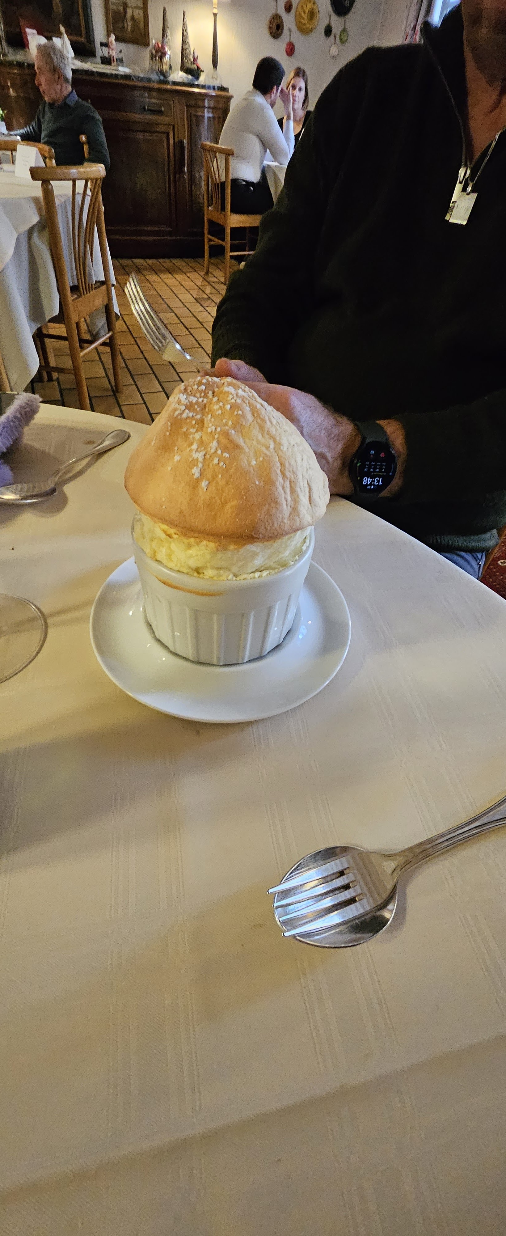 Très bon et cuisine originale sur certains plats Service agréable Une belle auberge qui peut paraître un peu vieillot pour certains.....les plus jeunes ! Nous y avons super bien mangé, petites brochettes de melon ou jambon cru en accompagnement de l'apéritif puis amuse bouche sous forme de gaspacho andalous une merveille de goût. Pour ma part une salade de homard en entrée puis un bar sur peau. En attendant le dessert des petits mignardises puis un soufflé grand marnier (ma seule photo car nous étions invités donc je ne voulais pas paraître impolie en prenant des photos) puis avec le café des truffes au chocolat J'espère vous avoir donner envie d'y aller