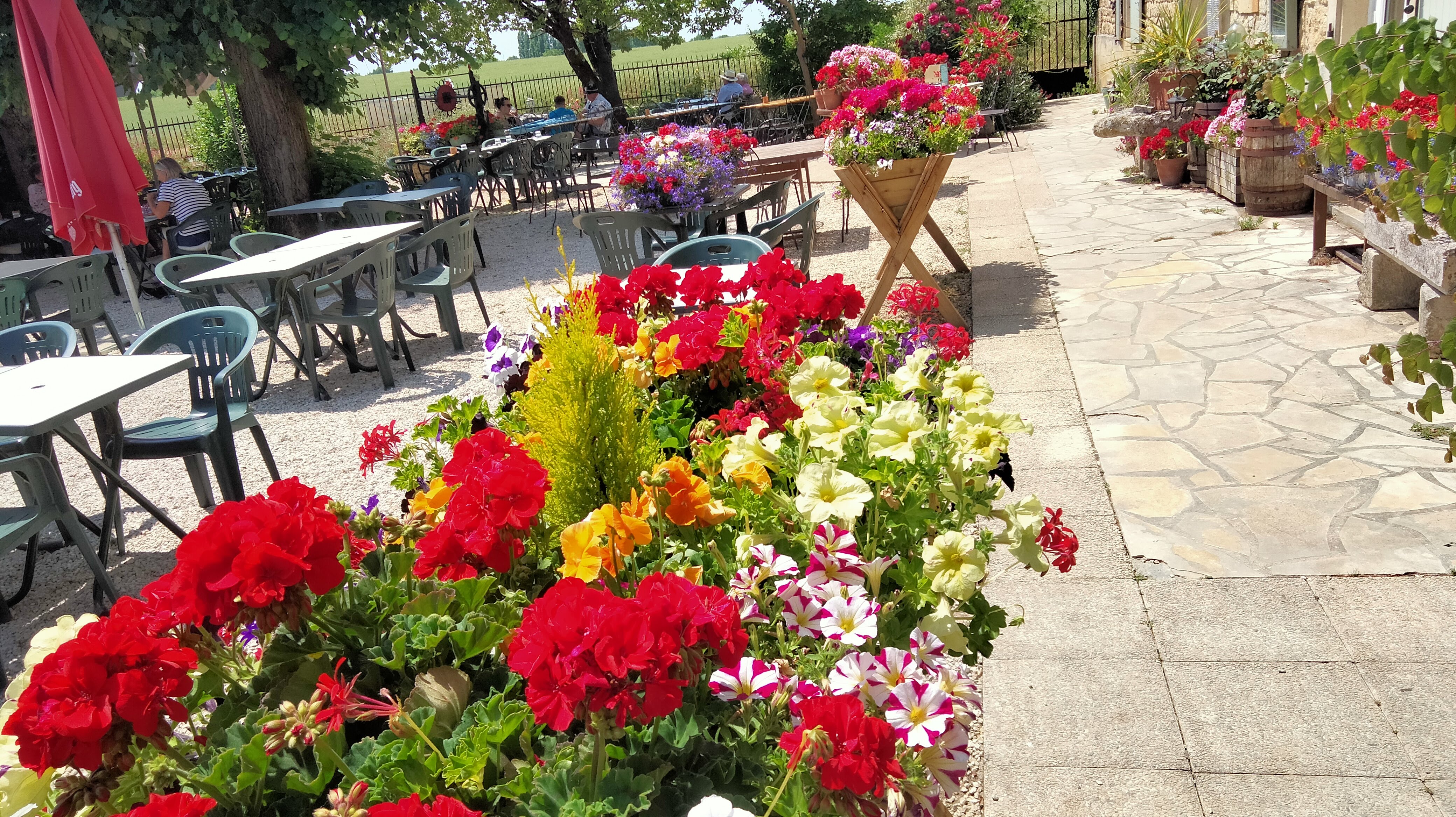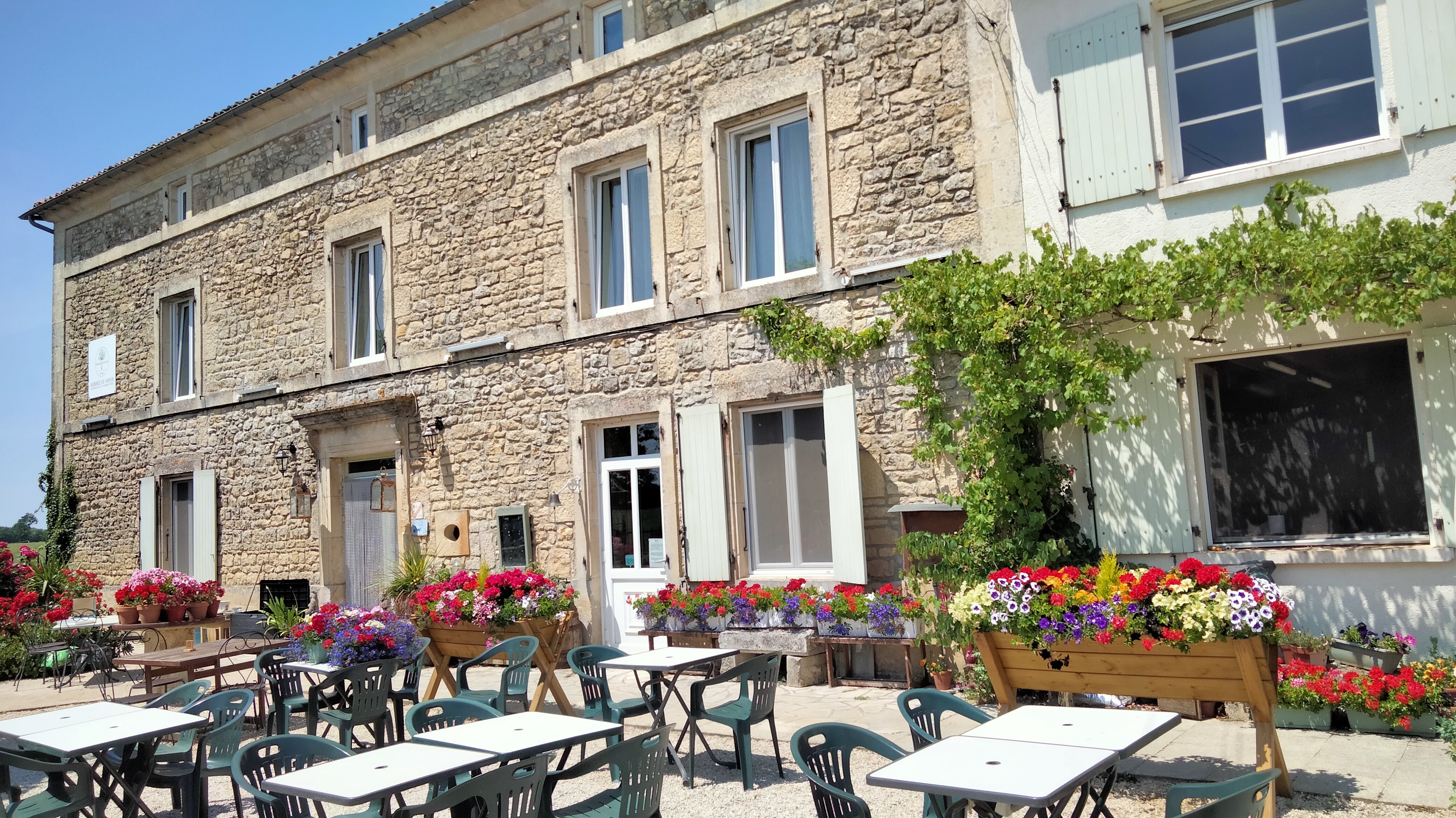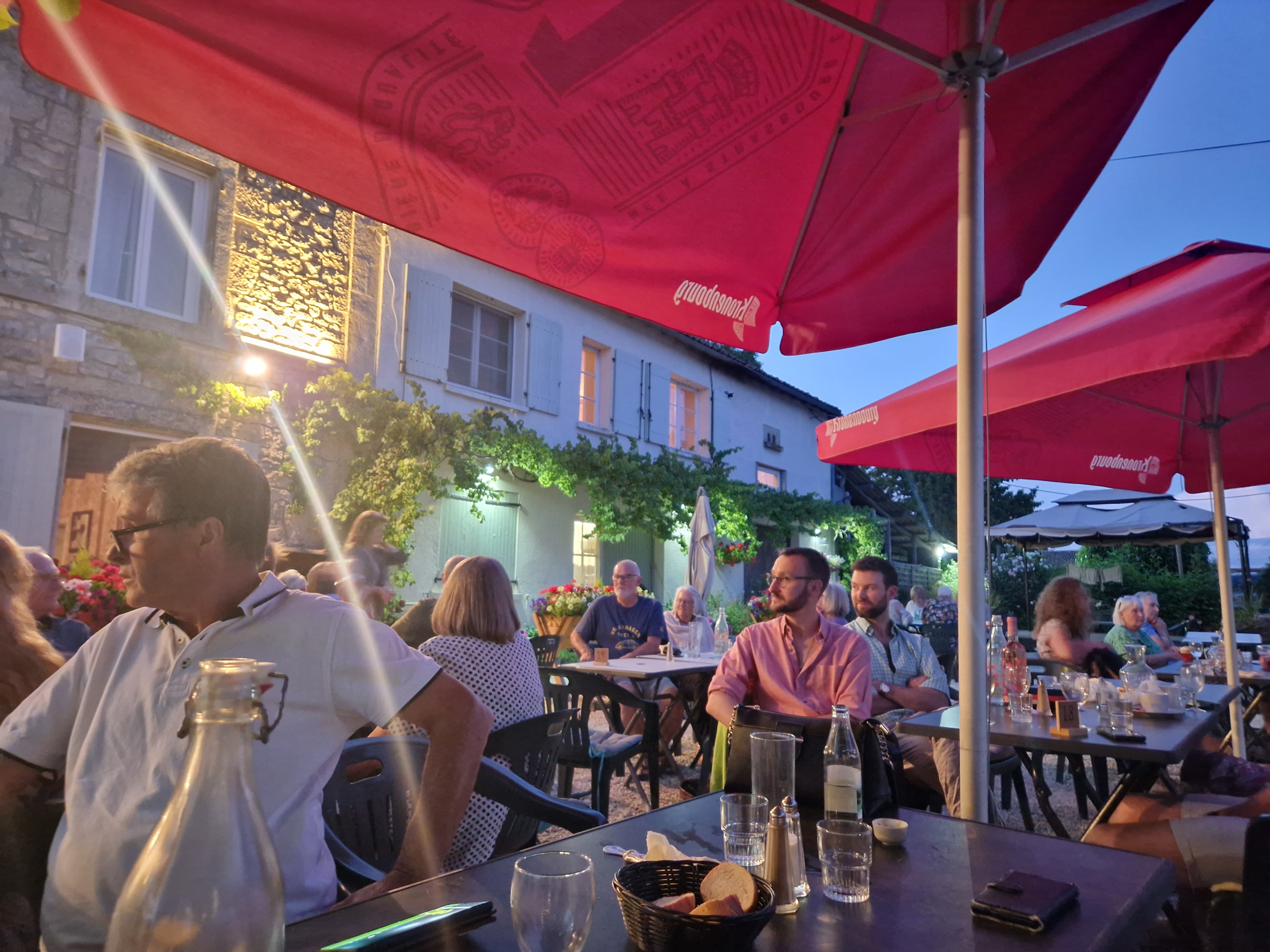 Lorsque nous sommes en vacances dans notre caravane dans la région, nous veillons toujours à visiter l'Auberège du Noyer car c'est une belle expérience. Vous serez accueillis chaleureusement par Shaun, Steve et son équipe qui s'occuperont de vous. Vous pouvez vous asseoir dans une magnifique cour à la française et quand il y a de la musique live lors d'une chaude soirée d'été, cela rend l'ambiance encore plus spéciale.