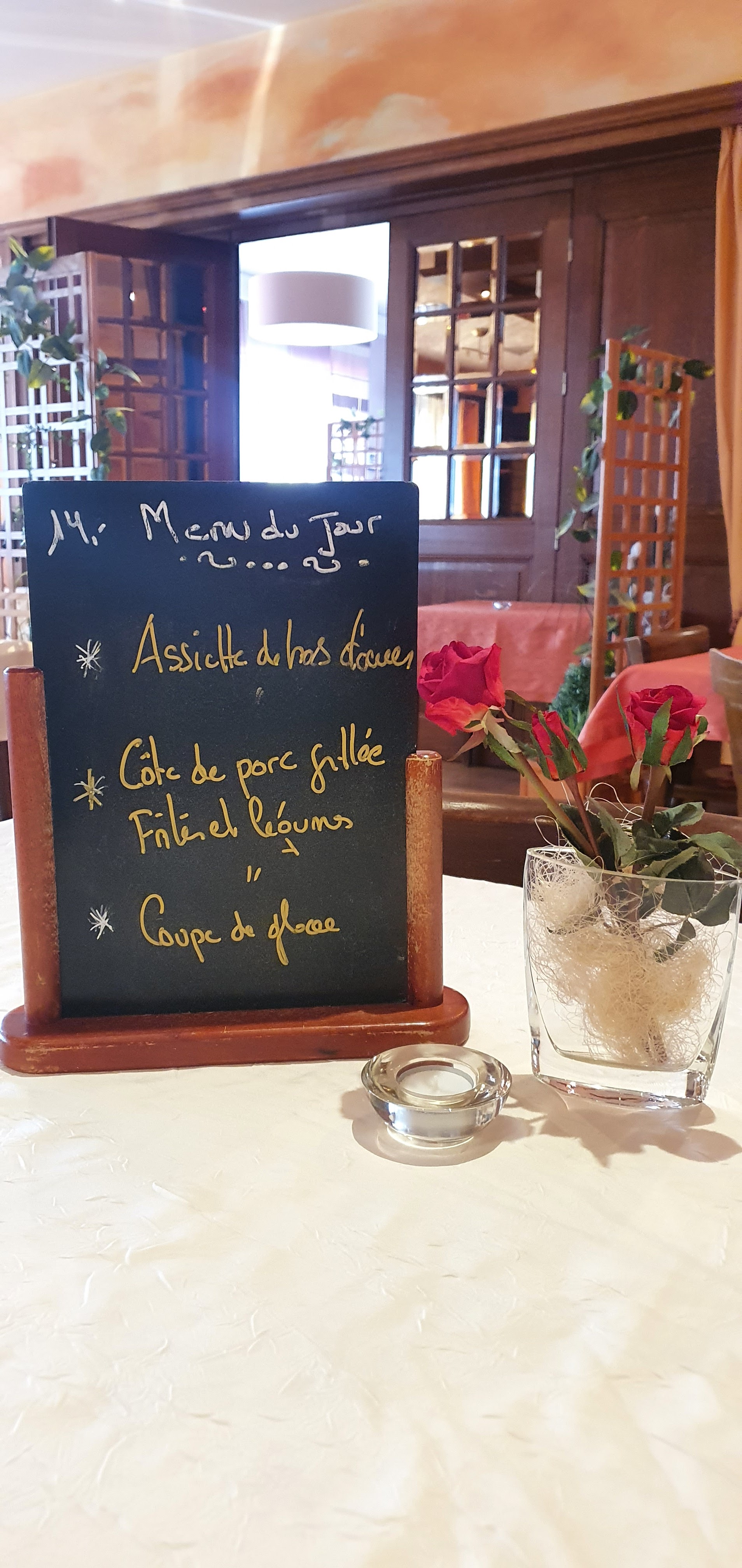 Nous nous sommes arrêtés cet après-midi en passant. Le plat du jour (déjeuner) était super. Le service était également très bon. Une telle situation devient de plus en plus rare en Allemagne. Heureusement pour nos connaissances rudimentaires du français, ils parlent allemand.