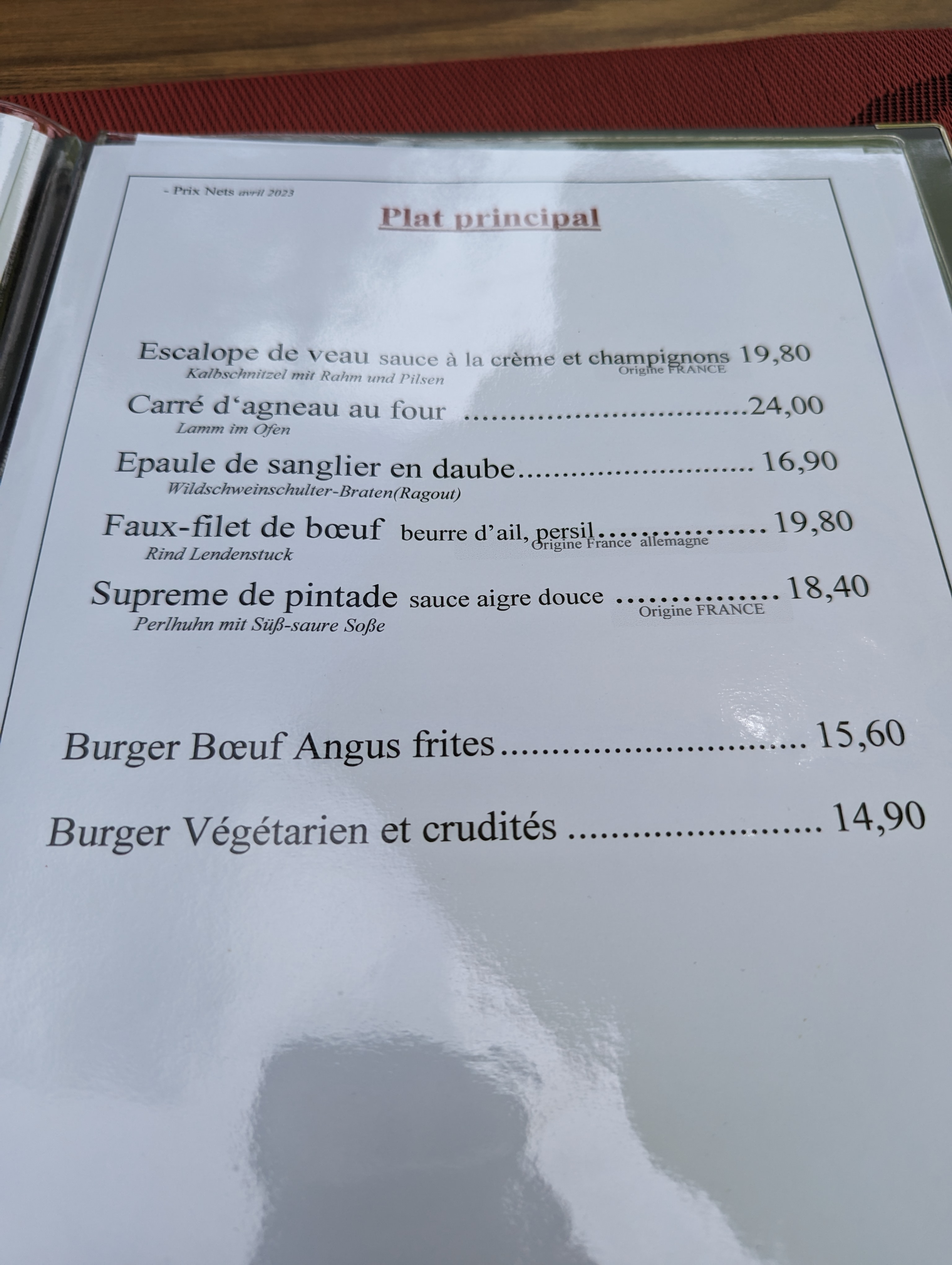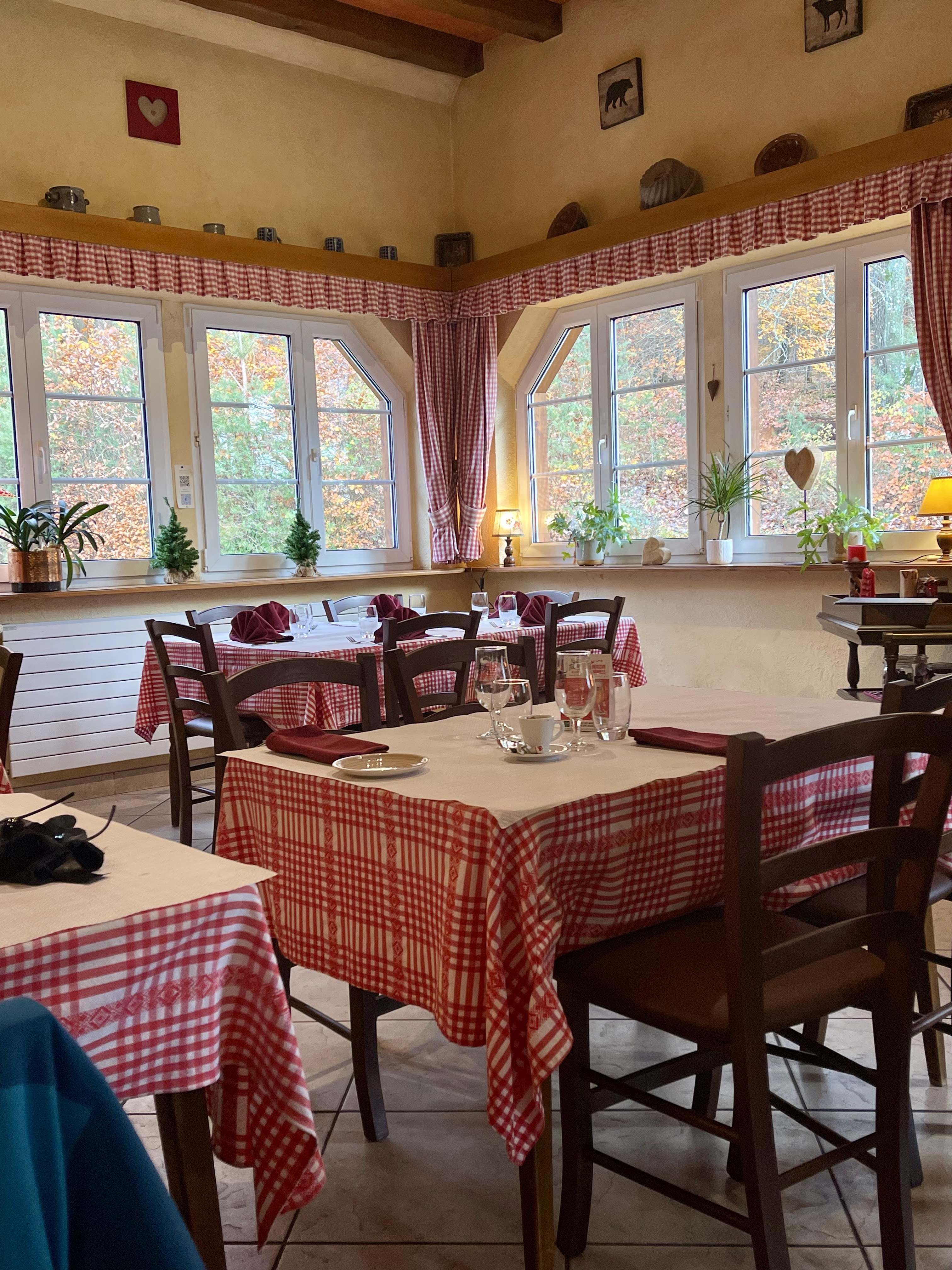 On se croirait dans les Alpes françaises, comme dans une aire de battage avec au milieu un grand lustre en bois de cerf, une cheminée qui crépite, des nappes rouges et blanches et des rideaux assortis. Tout est parfait, y compris le menu français classique. La maison est dans la famille depuis 95 ans, le propriétaire la gère en 4ème génération et est lui-même responsable du service, de manière extrêmement conviviale, bilingue et confiante. En entrée, nous avons mangé du chèvre chaud aux herbes avec une salade noix-raisins. En plat principal, des rognons de veau sauce moutarde avec spaetzle. Les deux étaient excellents et les portions étaient grandes. Le niveau des prix peut désormais être qualifié de « valeur-prix ». Nous reviendrons . Merci .