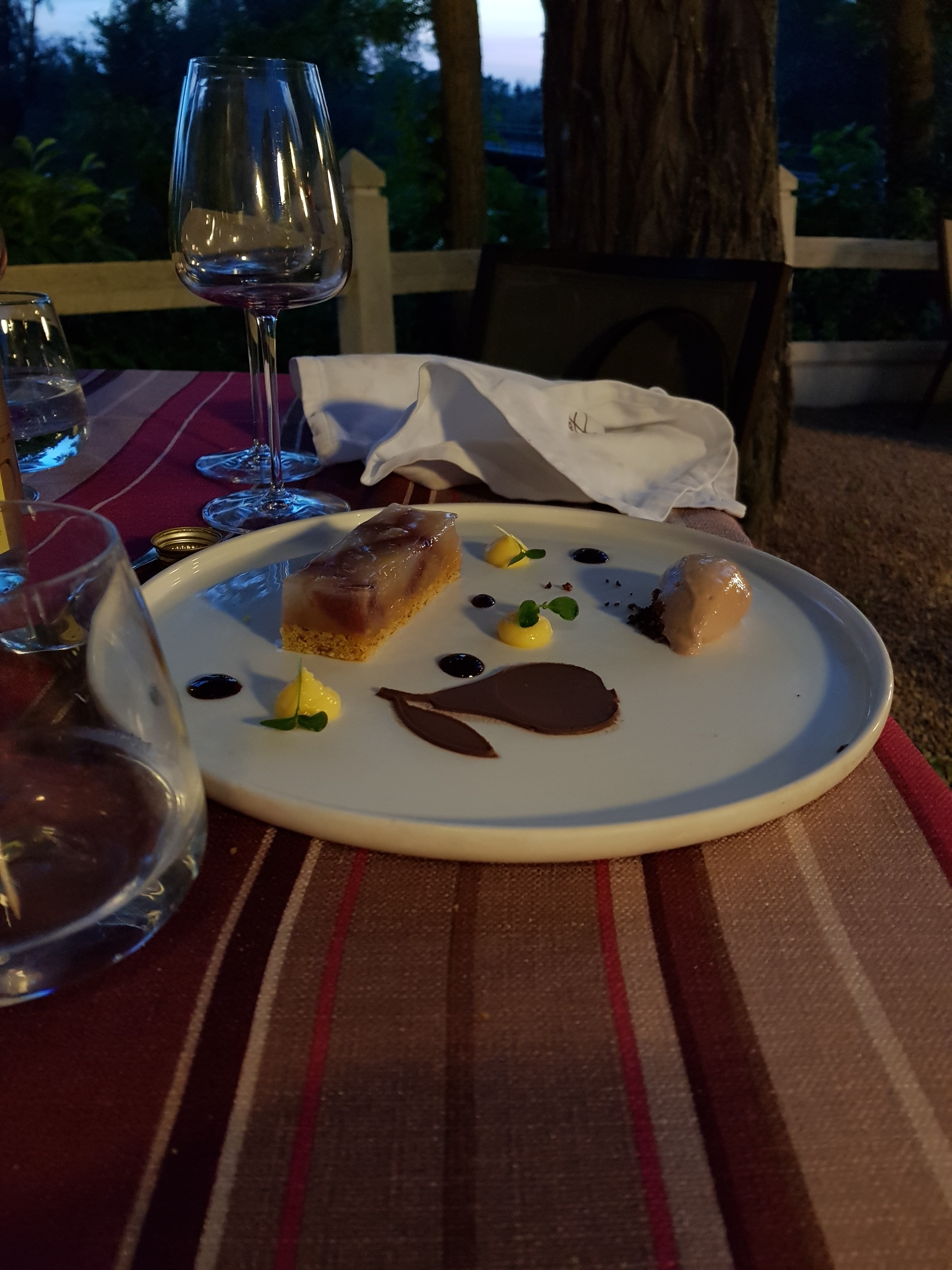 repas en terrasse en fin d'été sans avoir d'autre choix.Pas de nappe!Pique nique?non non excellent diner et cuisine raffinée.Vins prix excessifs.Globalement la qualité prix n'etait pas au rendez-vous.