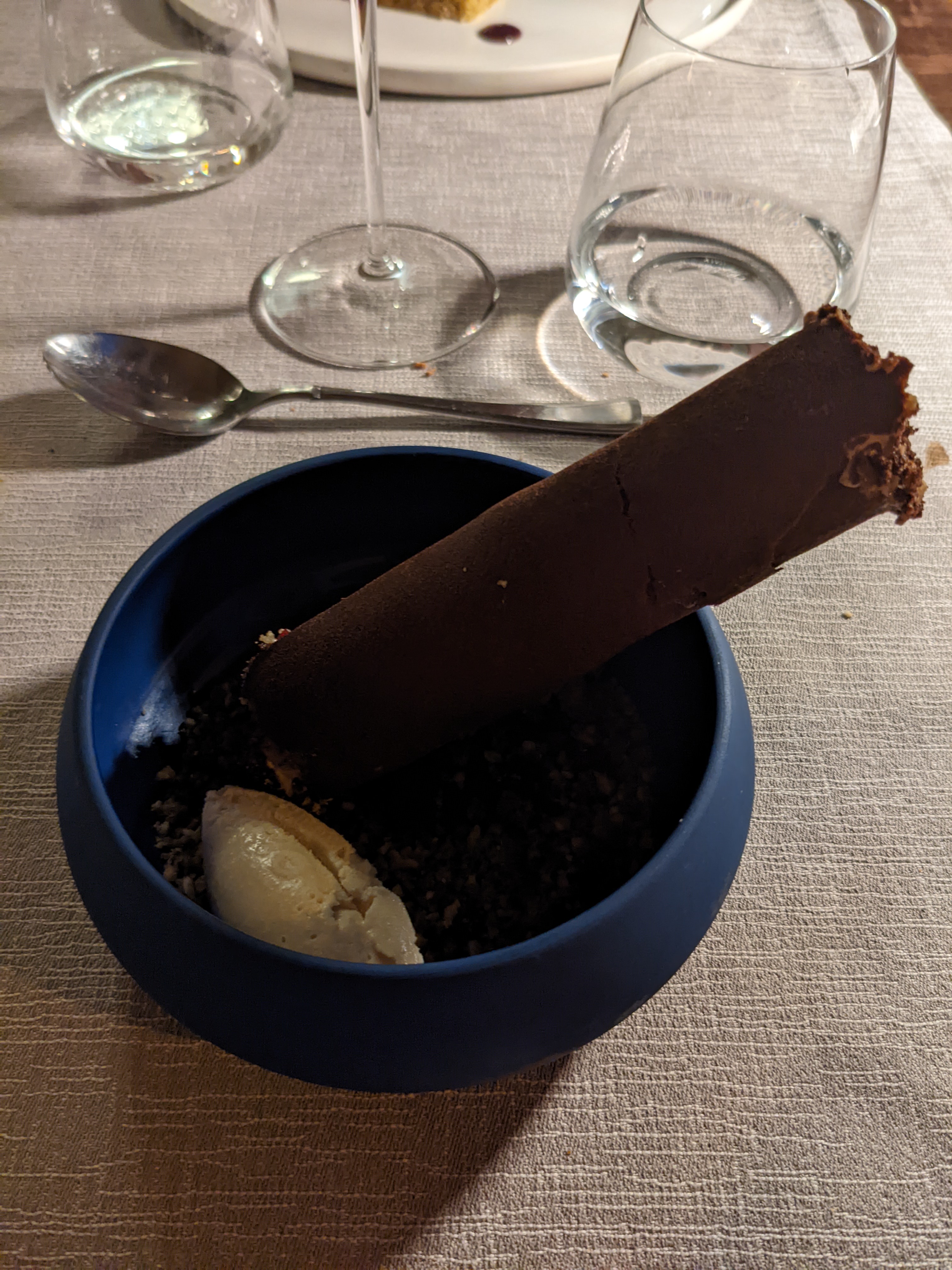 Un restaurant au top. Menu à 70 euros vins compris Des mises en bouche parfumées Un gaspacho d avocat et citron combawa, excellent. Un dos de lieu et un risotto de blé vert, ce fût mon plat préféré, une sous noix de veau et ses carottes couleur. Mousse de fromage de vache, et pour terminer un cigare croustillant à la mousse au chocolat accompagné d une glace Baileys. Nous avons passé une très belle et bonne soirée. Notre serveur Olivier est d une gentillesse. Le restaurant à obtenu un Bib gourmand largement mérité