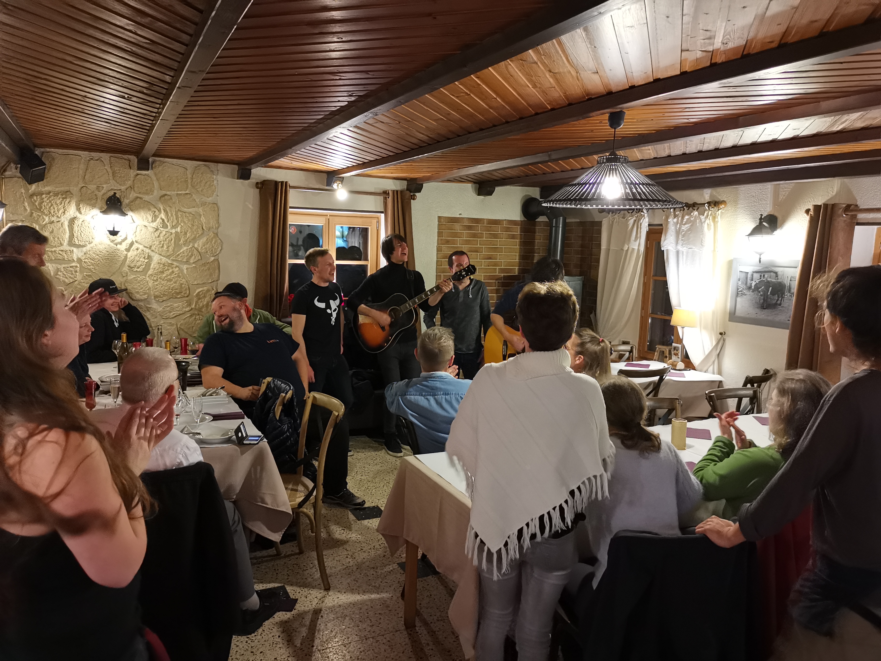 Après notre journée de ski, super accueil malgré l'heure tardive (21:45) le chef nous a préparé une tartiflette suivie d'une tarte aux myrtilles maison, un délice. En photo un groupe qui reprend les Beattles