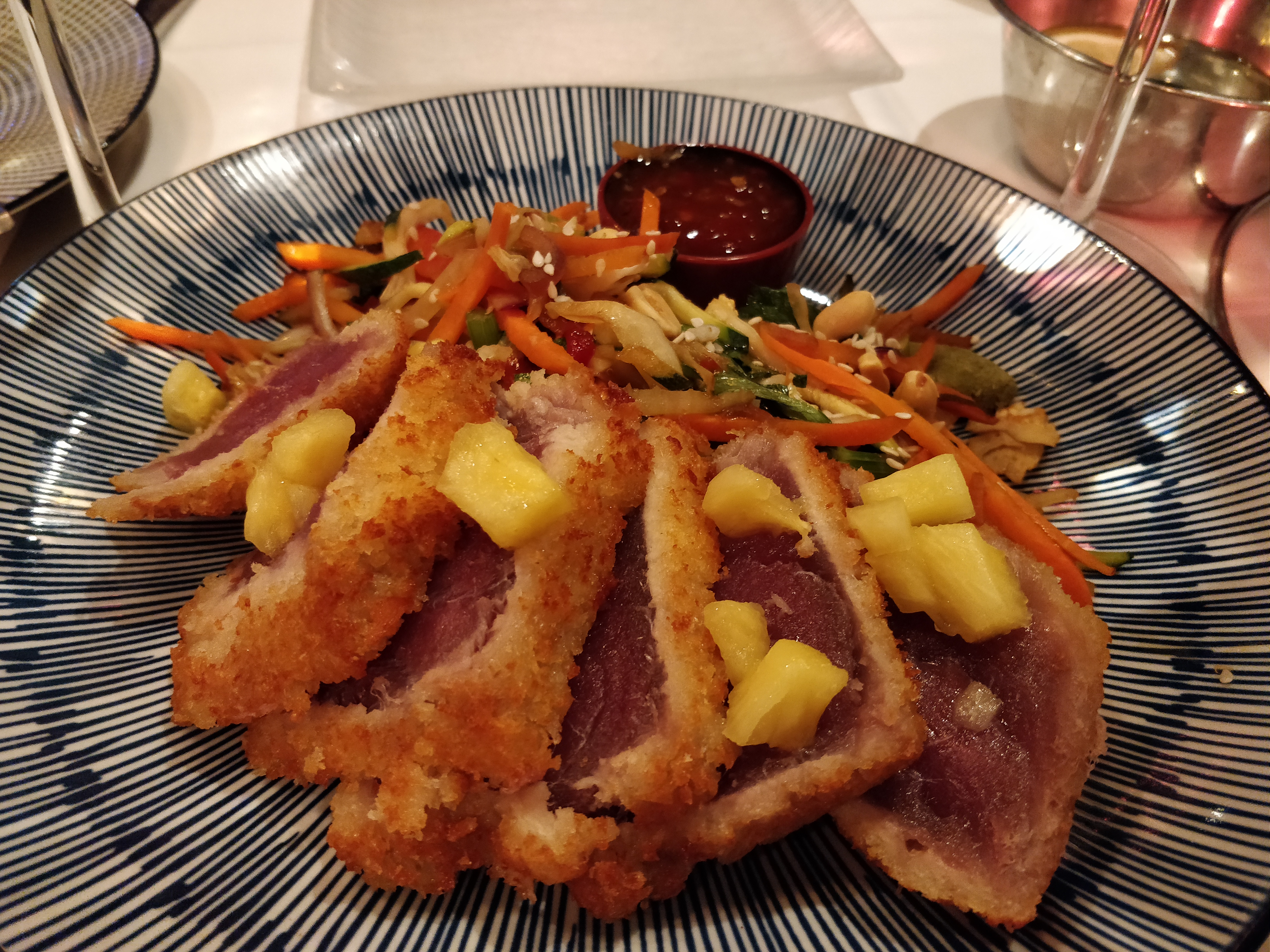 J'ai eu le thon croustillant comme plat du jour et la citronnade, c'était très bon. Un peu trop cher à mon avis. Les cocktails étaient à 15€ environ. Heureusement il y avait une proposition du midi.