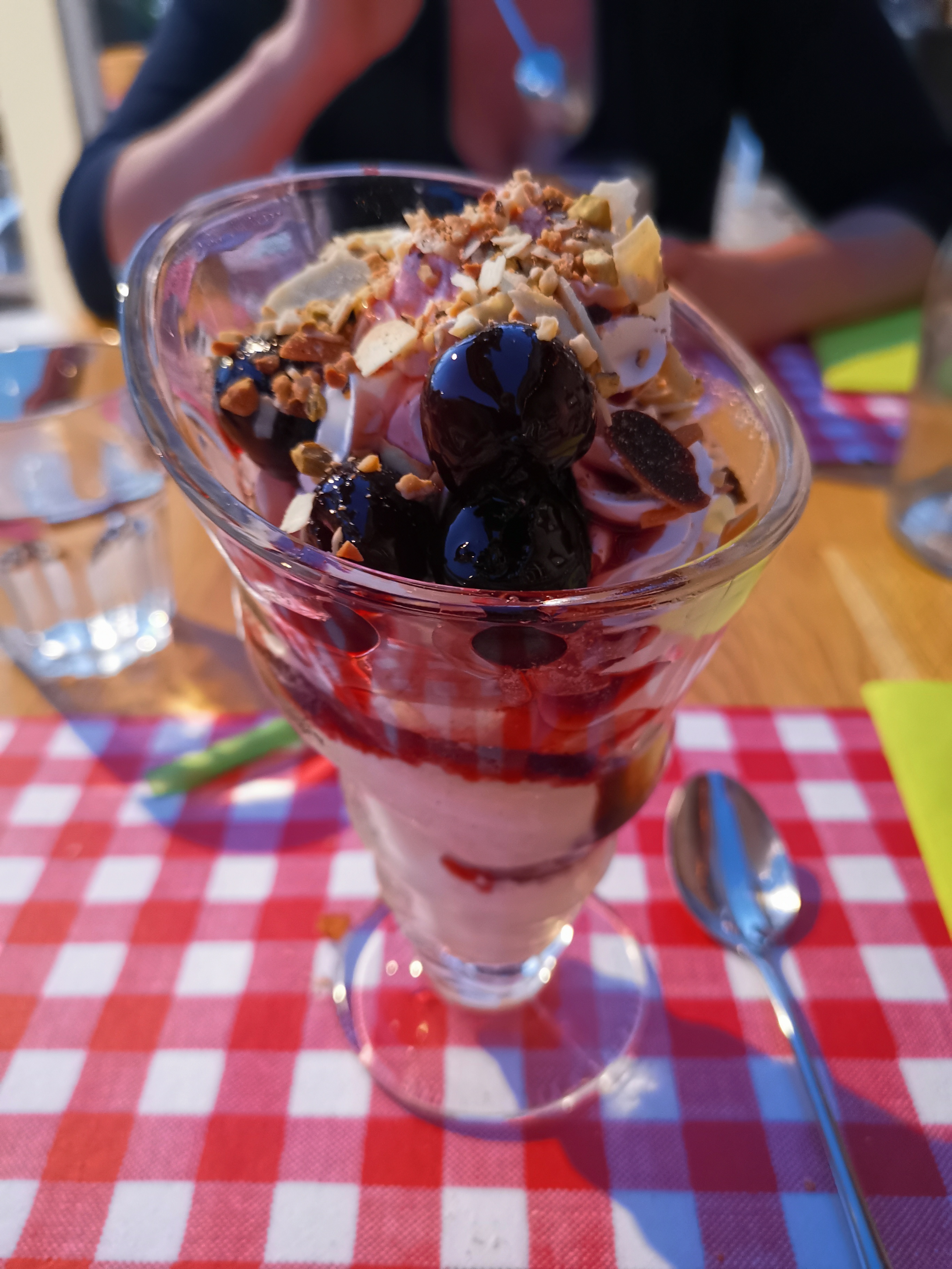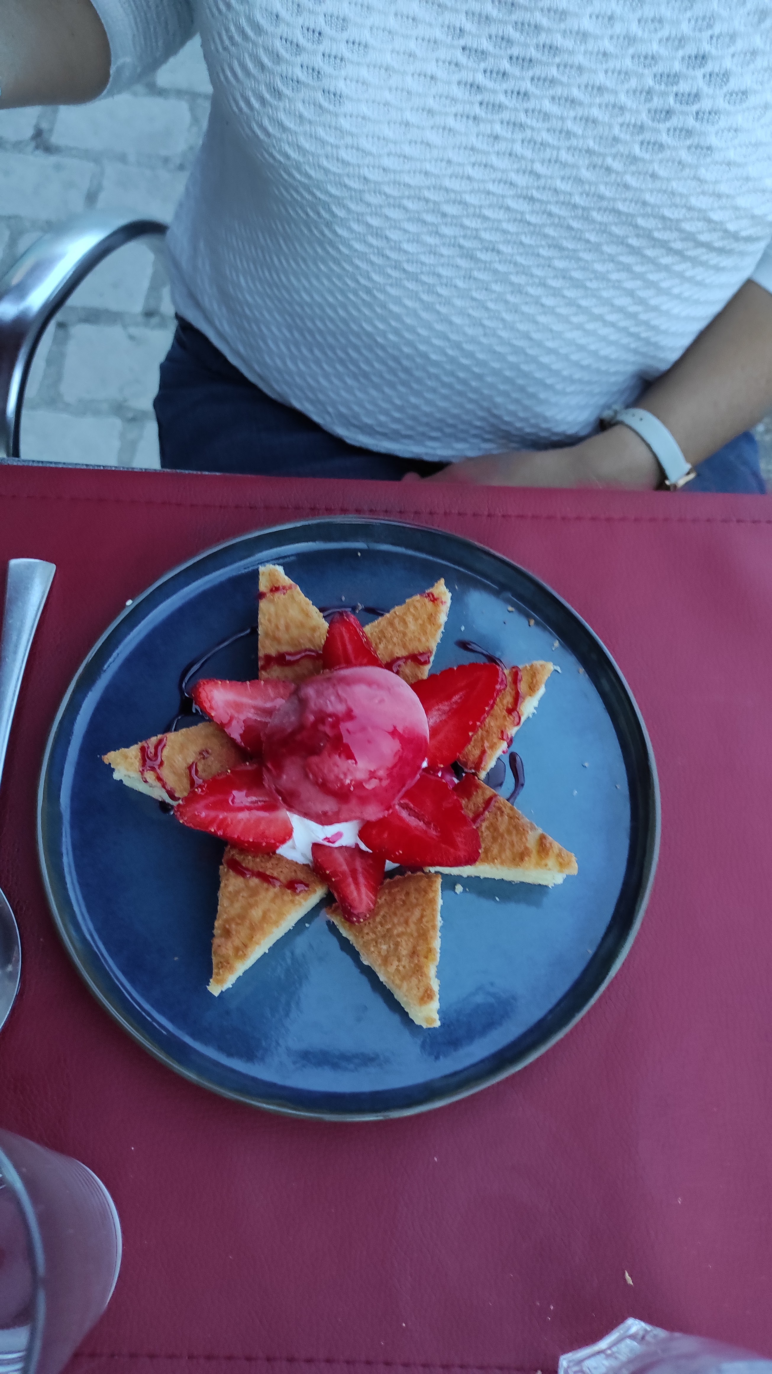 On a très bien mangé … une mention spéciale pour le dessert exceptionnel ! Le cadre avec le soleil de juillet en terrasse est super chouette même si on est un peu prêt de la route … mais on a passé un super bon moment entre amis
