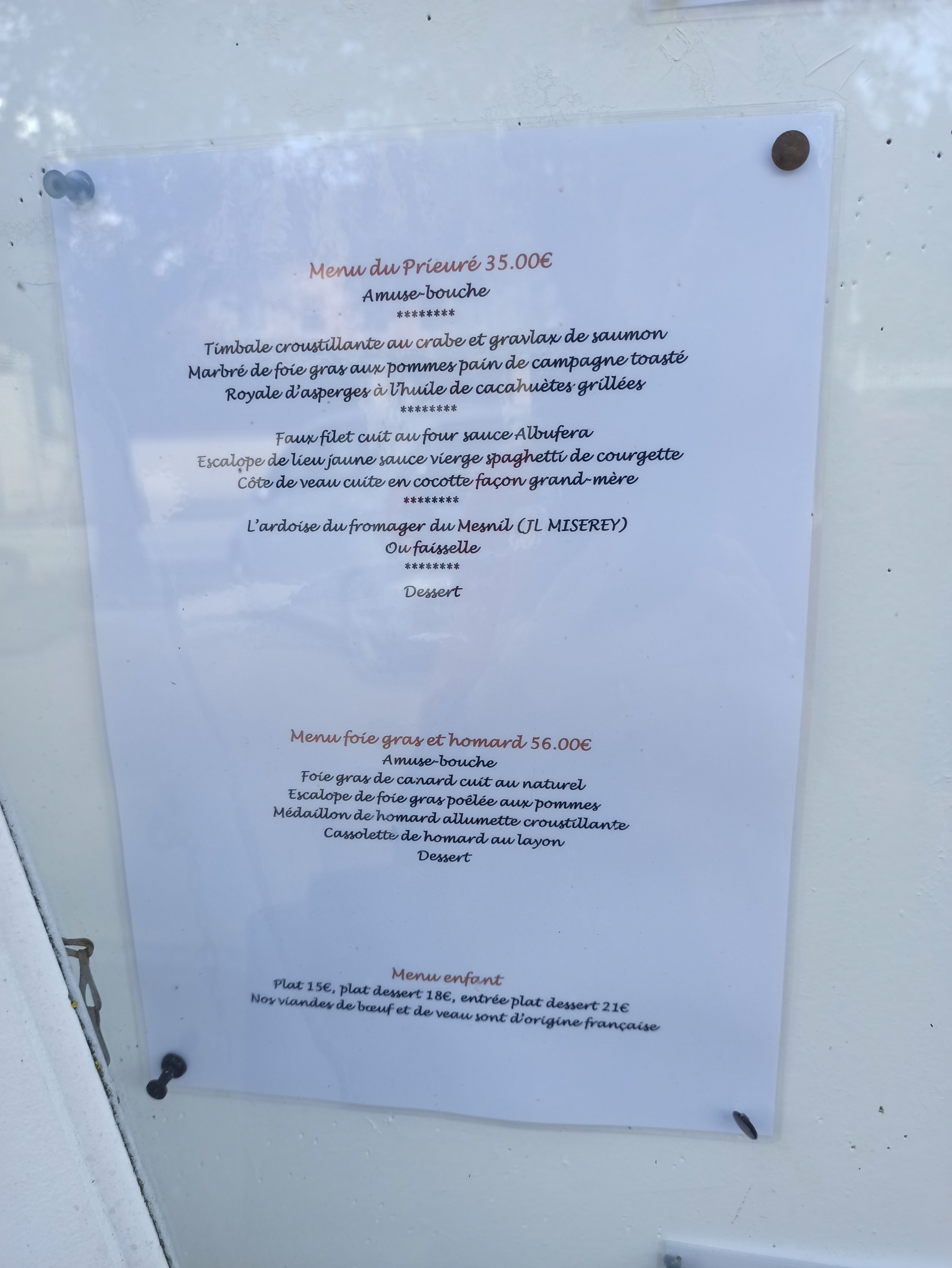 Après une balade en vélo, le déjeuner à L'auberge du Prieure Normand offre un menu généreux et délicat qui réconforte. Les produits sont frais, parfaitement associés. Service agréable à l'ombre sur la terrasse.