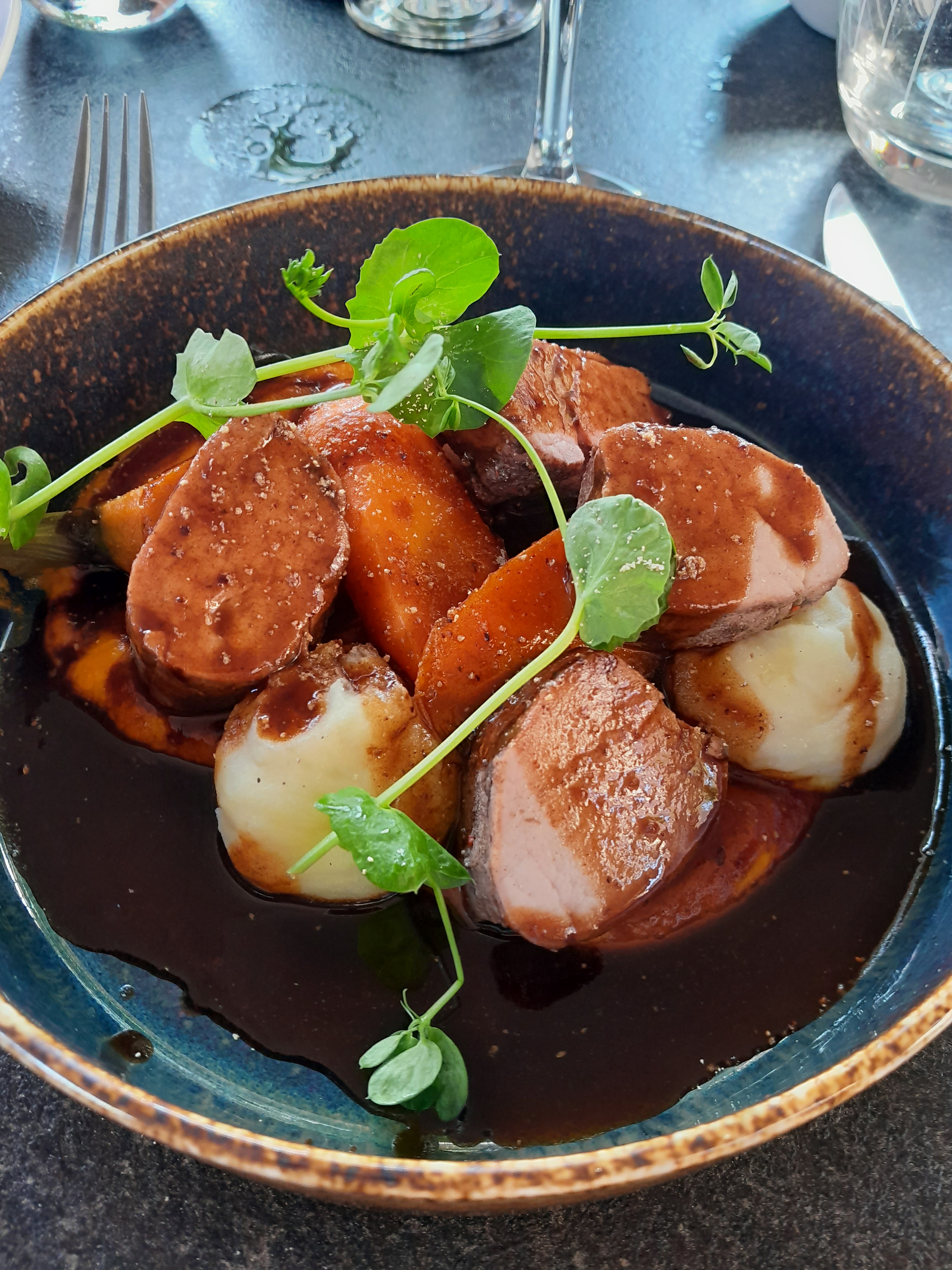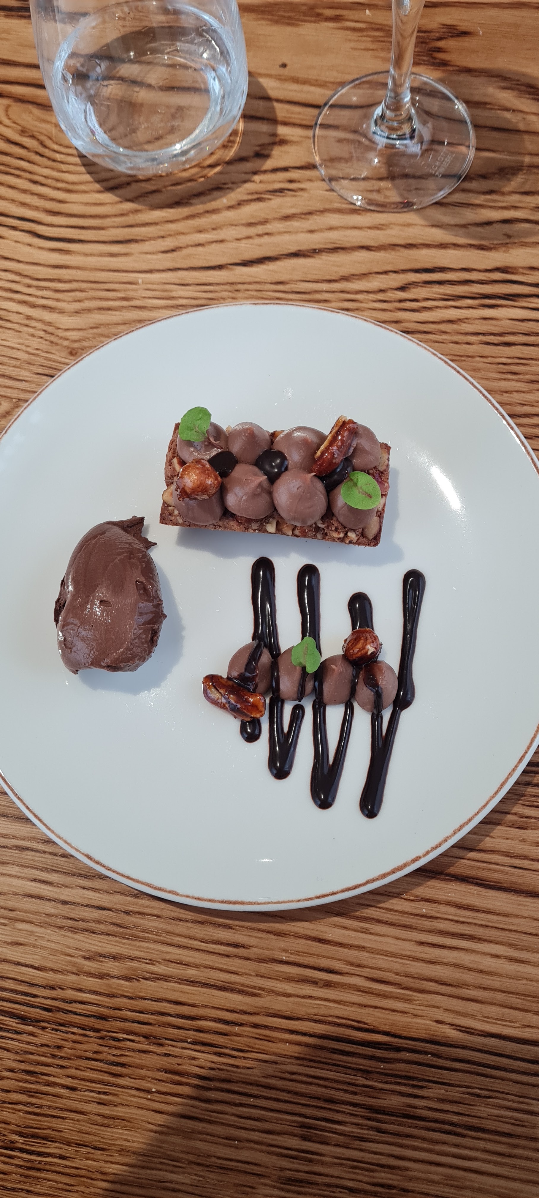 Juste un régale qui se passe commentaire . Veau mi cuit en entrée fondant et léger Filet de bœuf avec pomme de terre grenaille à tomber à la renverse . Et brownie maison avec sont sorbet chocolat tout simplement parfait .