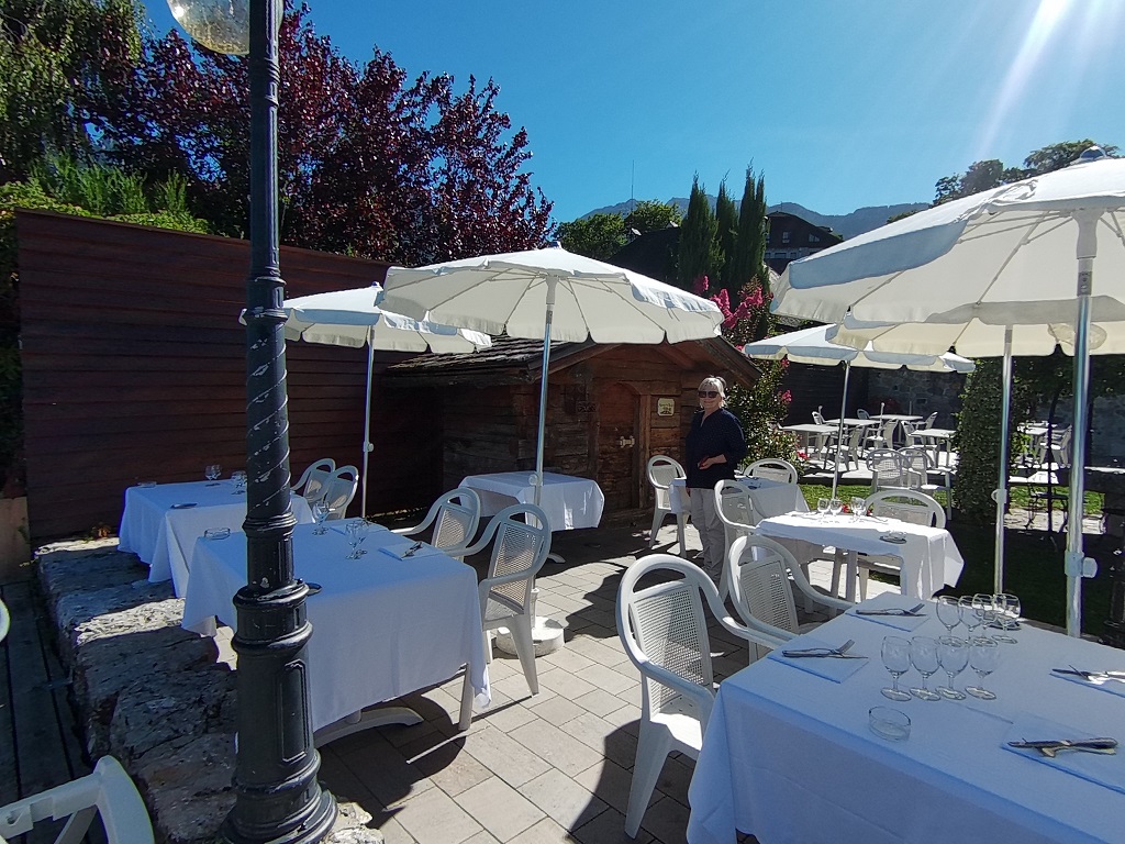 Superbe vue entre les montagnes et le lac très bon restaurant produits de qualité et copieux Personnel sympathique et efficace ! Très smart ! Nappe blanches et serviettes en tissu ! De plus en plus rare !