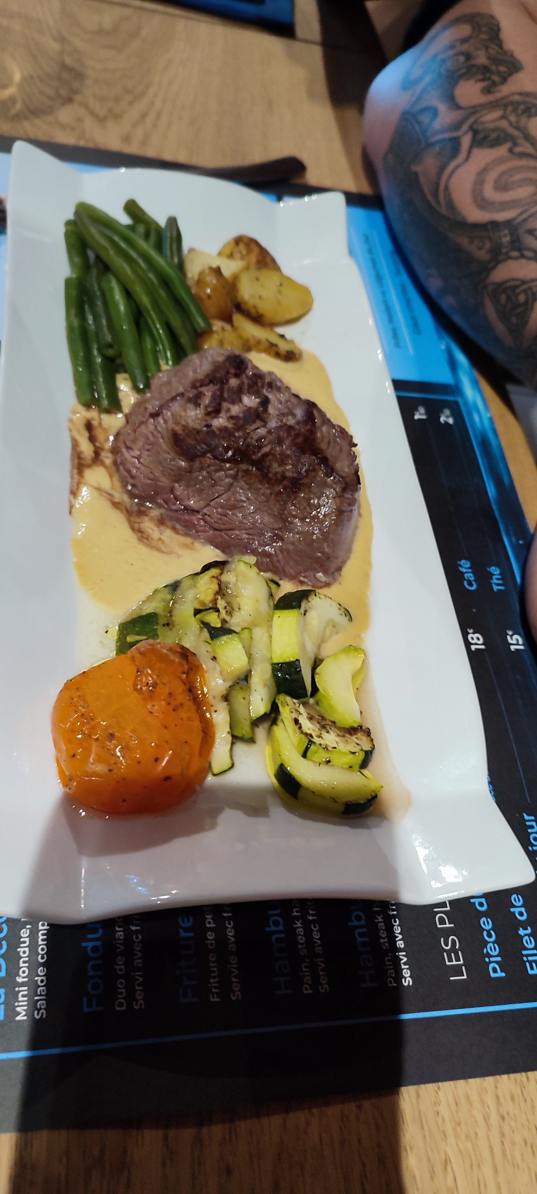 Accueil patron pas vraiment agréable.Pire qu'à la cafétéria aperitif entrée plat servi en trente minutes. Entrée ravioles très peu dans le ramequin, plat 6 haricots trois courgettes une petite tomate, dommage car la viande était bonne. Nous ne reviendrons pas.