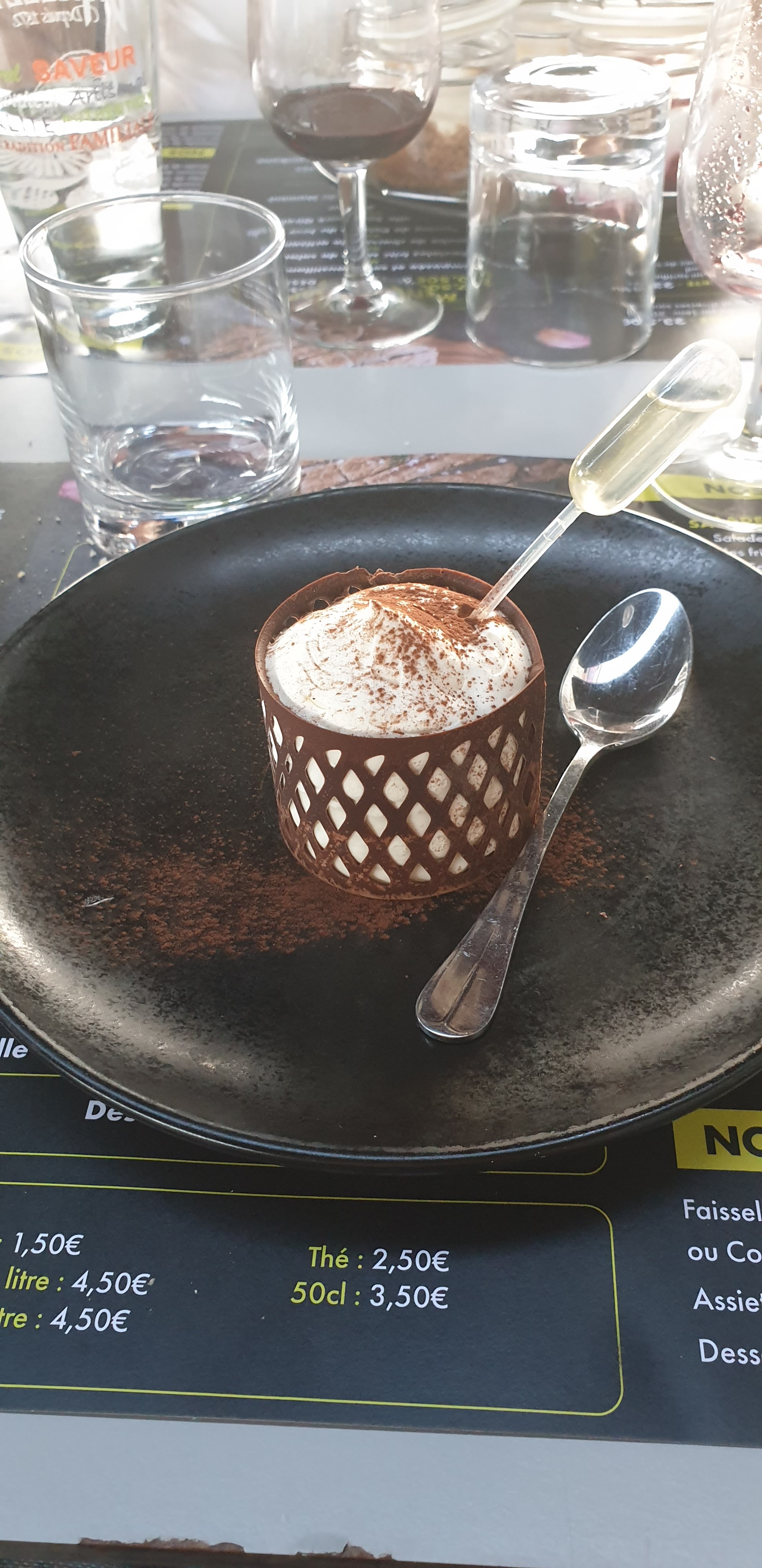 La carte des vins est le top. En toute logique, ils sont chers. Ce ne sont pas des vins pour éponger les grandes soifs...mais pour accompagner un bon plat. Les plats chauds: non, on ne part pas en ayant faim. C'est simple mais très bon et frais. Les desserts: le tiramisu est un doux plaisir gustatif. La mousse au chocolat avec une belle note de café corsé aussi. L'accueil du patron: il est dommage de retenir sa froideur qui semble plutôt de la réserve et du stress. Pas besoin de ronds de jambe et de sourires d'automate, ce qui compte c' est le contenu et la qualité des plats proposés. Si ça ne va pas: huit jours sous une benne. Je vous fais grâce de ne pas l' écrire en patois de Saint-Genest-Malifaux.