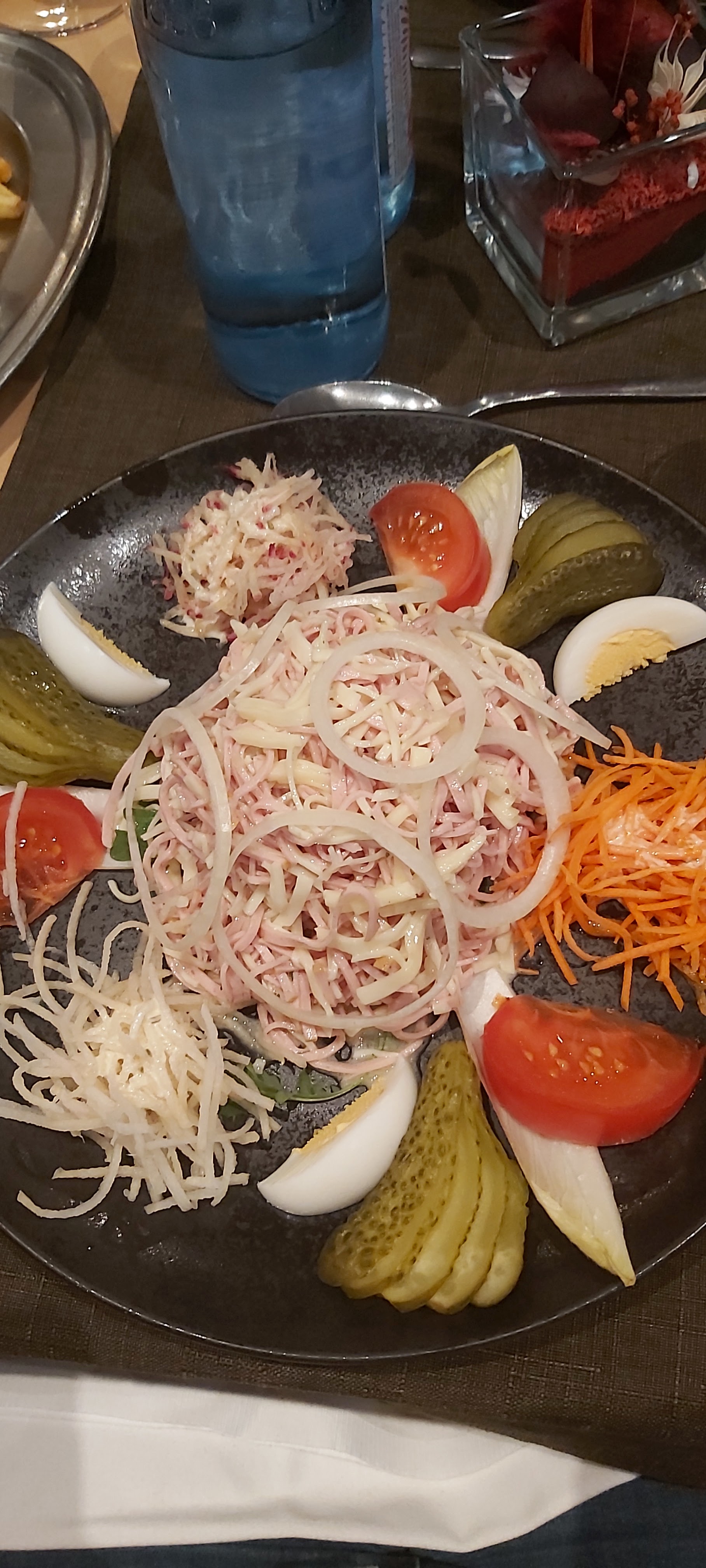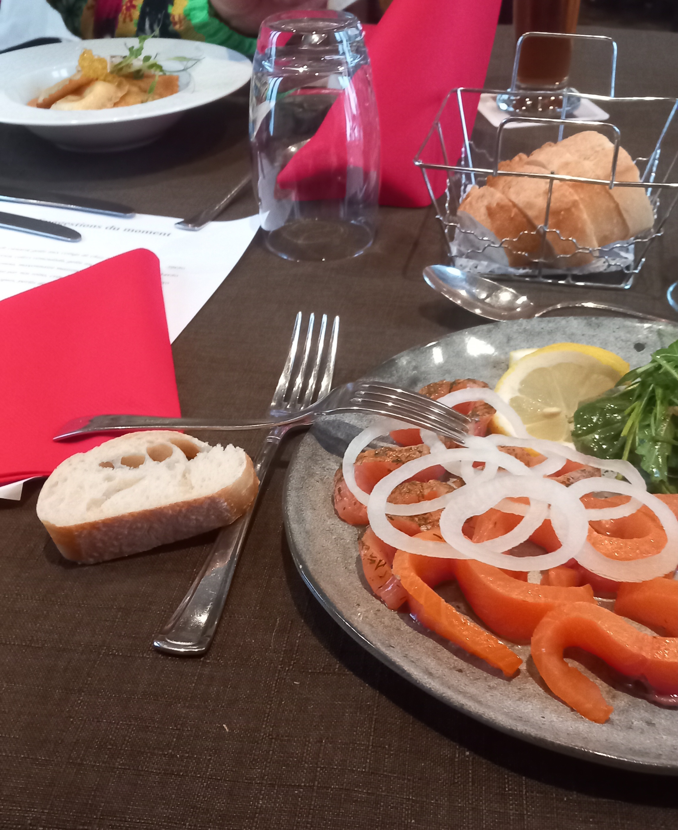 très beau restaurant mais suis déçue du plat du jour. le menu était salade de thon composé donc je m,attendais à avoir tomate oeuf comcombre et thon, sauf qu,on ma servie une assiette de coquillette en entré avec un peu de tomate olives et thon. seulement voila en plat principal j,avais pris spaguetti bolognaise. donc quand j,ai vu mon entré je ne l,ai pas mangé, ils n,aurait pas du faire des pâtes en entré vu qu,après c,était spaguetti bolognaise. sinon le dessert était très très bon une salade de fruit frais.
