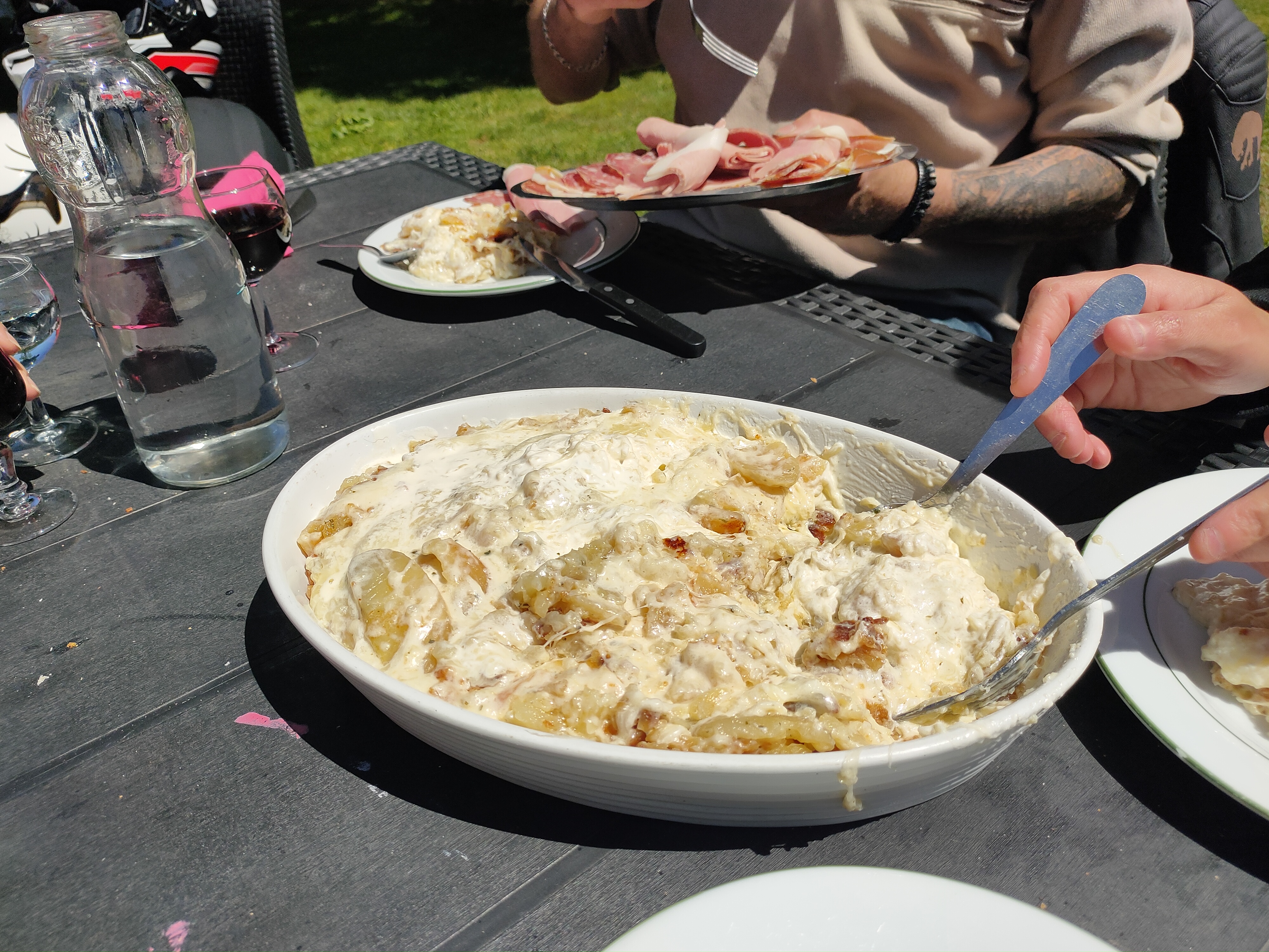 Un saladier pour 6 de patates cuites à l'eau et légèrement revenues avec à peine de fromage , un saladier de salade et un petit plat (20cm x 10 cm) de charcuterie servie glacée avec quelques rondelles de saucisson empilé sur du jambon roulé empilés sur des tranches de jambon de pays qui ne sont même pas sèches !! Avec un arrière-goût de frigo .... Le pain était rassis.. Le seul point fort de cet établissement c'est l'authenticité du bâtiment, la cheminée,la déco d'un autre temps et sa situation géographique.