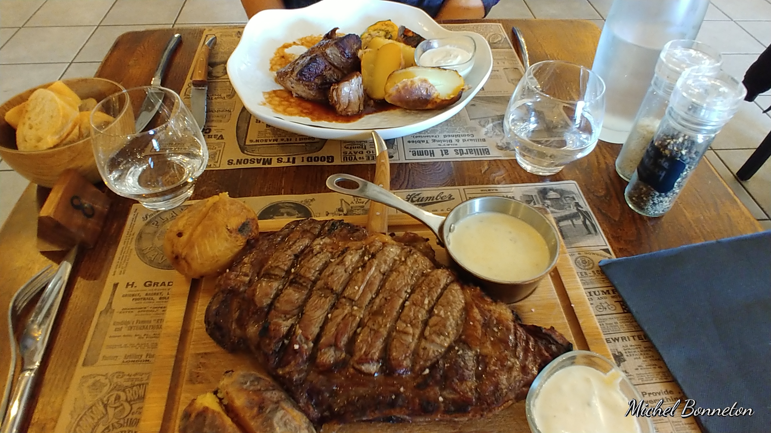 Quasi 120€ pour deux: 2 apéros, un amuse bouche insipide à partager et une côte de boeuf (probablement congelée). Cuisine médiocre, quantités de schtroumpfs, et qualité de super-marché.