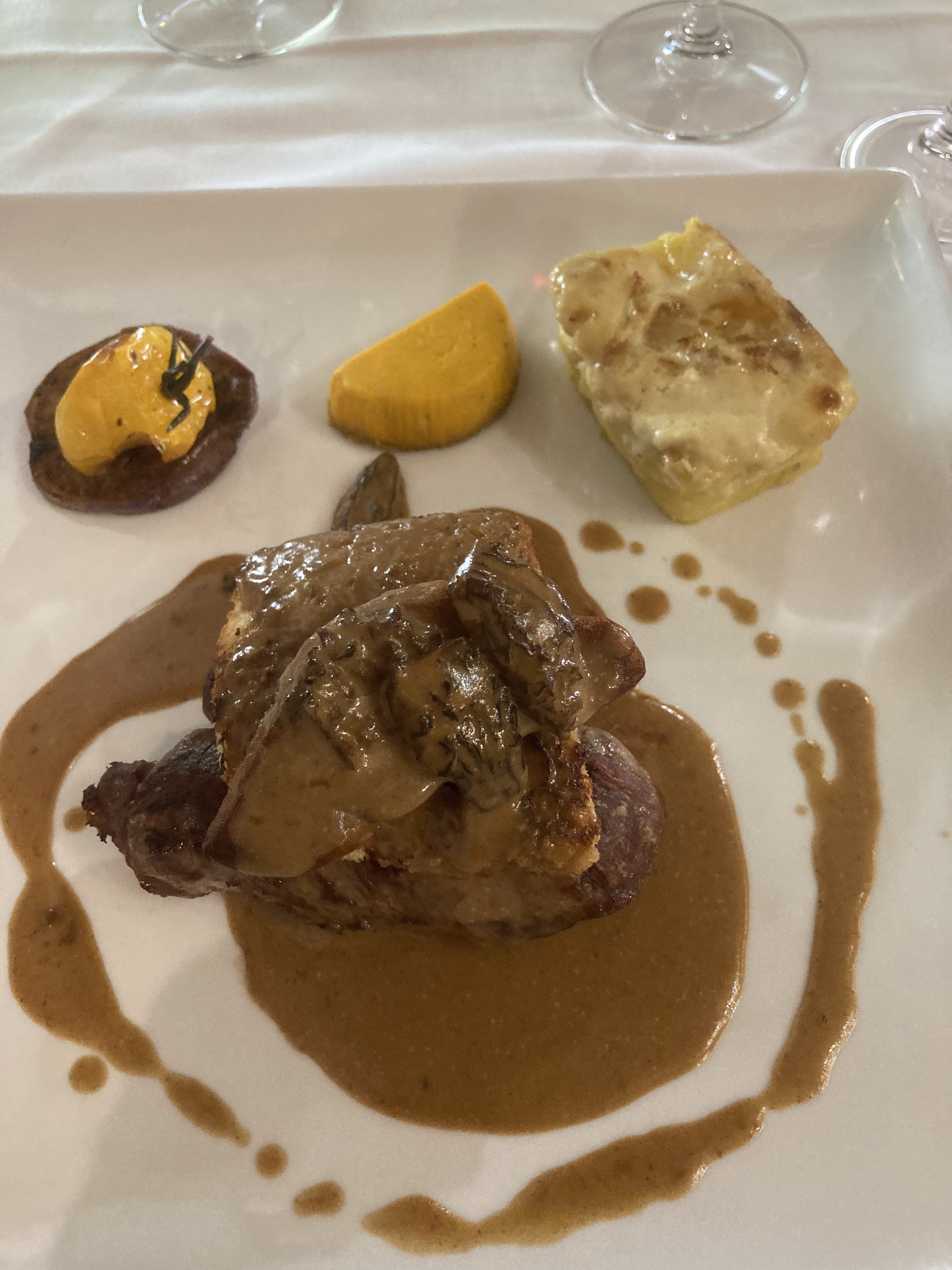 Très bons vins et repas. Filet de bœuf avec un petit goût grillé, parfait. Mentions spéciales pour les desserts du chef et la tarte tatin ! Personnel agréable et souriant, qui recommande les viandes et les vins. Super soirée, merci et bravo !