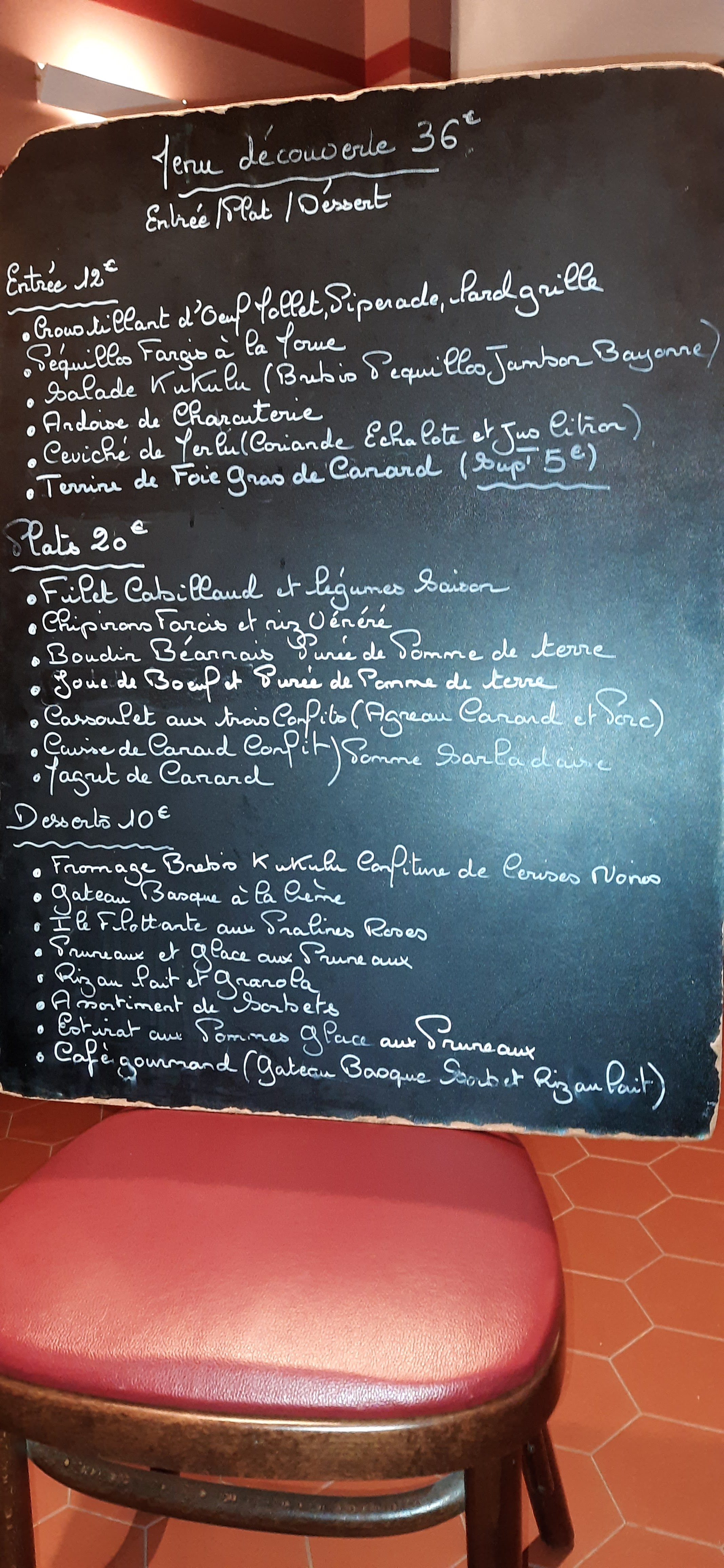 J'adore l'ambiance. L'accueil est chaleureux et sympathique. Les desserts sont excellents en particulier le dessert à l a pomme avec la glace Pruneau. Un voyage au pays basque dans un coin reculé en plein Paris. Parfait.