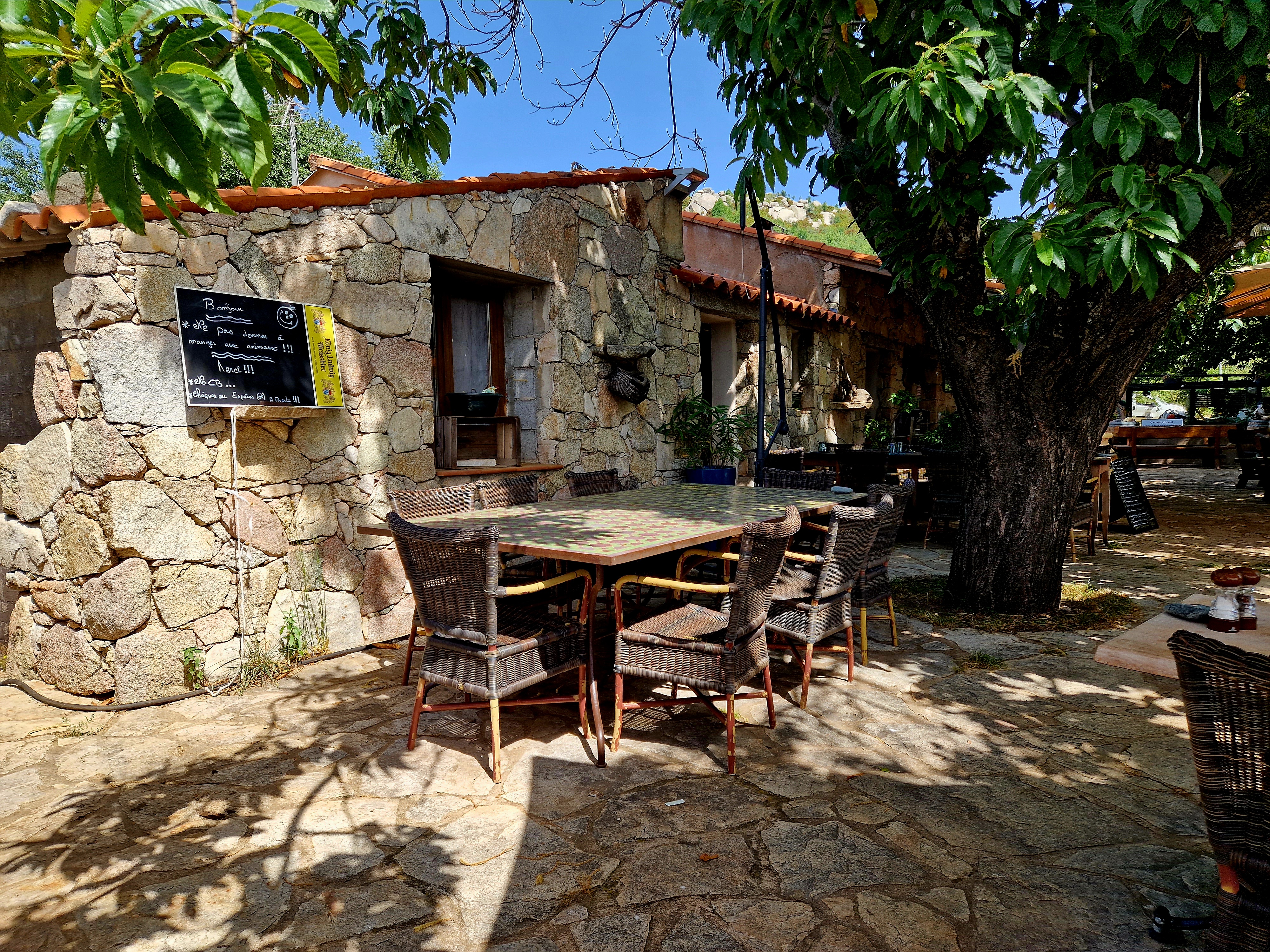 C'est une adresse qui se mérite, une (route) qui se transforme en piste très vite. Une fois arrivé, vous êtes accueilli par une famille adorable. Cuisine avec les produits de la ferme, simple mais d'une efficacité redoutable. Paysages magnifiques, vous dejeunerez à l'ombre des châtaigniers. Une excellente adresse pour ceux qui recherchent l'authenticité et la vraie charcuterie Corse. Je recommande aussi pour la vente en direct des produits de la ferme.
