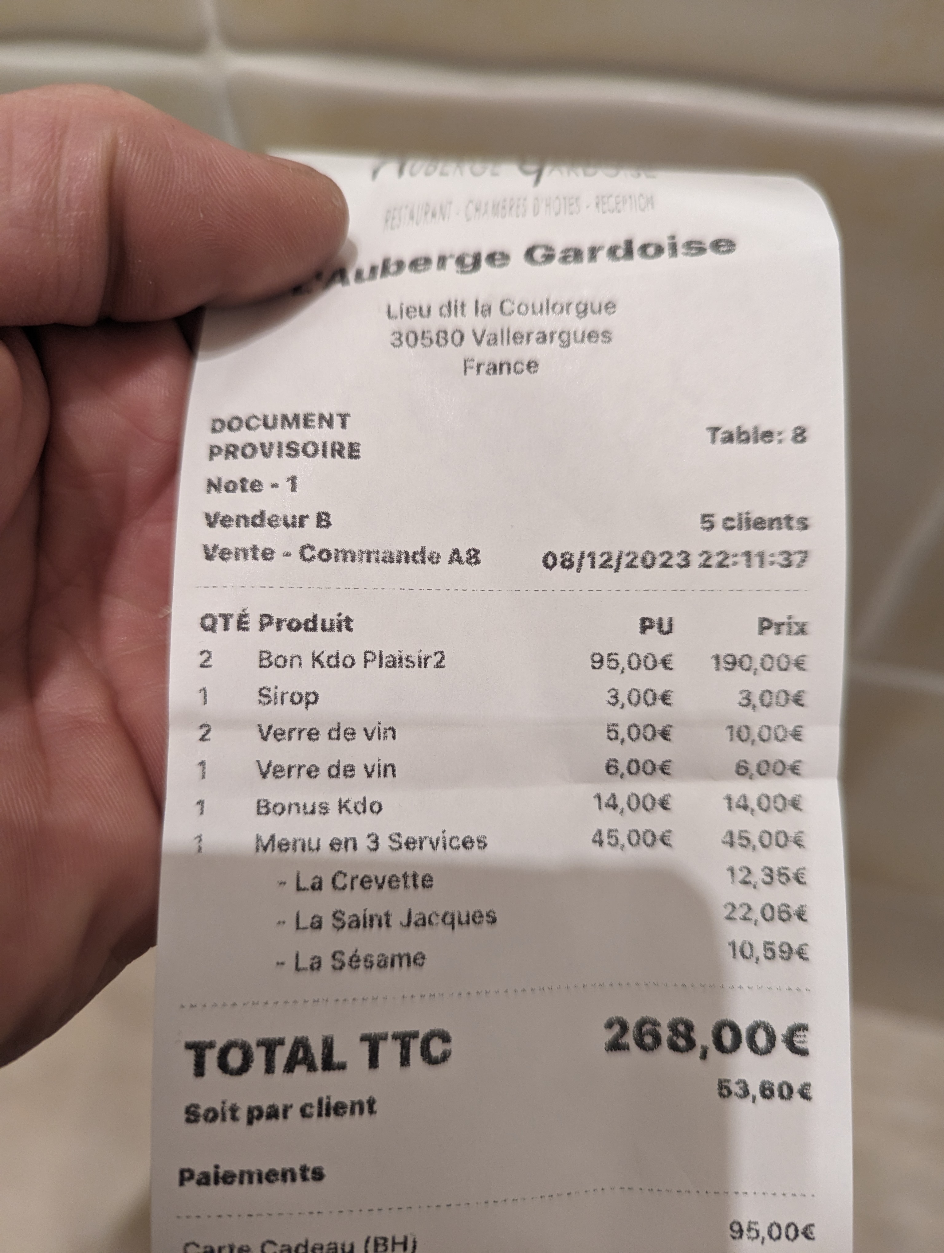 Excellente soirée passée à l’auberge Gardoise. Entrée plat dessert rien à dire , excellent. Merci au personnel. On reviendra . A conseiller.