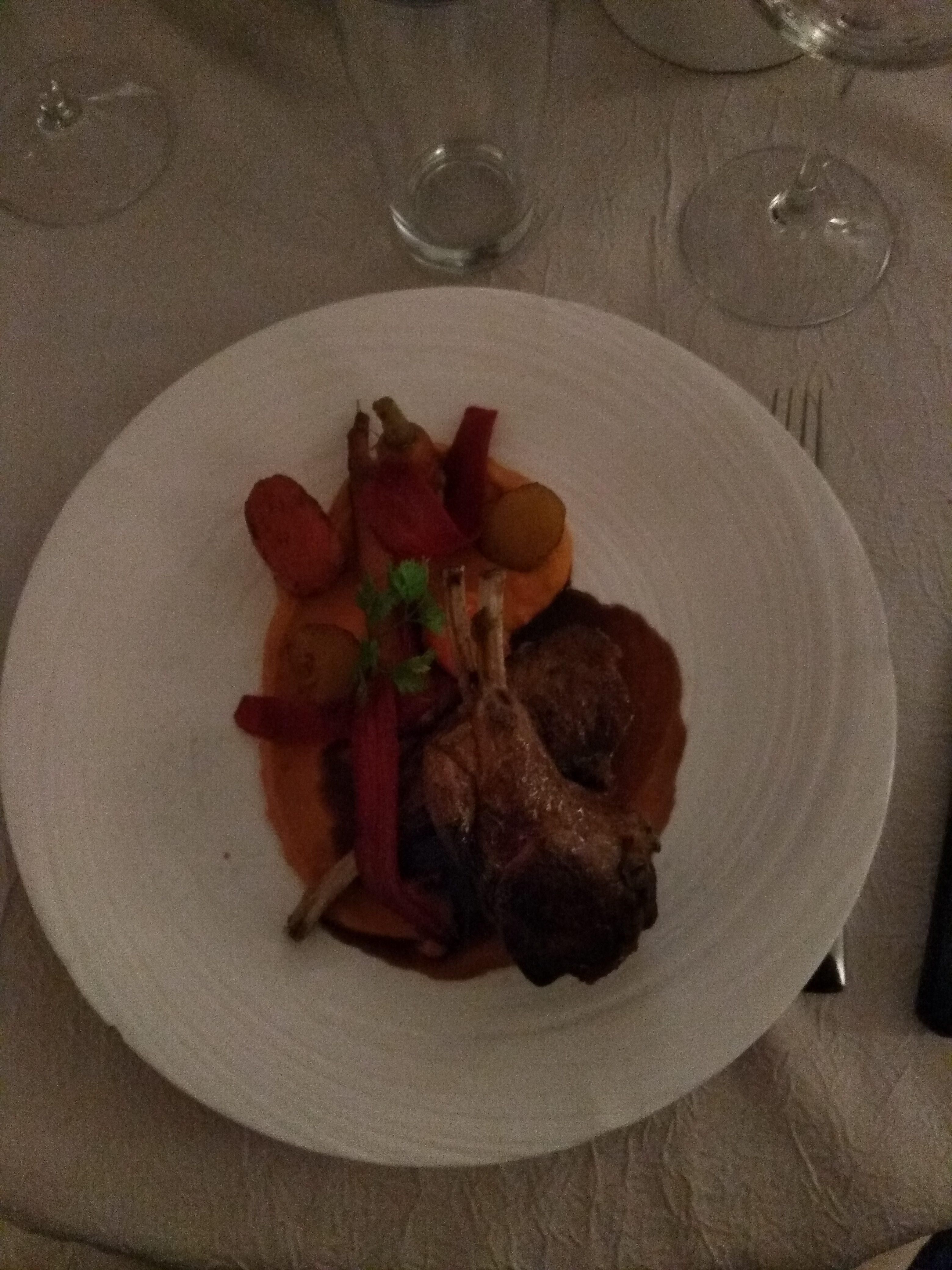 En bref : Très bon mais quelques lacunes qui coûtent 1 étoile sur les 5). Nous nous sommes arrêtés par hasard, peu engageant au premier abord sur ce rond-point. Après avoir trouvé l'entrée (on avait l'impression que c'était fermé) nous avons découvert une jolie terrasse au bord d'un grand et beau parc sur l'arrière. Bon accueil et bon service assez rapide. Le choix est assez limité et les menus un peu complexes selon que l'on souhaite boissons, apéritif, sauce, option supplément ou pas, mais nous avons très bien mangé. Les couteaux étaient un peu trop cuits donc un peu caoutchouteux mais bien assaisonnés, le paleron Excellent, mais accompagnés de petits légumes, fort savoureux mais en QUANTITE ULTRA REDUITE (voir photo), je croyais que c'était la décoration ! Le serveur m'a confirmé qu'il n'y en avait pas d'autres servis à part... Encouragements à lui, de bonne volonté, mais encore bien jeune, en formation sans doute. MINI dessert aussi, tout aussi bien présenté et assez bon, mais MINIATURE. Heureusement que nous avons pris un fromage (avec supplément 6 euros). A ce prix (menu à 48, addition 111 euros pour 2) Apéritif, entrée plat, dessert, 1/ Btle de vin, café 3€, on aurait pu avoir le fromage compris. Pas de choix de fromage (unique chèvre sec Pélardon même pas le choix d'en avoir un frais) servi avec de la salade de mâche (ouf! des légumes) et une confiture de fraises (dans la région, on aurait préféré une figue confite ou une confiture de figues, sans doute plus en accord (chacun ses goûts) avec ce bon fromage.