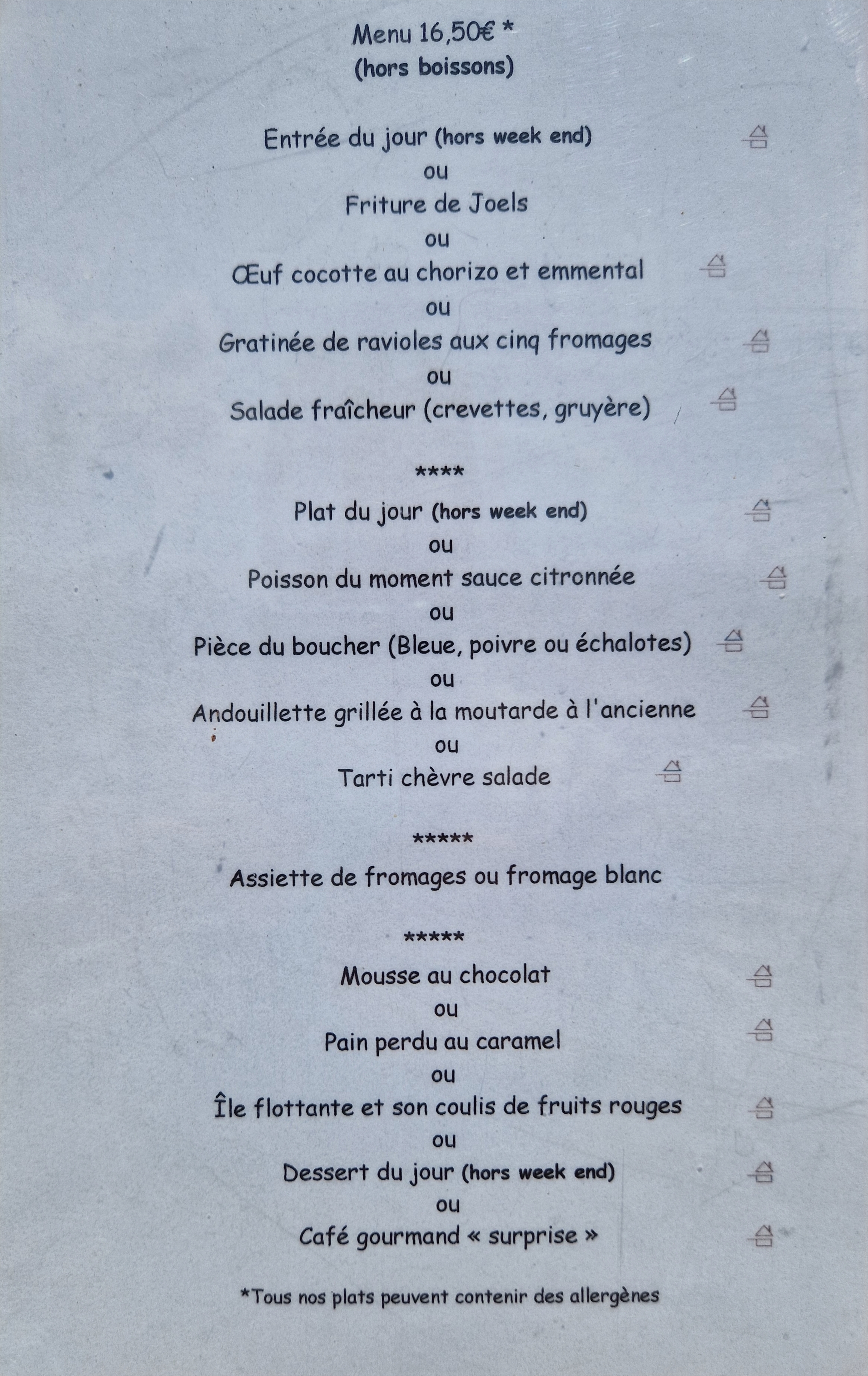 Bonjour Je suis venu déjeuner dans votre établissement sur le conseil de Dominique et Bruno et nous avons passé un très bon moment , personnels gentils et souriant. Prix du menu choisis 16,50 euros, nous nous sommes régalés Une entrée, un plat, une assiette de fromage et un dessert. Quand je vois votre établissement beaucoup de vos confrères devraient prendre exemple sur vous. Je reviendrai pour tester l'autre menus et je ne manquerai pas de réserver avant de venir 😉😊
