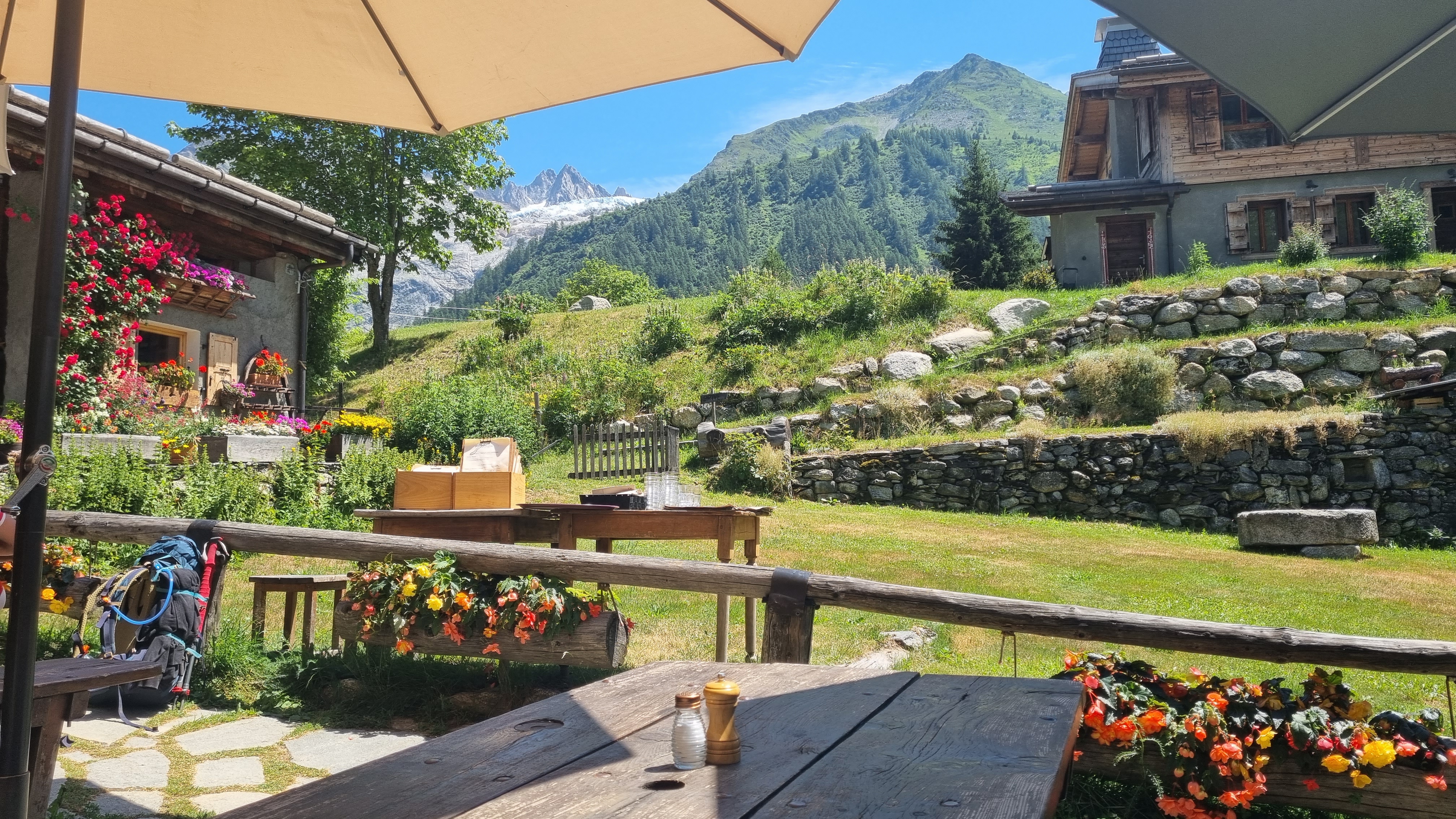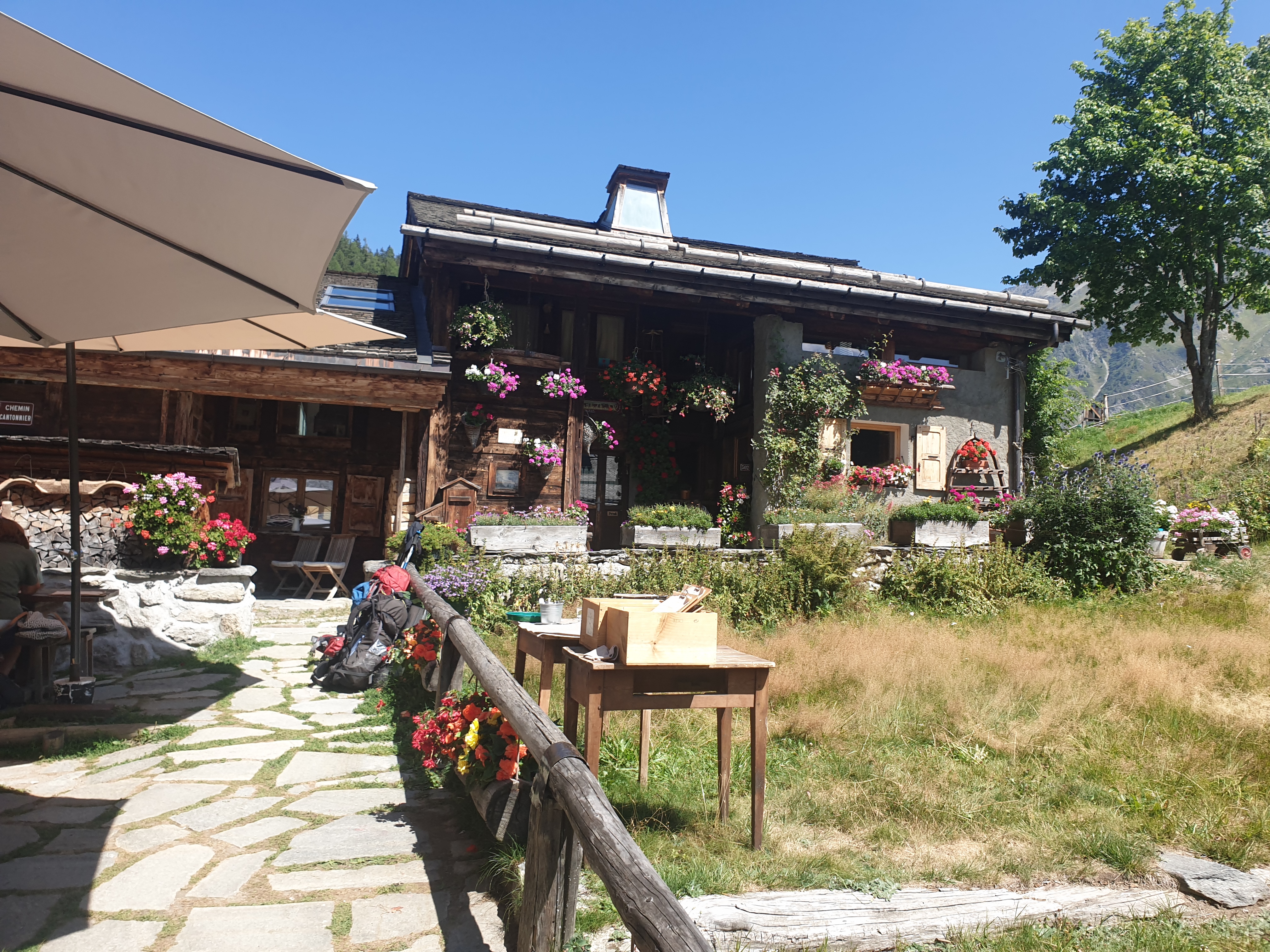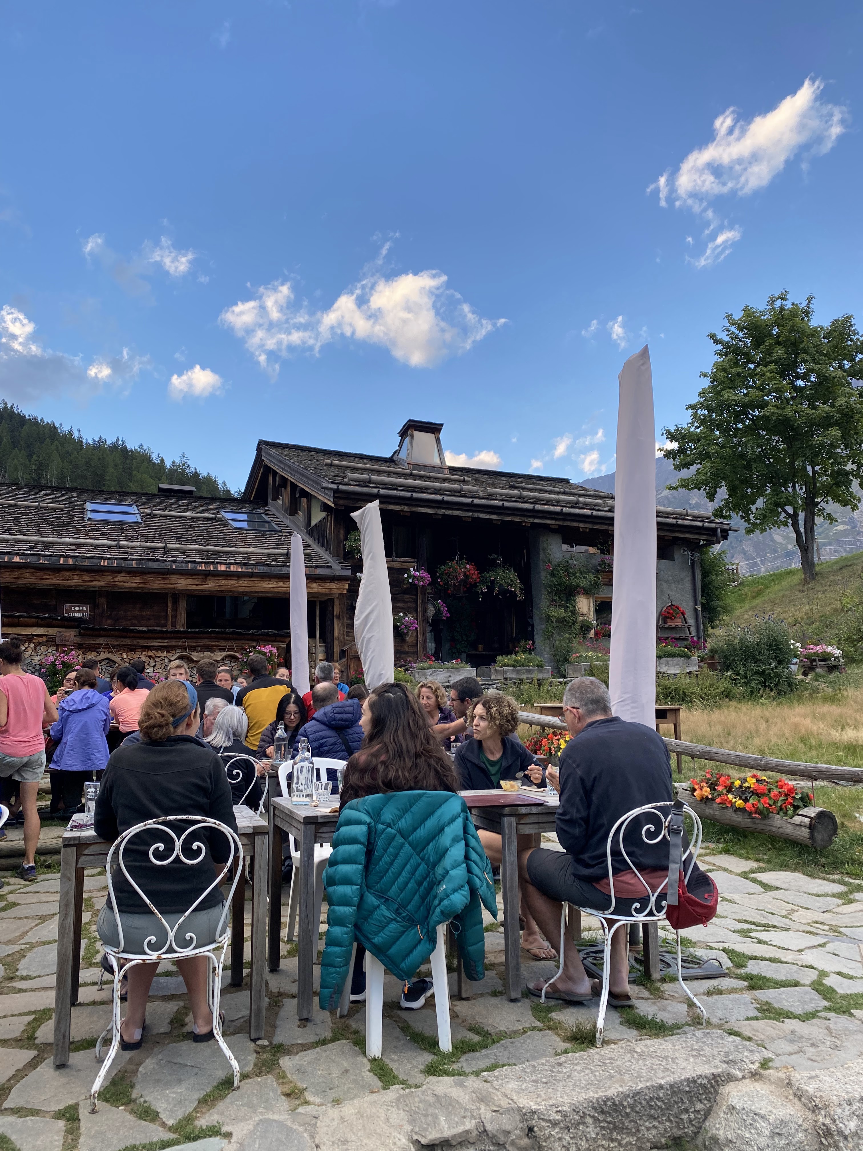 Nous y avons mangé le midi étant sur le trajet du TMB, tartiflette très bonne et terrasse agréable, bien fleurie.