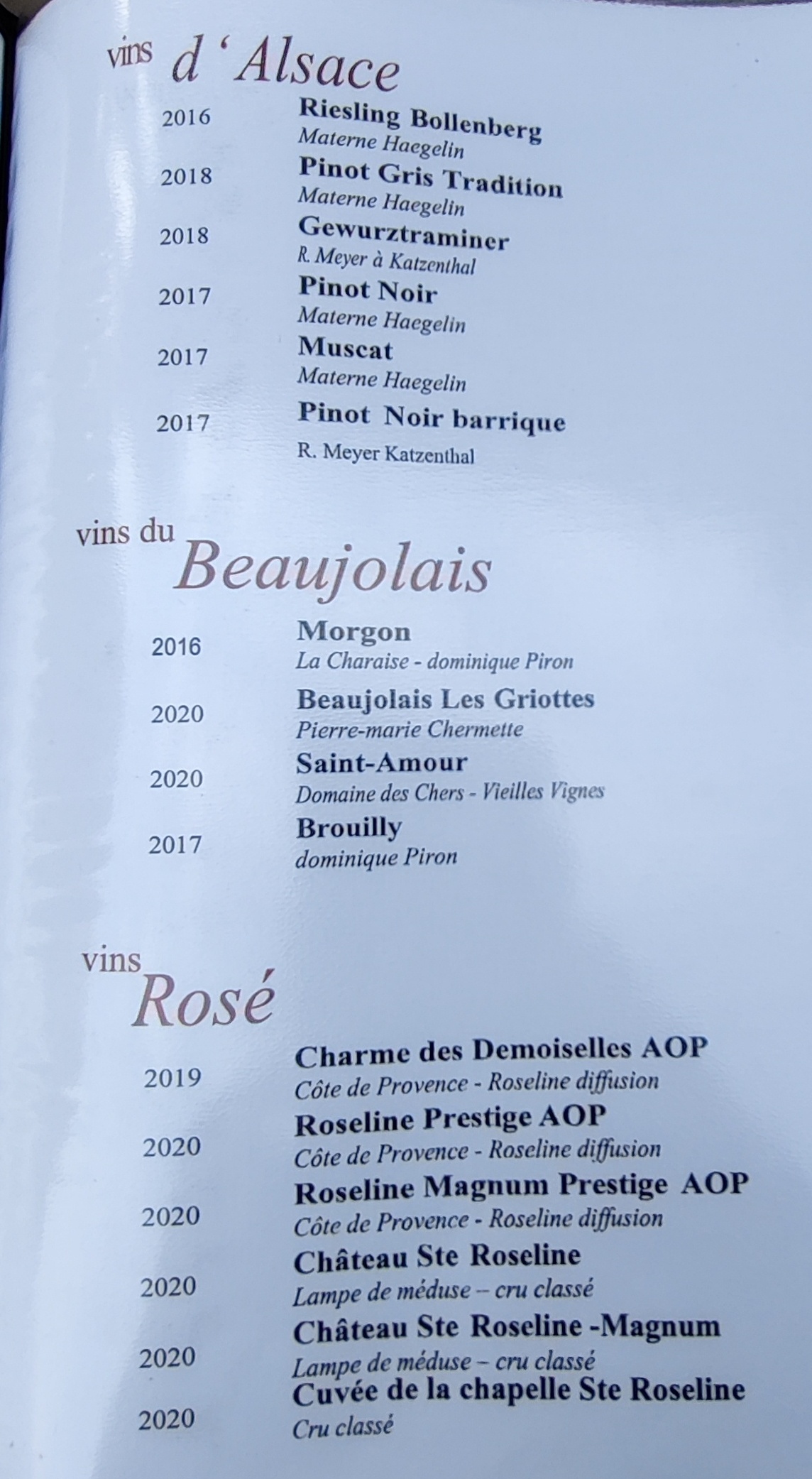 J y ai mangé vendredi soir ont n a pris brasserade aux 3viandes avec frites et salade et une bonne bouteille de vin a 56eur l addition pour 150eur à 2personnes rien n a dire service impeccable et le repas très bon belle soirée côté restaurant rien n a dire par contre pour clôre cette soirée j' ai eu la mauvaise idée de vouloir boire un dernier verre sur la terrasse donc je vais au bar et je demande une despe et un expresso et une dame au bar un peu âgée ou proche de la retraite me dit d un ton agressif nous ont n a pas ça chez nous despe donc je lui demande une 1664 a la pression encore d un ton agressif le fût est vide finalement je prend un verre de vendange tardive donc bonne soirée mais gâché par l agressivité de cette personne qui je pense devrais ce remettre en cause par rapport de comme ont parle aux clients donc un conseil le restaurant je recommande mais le bar a évité surtout en fin de soirée quand la dame âgée est fatigué