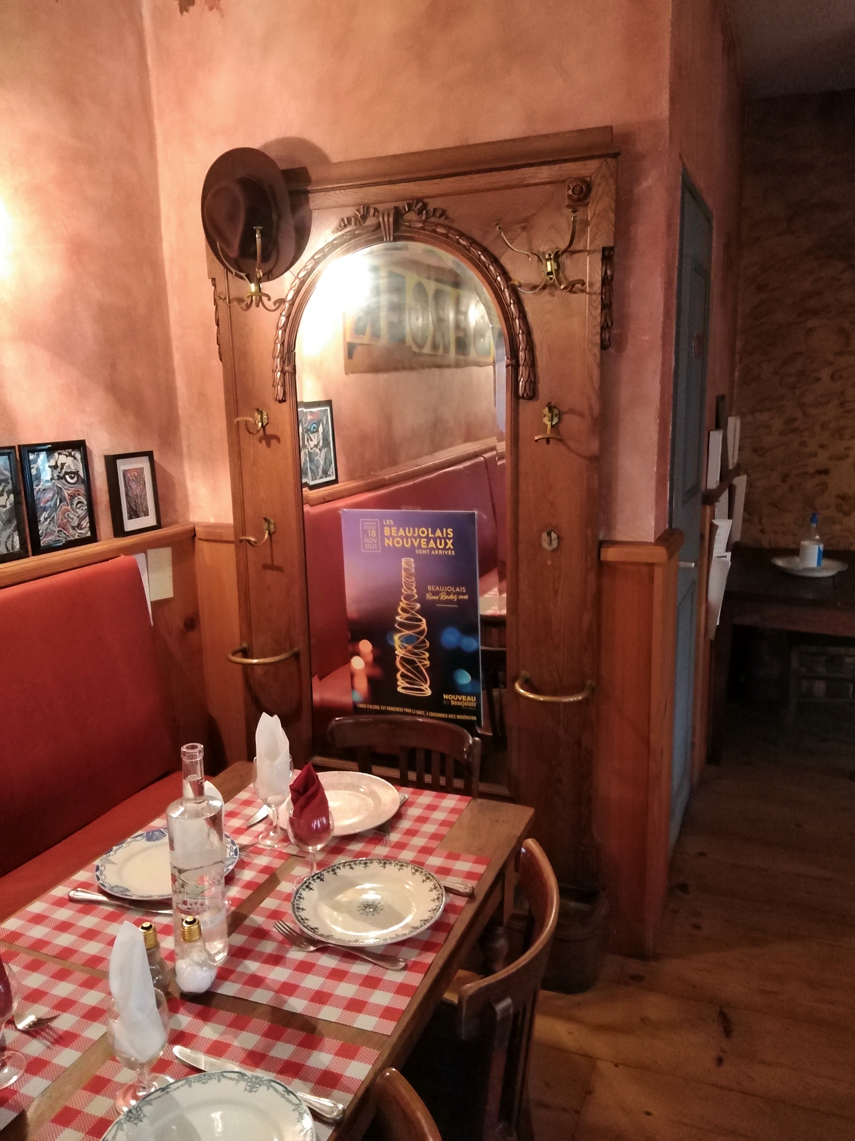 Lieu fort sympathique,terrasse extérieure ombragée,avec de belles et grandes tables en bois style campagne , la salle intérieure très bien décoré style rétro , la cuisine familiale et avec de très très bon produits du coin .... La petite serveuse est très agréable et papote bien . De plus village très caractéristique du coin ( beaujolais)