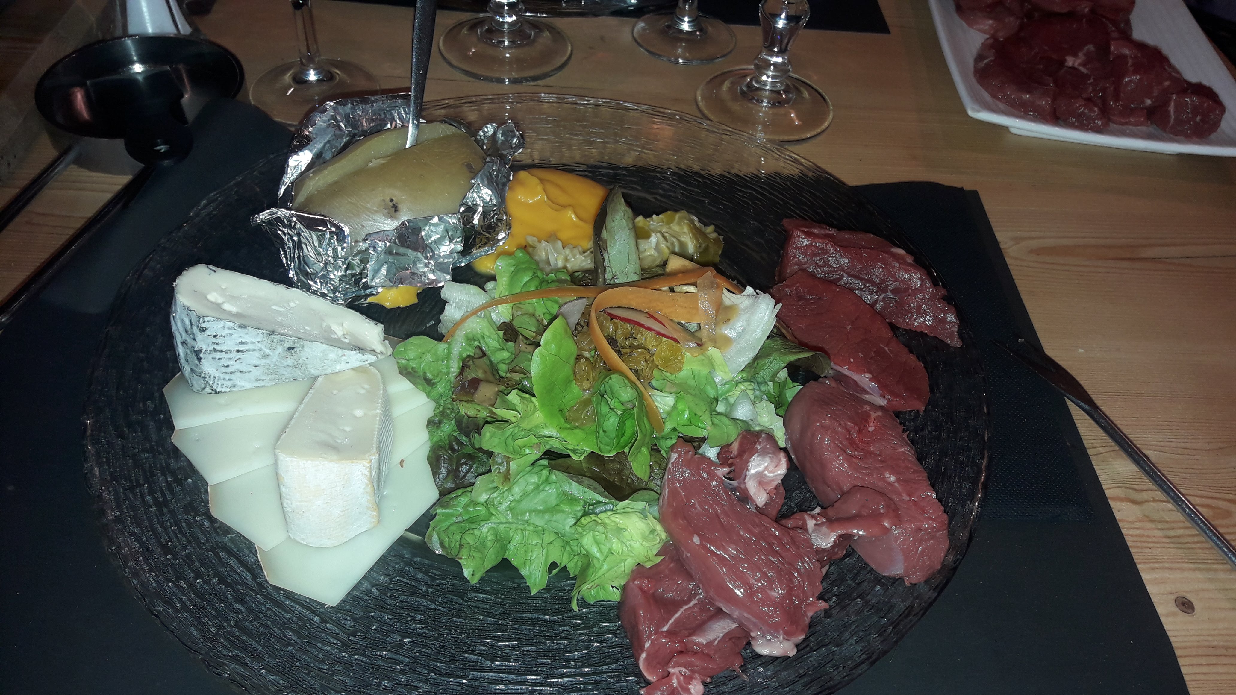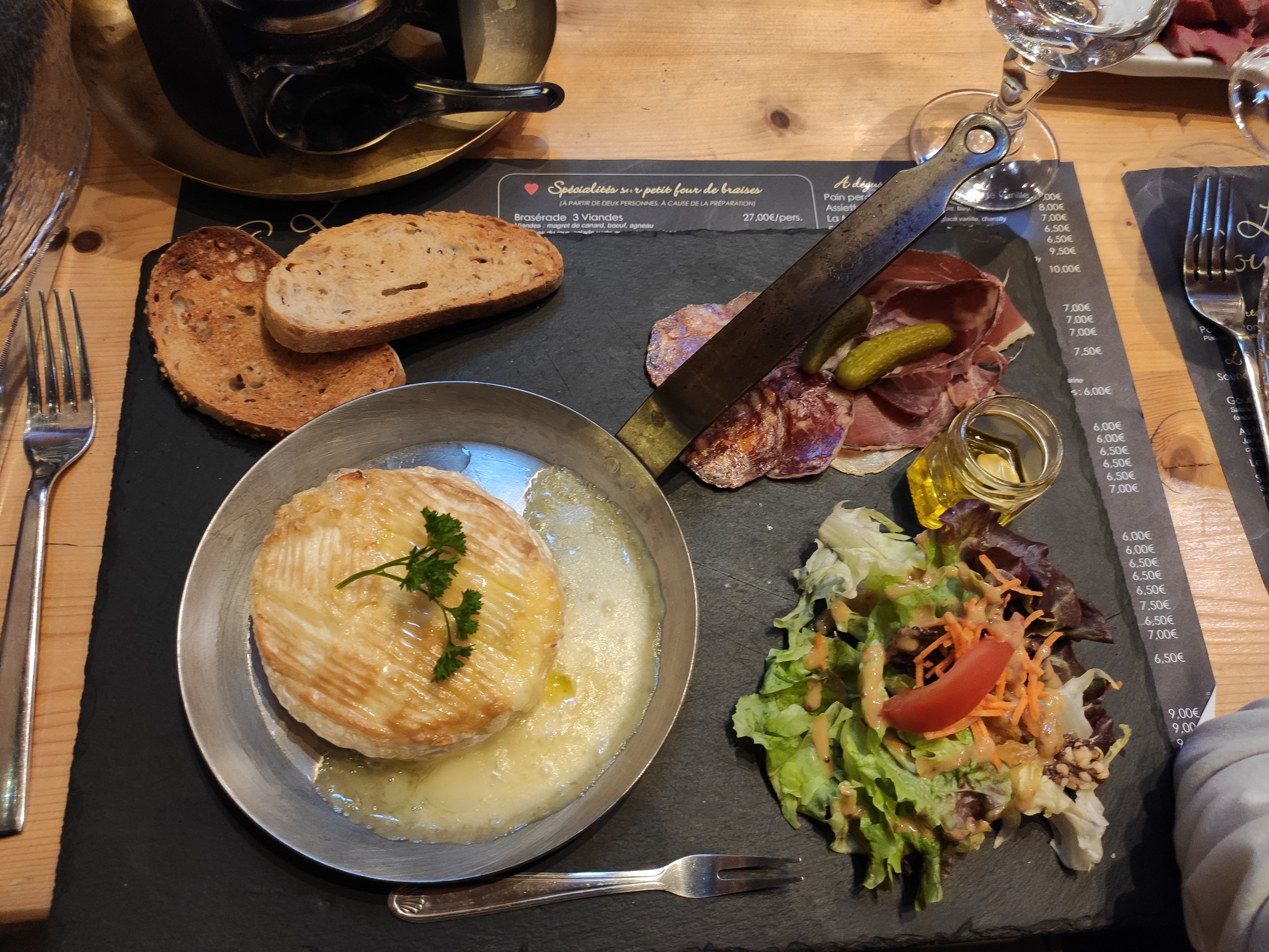 Nous avons pris une raclette, les produits étaient bons mais une tranche de jambon de pays, une de copa, une petite tranche de chorizo, deux petites de saucissons et une patate très limite pour 29e par personne. Malgré cela le cadre est sympa
