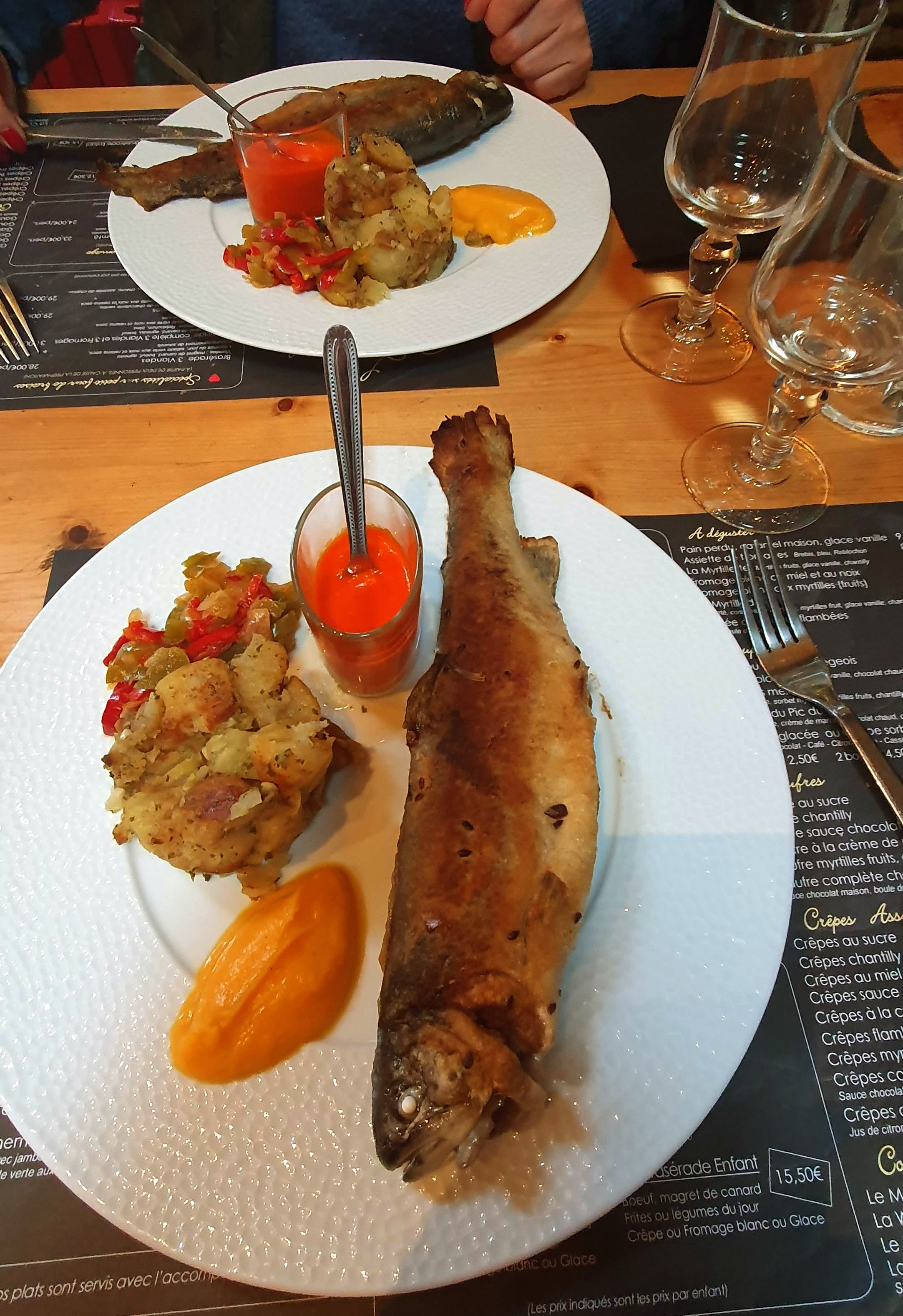 Repas entre amis au décours d'un WE ski. Journée pluvieuse donc sortie ski écourtée... Nous avons trouvé ce petit restau, en mode familial, cheminée, peu de tables... Brasero avec 3 viandes et fromages pris, ils se sont régalés. Camembert rôti juste délicieux. Menu enfant moyen, il faudrait prévoir steack haché plutôt que steack classique... Mais bon qd même ! A refaire si nous revenons par là !