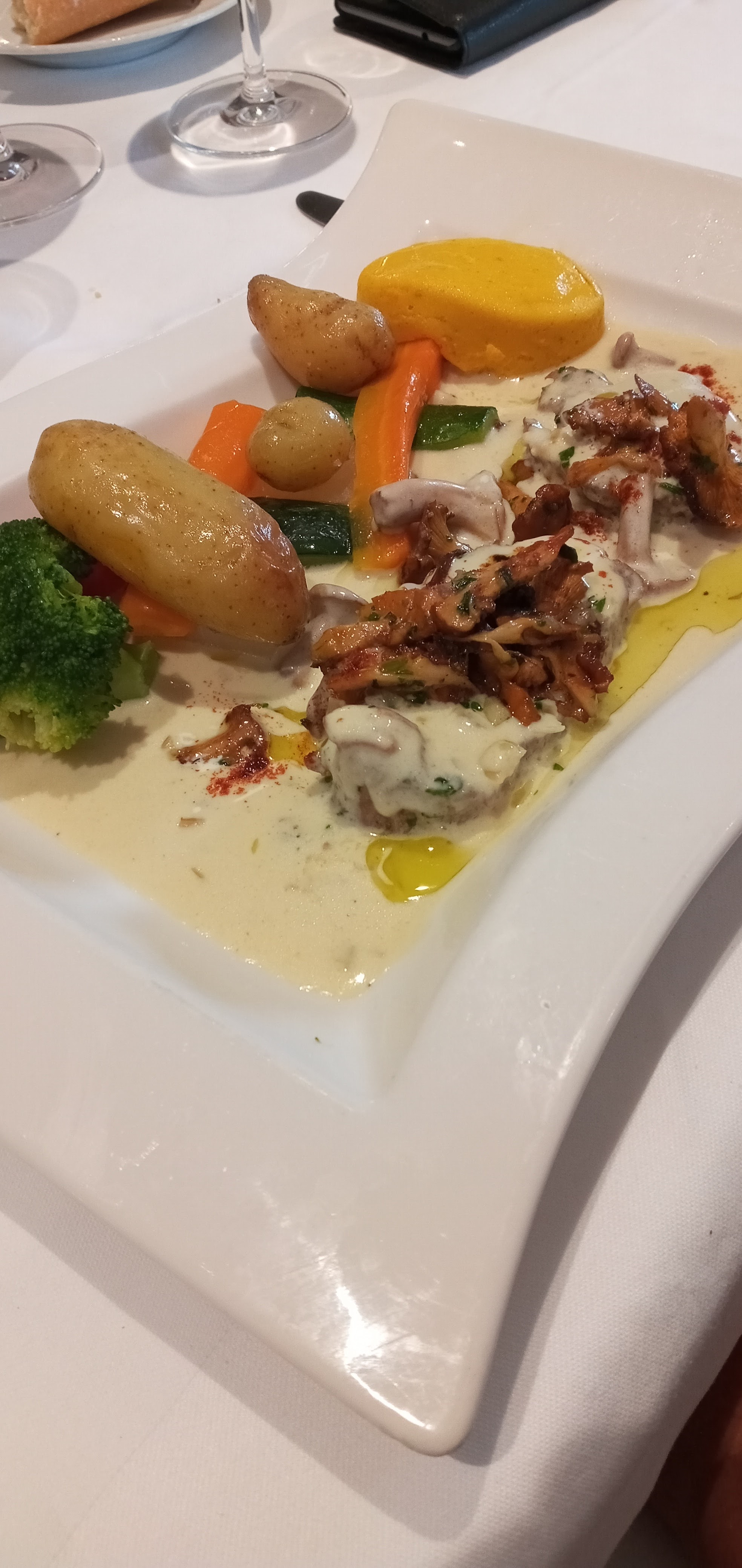 Repas de qualité, nous avons été conquis du début jusqu'à la fin. Ce qui nous a le plus plu c'est le chariot fromage ( nous pouvons choisir nos fromage et non une assiette déjà faite, ça évite les gâchis) et le chariot desserts... Nous en avons pris 3, mais les 3 étés de vraie grosse part. Et le tout avec un super cadre et un superbe service Nous ne pouvons que recommandé ce restaurant les yeux fermés