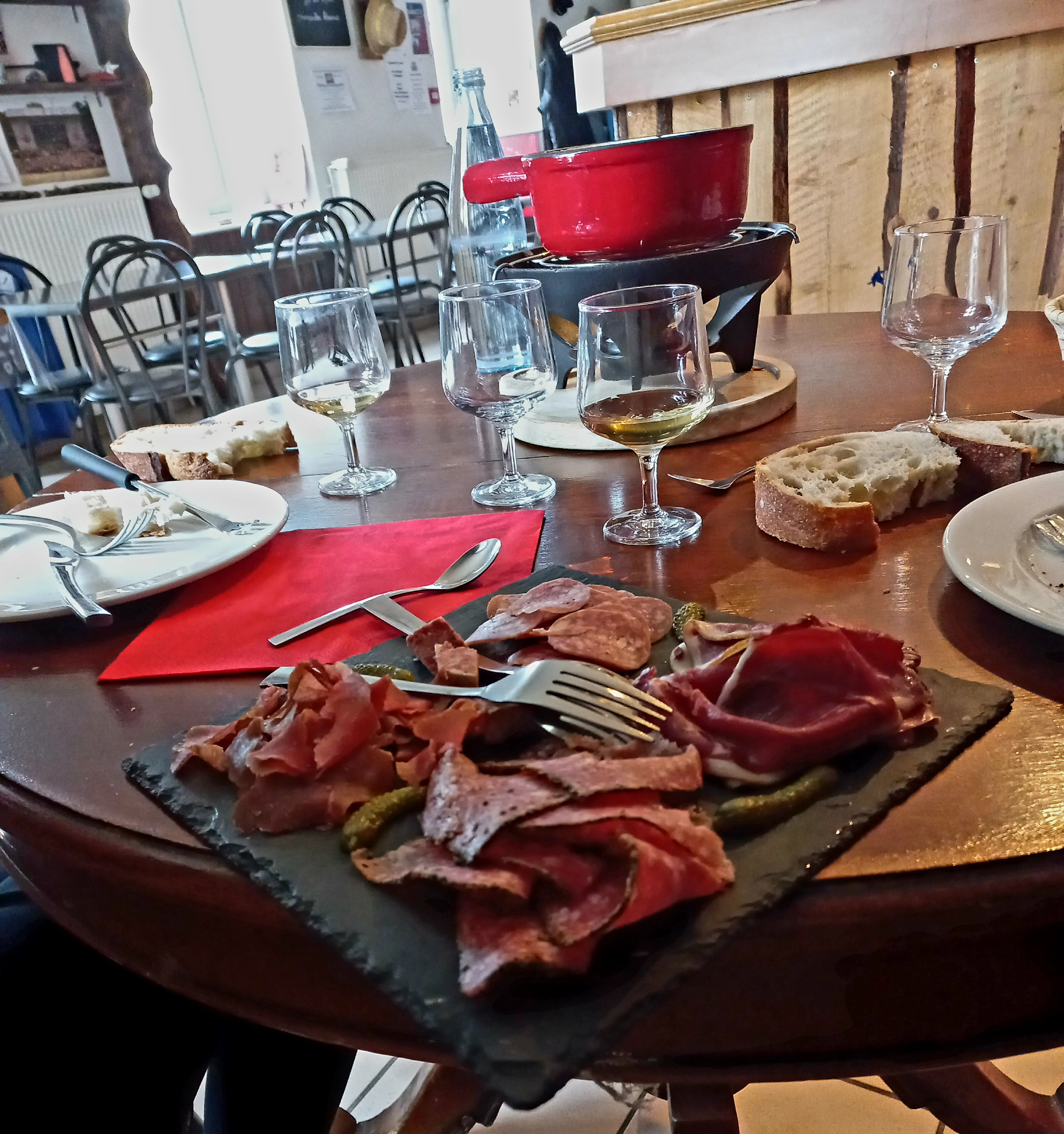Heureux de trouver un endroit pour se restaurer un dimanche frais, fondue au comté charcuterie et macvin, une spécialité de la région