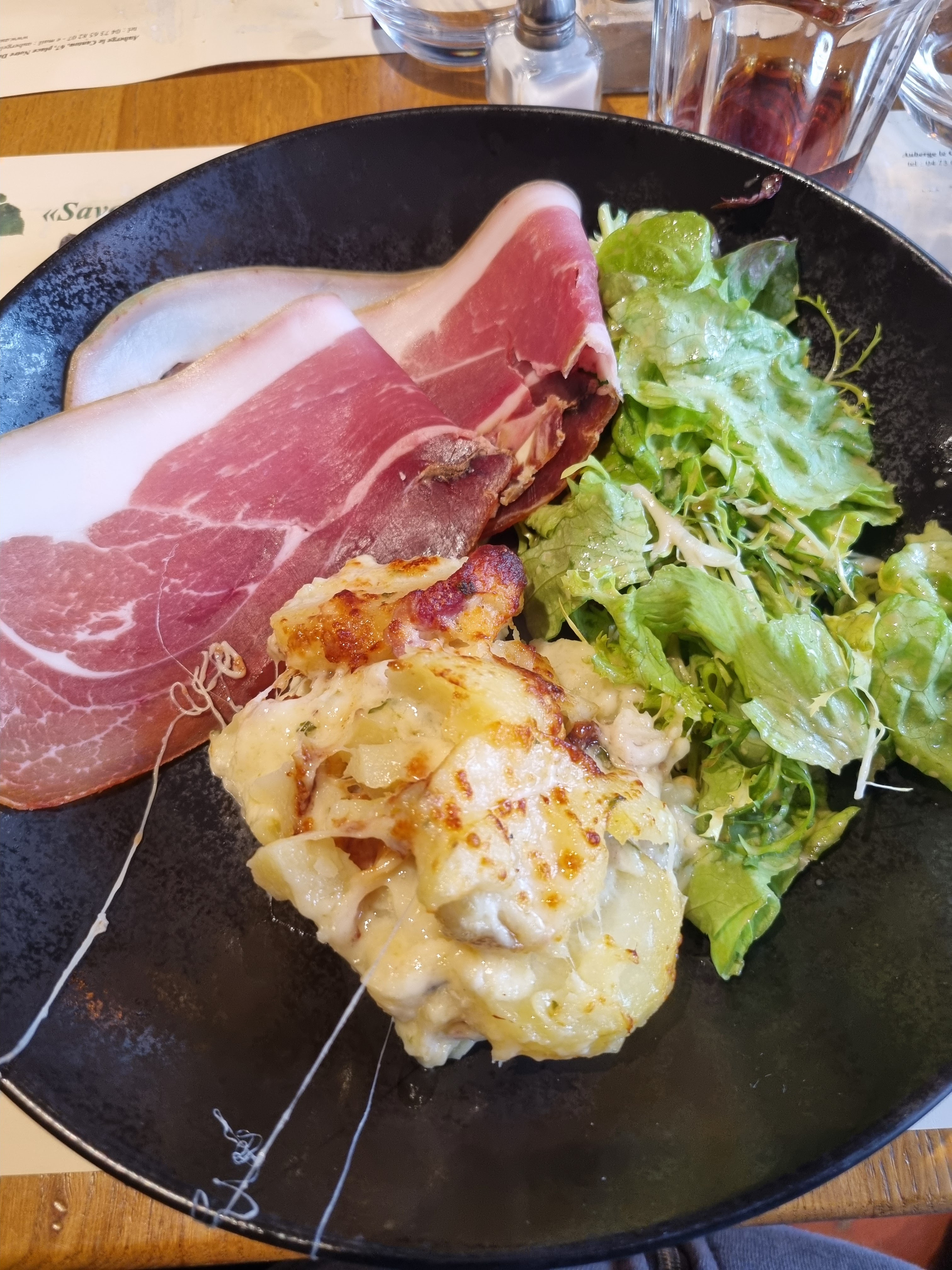 Nous avons pris l aligot Un peu déçu car peu goûtu et pas filant comme doit l être l aligot C était plutôt une purée au fromage 🧀 mais la charcuterie était bonne et la petite salade bien assaisonnée Par contre le dessert pompe aux pommesétait copieux et excellent Service impeccable