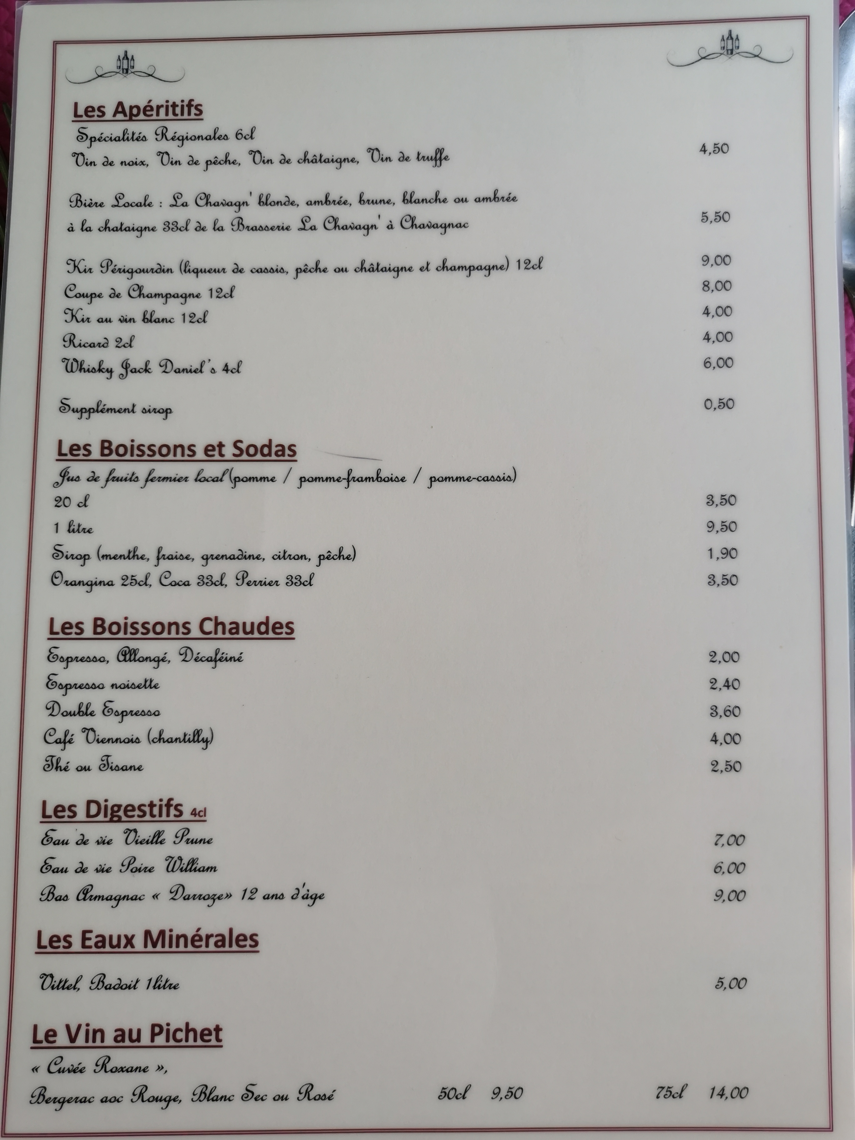 Acceuil sympathique.. Personnel souriant,agréable.. Menus et cartes appetissants. . Bonne cuisine.. Belle présentation des assiettes en restant simple.. Apéritif vin de truffe, particulier mais très bon.. Assiette de tranches de magrets et pomme de terre salardaise, très goûteuse, peut-être un peu plus de cèpes.. Très bon repas..a retenir.. Plusieurs offres de vin de coing en digestif, mais pas nous ??