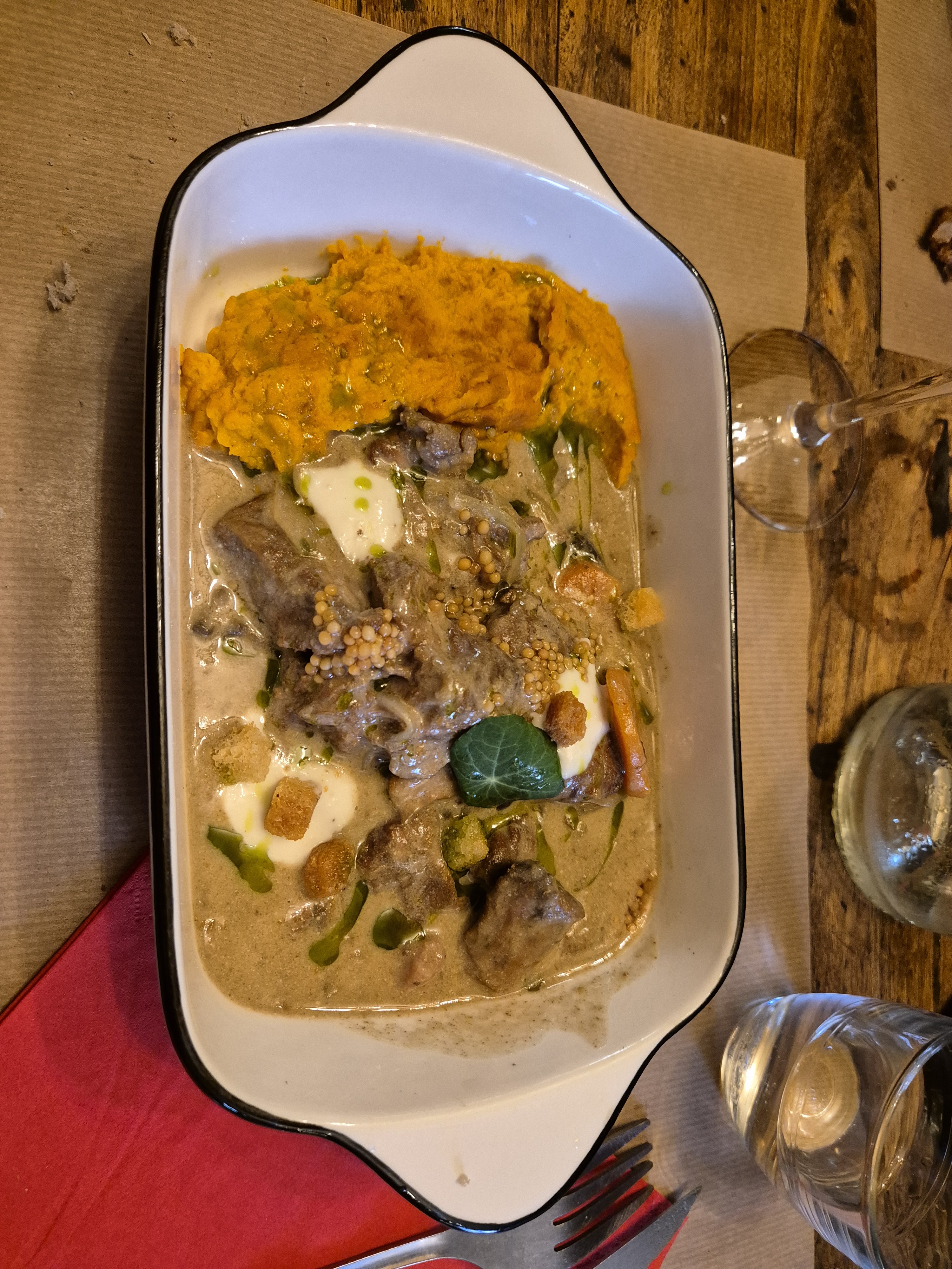Une charmante petite auberge, ambiance à l'ancienne comme chez nos grands-parents ; les murs signés d'artistes passés par là ! Belle idée de concept pour la farandole : vous dégustez différents entrées et desserts proposés par le chef. Vous choisissez votre plat : ici un filet de bœuf avec purée de pomme de terre aux noix (annoncé). Viande avec sa sauce très bonne, mais purée un peu décevante car nous n'avons pas trouvé le goût de la pomme de terre, complètement dominé par la noix. 1 + pour le houmous de betterave et l'effiloché de bœuf en entrée et 1 + pour banofee en dessert 😋