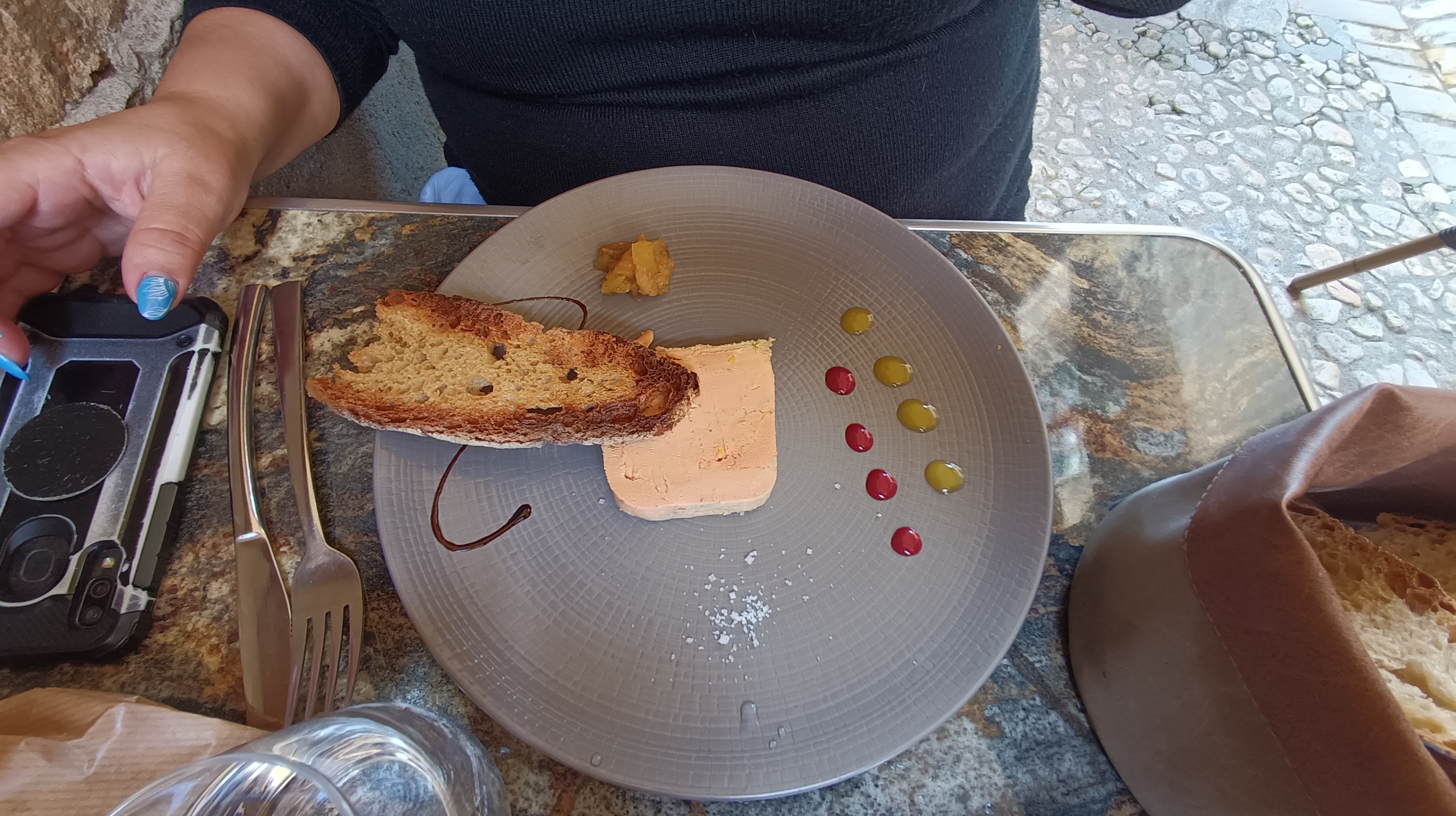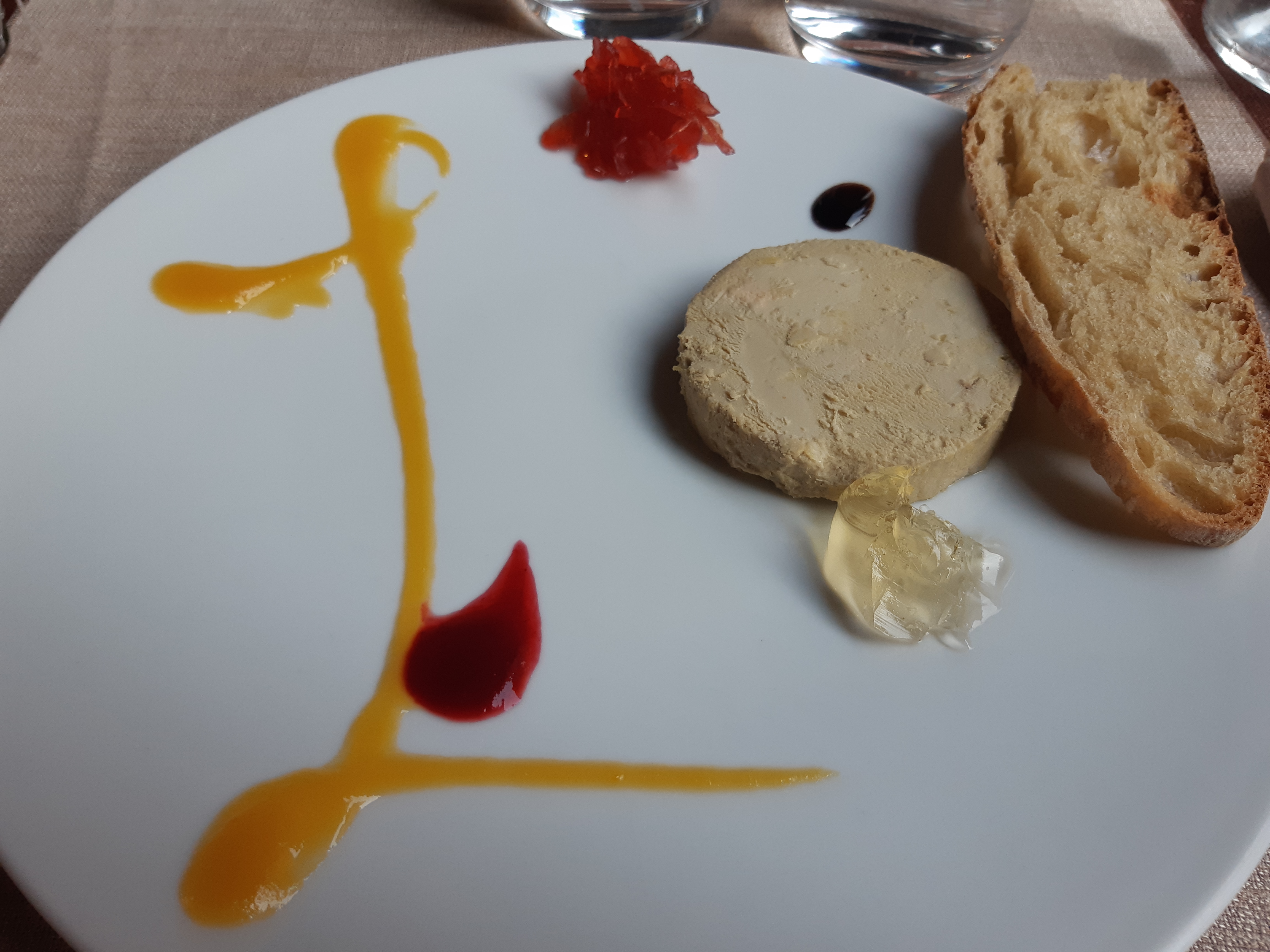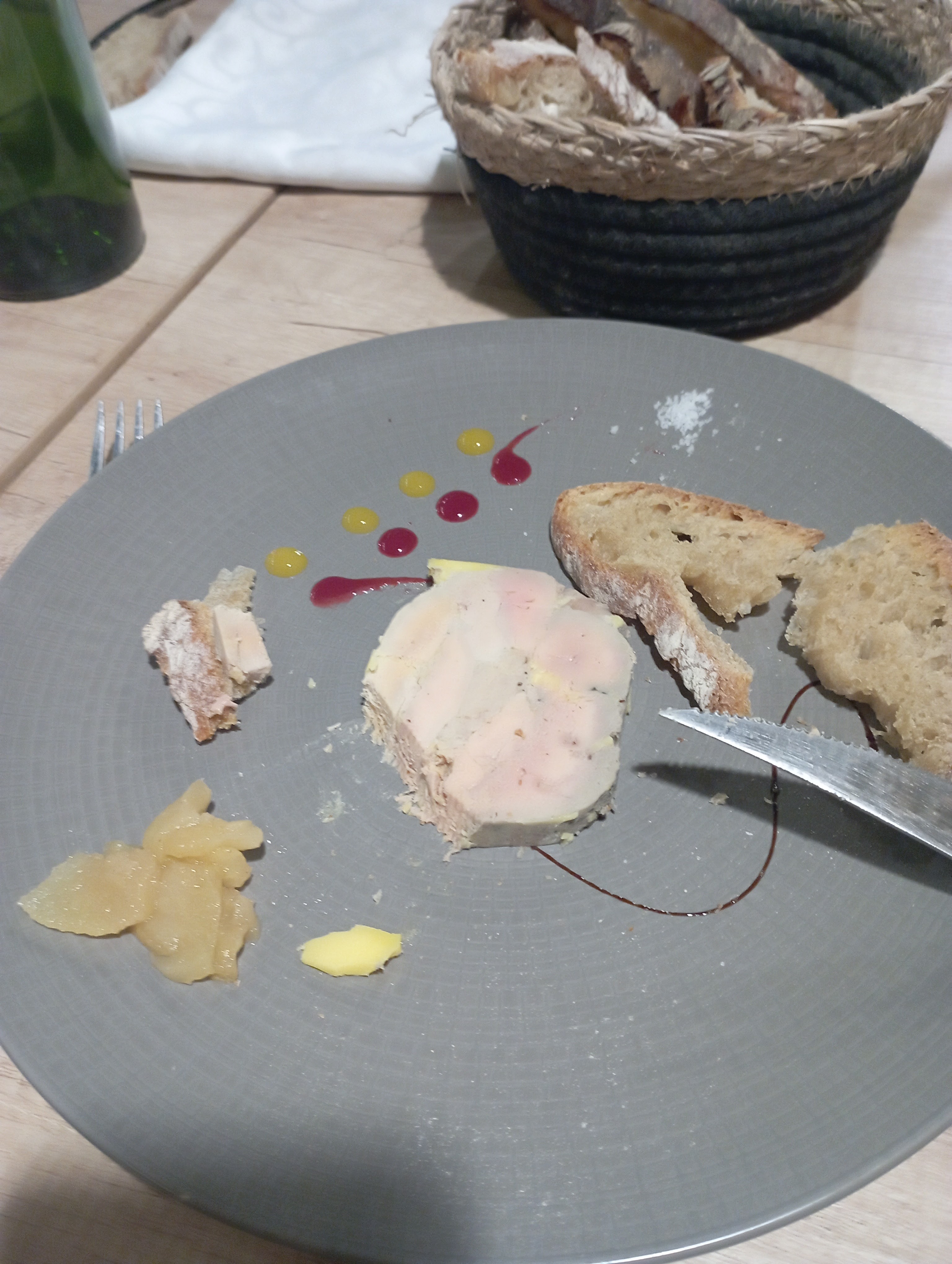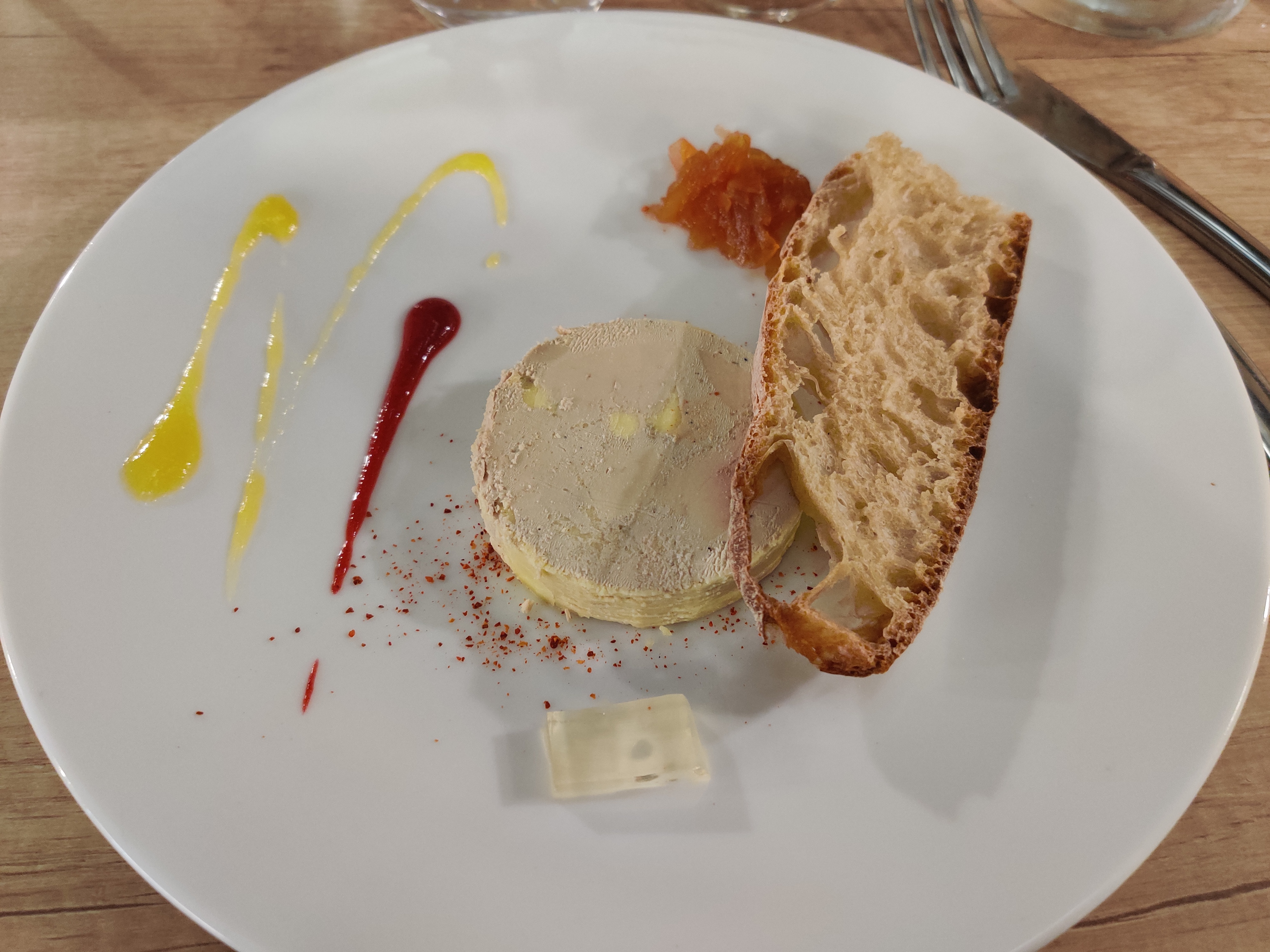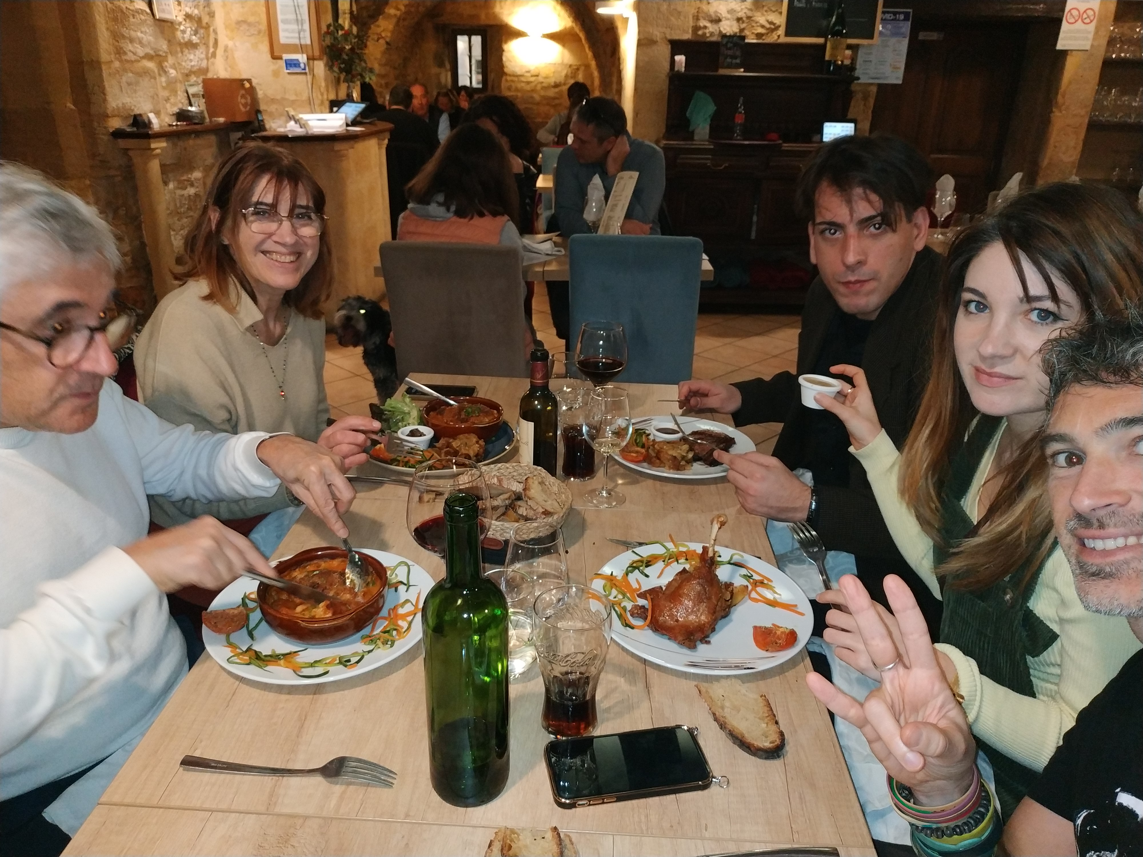 Dégustation d'une assiette de foie gras que l'on a partagé à 3. Puis moi et mon conjoint avons pris le magret de canard avec la sauce truffe et ses pdt sarladaises.. Miam un véritable délice. Cuisson respecté et parfaite. Mon fils a pris la truite qui était succulente aussi. Je recommande pour la cuisine, le cadre, service sympathique et rapide. Ps : Les chiens de toute taille sont acceptés et bien accueilli c'est génial. Merci pour ce moment avec le pti passage dans la grotte en supplément qui fait son effet