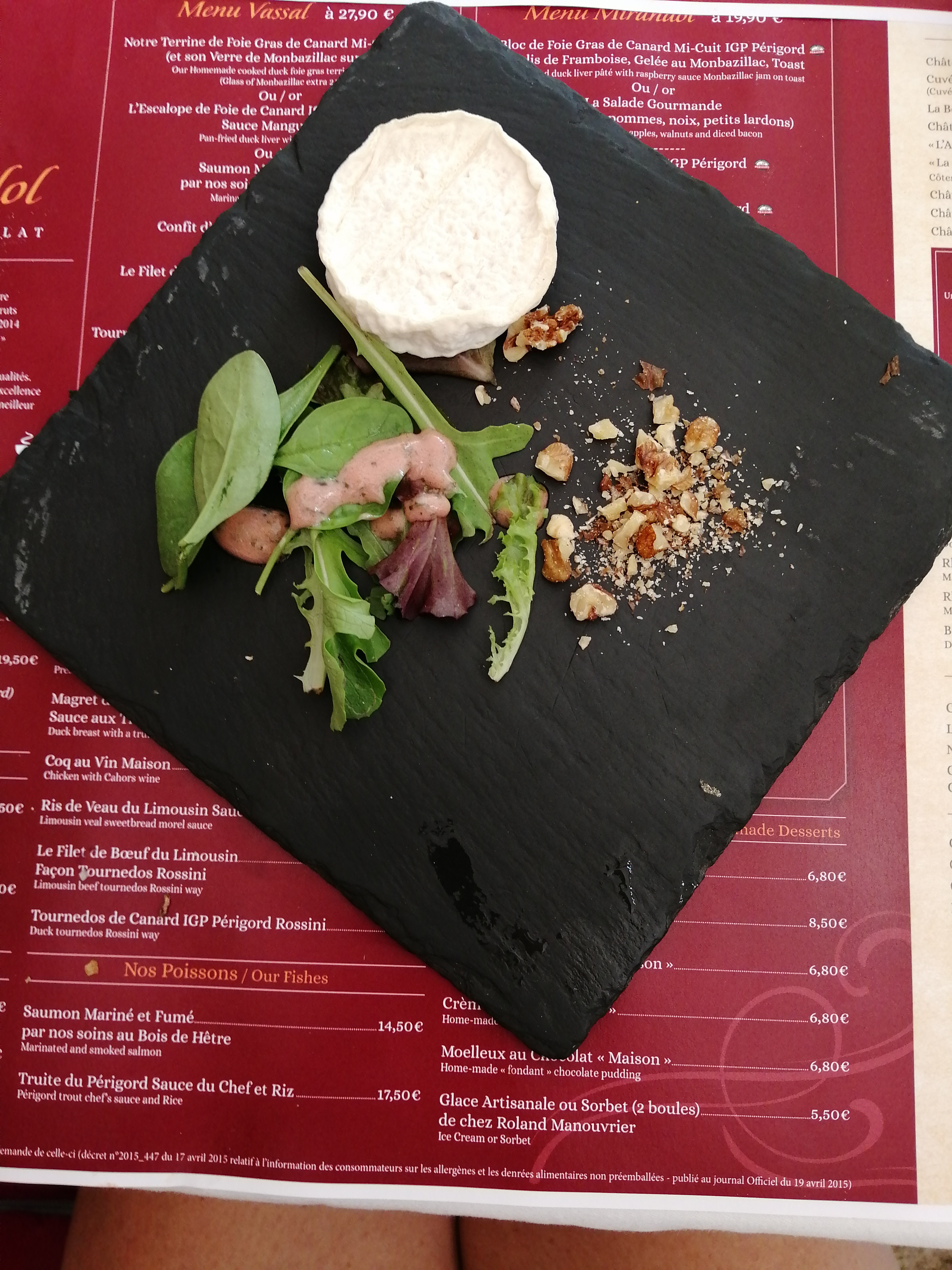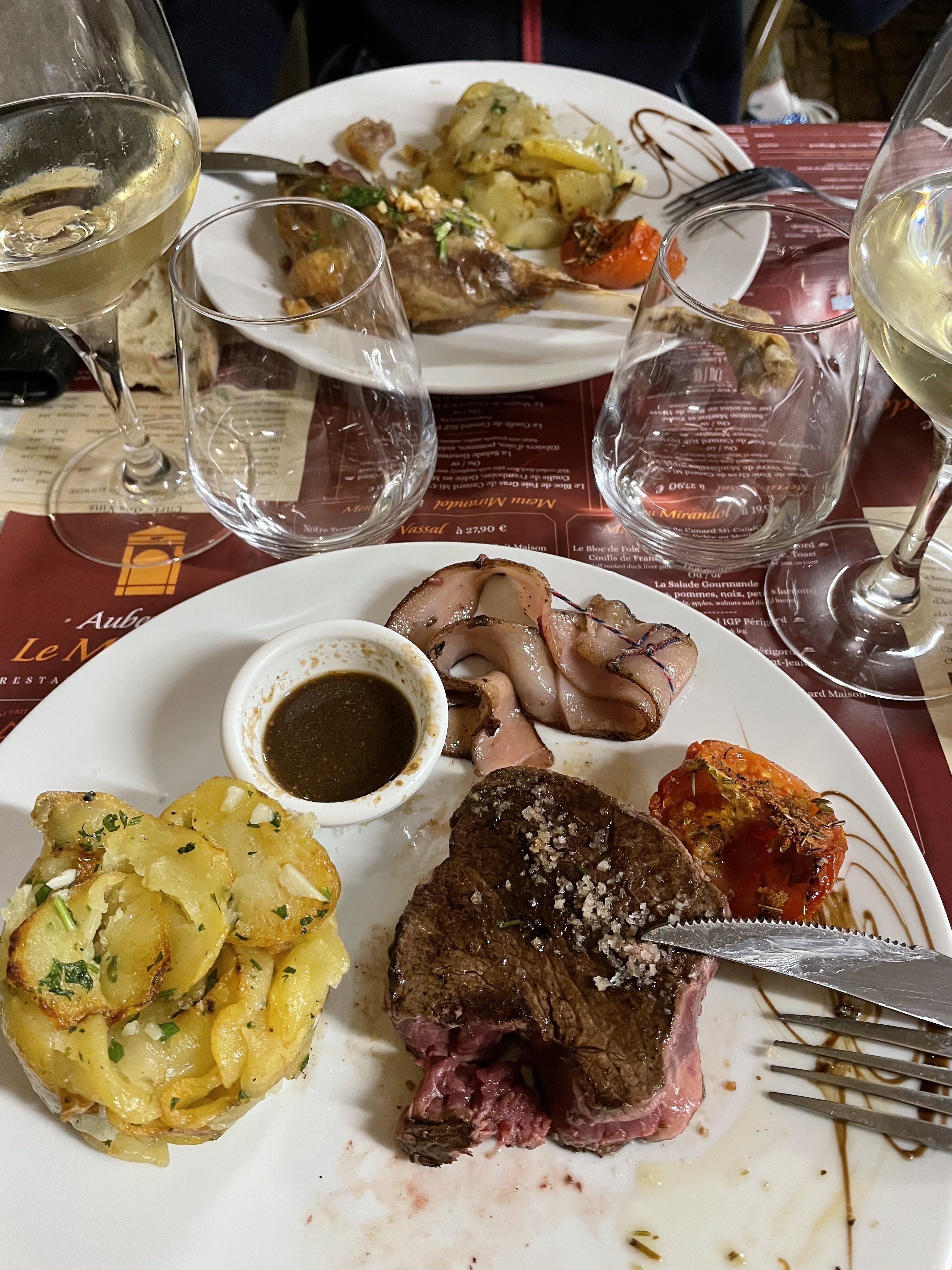 Nous avons pris 1 menu Vassal (26€) et un menu Mirandol (37€). Les plus: - Le cadre de l'auberge est sympathique et typique, la grotte est une petite curiosité - Le service est efficace (une vrai ruche), très bien organisé, professionnel et aimable - Il y a peu d'attente entre les plats - Les plats sont globalement bons, ce que nous avons mangé est fait maison Les moins: - L'apéritif tout juste frais, nous avons supposé qu'ils étaient déjà préparé en avance. Rien pour l'accompagner, à 9€ l'apéro c'est dommage. - Le pain qui commençait à sécher dans sa corbeille - La terrine de foie gras mi-cuit trop fine à mon gout - Le dessert, gâteau aux noix et tarte aux pommes, ne sont réellement que ça. C'est cheap pour un menu à 26€ et 37€. Une boule de glace aux noix, un crumble ferait la différence... Nous avons globalement apprécié le repas, avec un petit arrière gout pour le rapport qualité / prix / quantité. Surtout quand on voit la photo des magrets sur leur site: 11 tranches contre 5 pour nous ;)