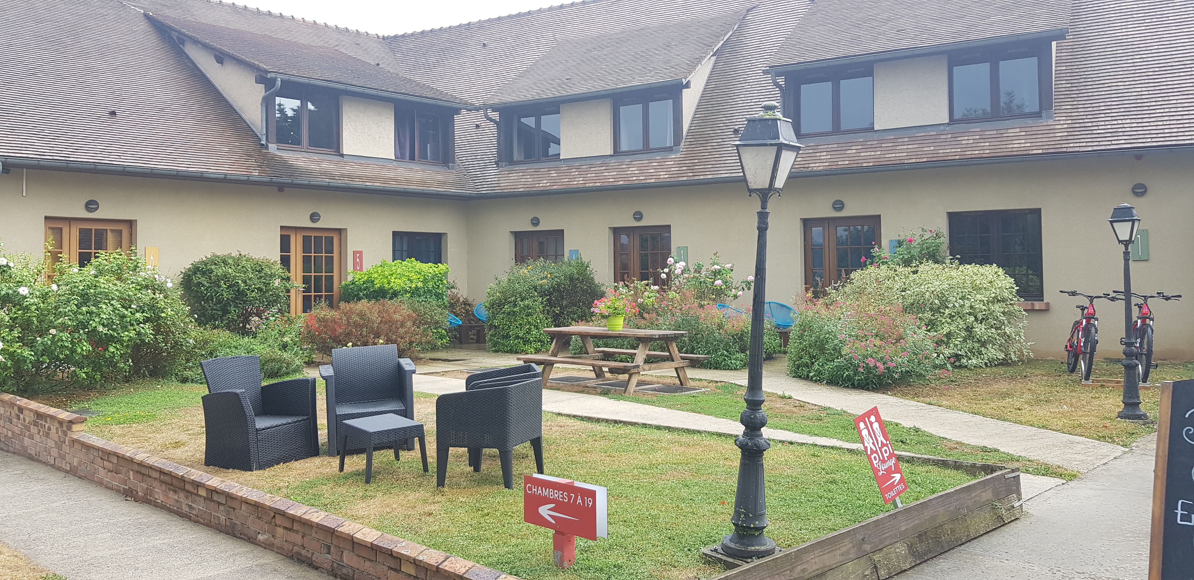 Nous y avons passé 3 nuits début aout. après une arrivée par le passage coudé sous la voie ferrée (argh), nous longeons la seine et découvrons l'hôtel. Une grande terrasse, 1 étage, des chambres de plein pied, d'autres avec terrasse. Nos chambres sont belle, rénovées récemment et la salle de bain parfaite ! les couleurs sont sympas. la literie est de qualité. nous avons une petite terrasse avec table et chaise et vue sur le bras mort de la Seine : magnifique ! surtout le matin avec la brume - des canards sont pas loin. comme il a fait chaud nous rentrions plus tôt et avons profités de la plage aménagée à coté de la terrasse- le chemin devant ne dessert que l'hôtel et qq maisons le calme est garanti. à noter que la voie ferrée est juste derrière et fonctionne la journée. passer les premières fois ensuite on ne fait plus attention et la nuit les trains ne circulent pas. le restaurant : le premier soir étant un peu frais nous décidons de diner dans la salle. Surprise ! la cheminée - grande - fonctionne... pourtant il ne fait si froid que ça!! en fait nous découvrons que les plats sont cuisinés au feu de bois. belle perspective. La carte est alléchante avec quelques spécialités de la région (camembert roti...) mais nous avons la formule menu.; et ne perdons pas au change - entrée plat et dessert nous nous régalons sans se sentir lourd. les légumes sont croquants, la viande cuite comme il faut (magret, veau...).. bref trois belles soirée. les 2 autre soirs nous mangeons sur la terrasse avec plaisir. et notons que la table est bien connue car le restaurant était pleins tous les soirs -de même les 18 chambres. l'apéritif cidre façon Kir est excellent. une mentions spéciale aux croissant du petit déjeuner : des vrais au beurre et d'une légèreté... adresse à retenir pour ceux qui veulent se faire une virée à Giverny et dans ses environs- l'hôtel est très bien situé et on y est bien !!