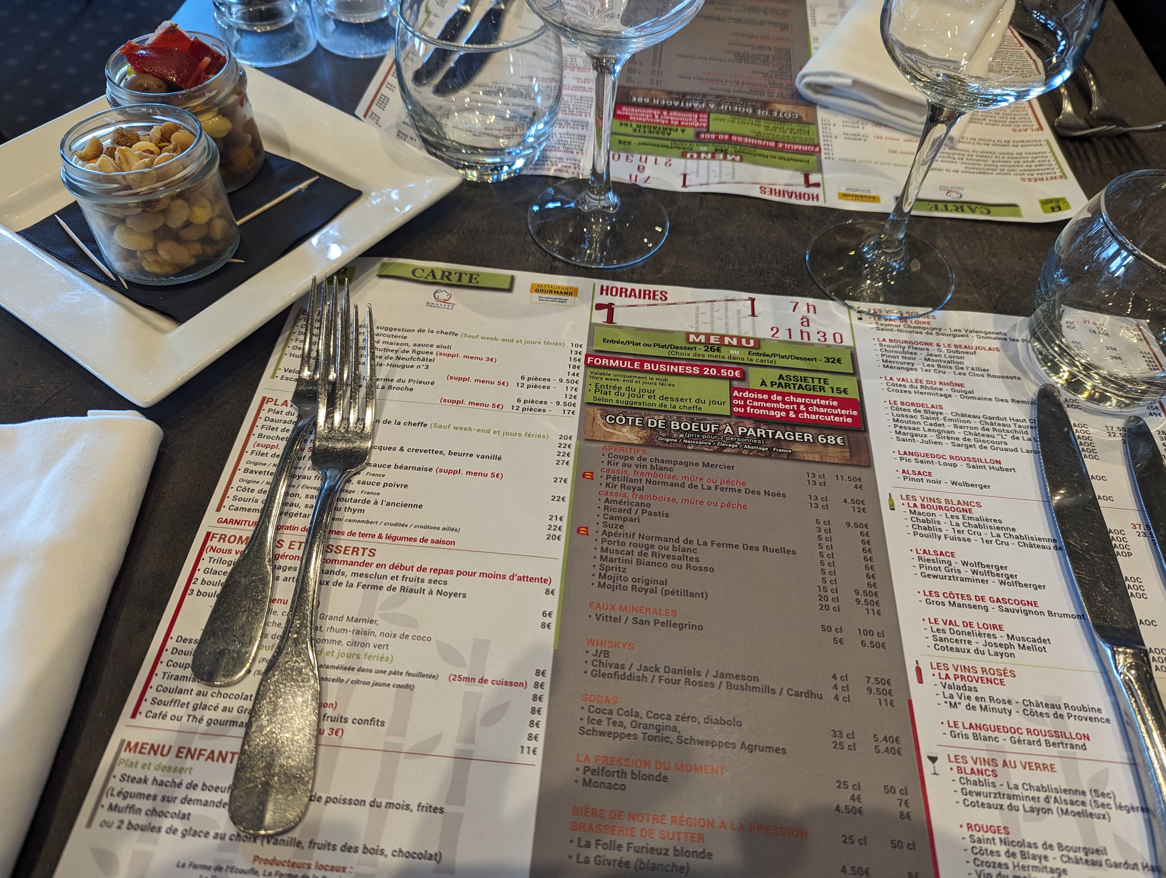 Lieu agréable. Terrasse très agréable. Service moyen. Et cuisine qui pourrait être magnifique cependant... Un os a moelle merveilleux Cependant le demi camembert Me laisse dubitatif ! La même garniture ou presque Salade trop sucré et très bon céleri. Garniture identique à tous les plats . Même présentation. Vous avez oublié l anniversaire De ma petite fille de 10 ans Heureusement pas nous , Ha oui la croûte de pont l l'évêque servie a femme . Les sauces invesrsées. Tarte framboise sur le café gourmand surgelée et ........ Bon très moyen. Je passe l accueil et notre départ ... Très moyen .