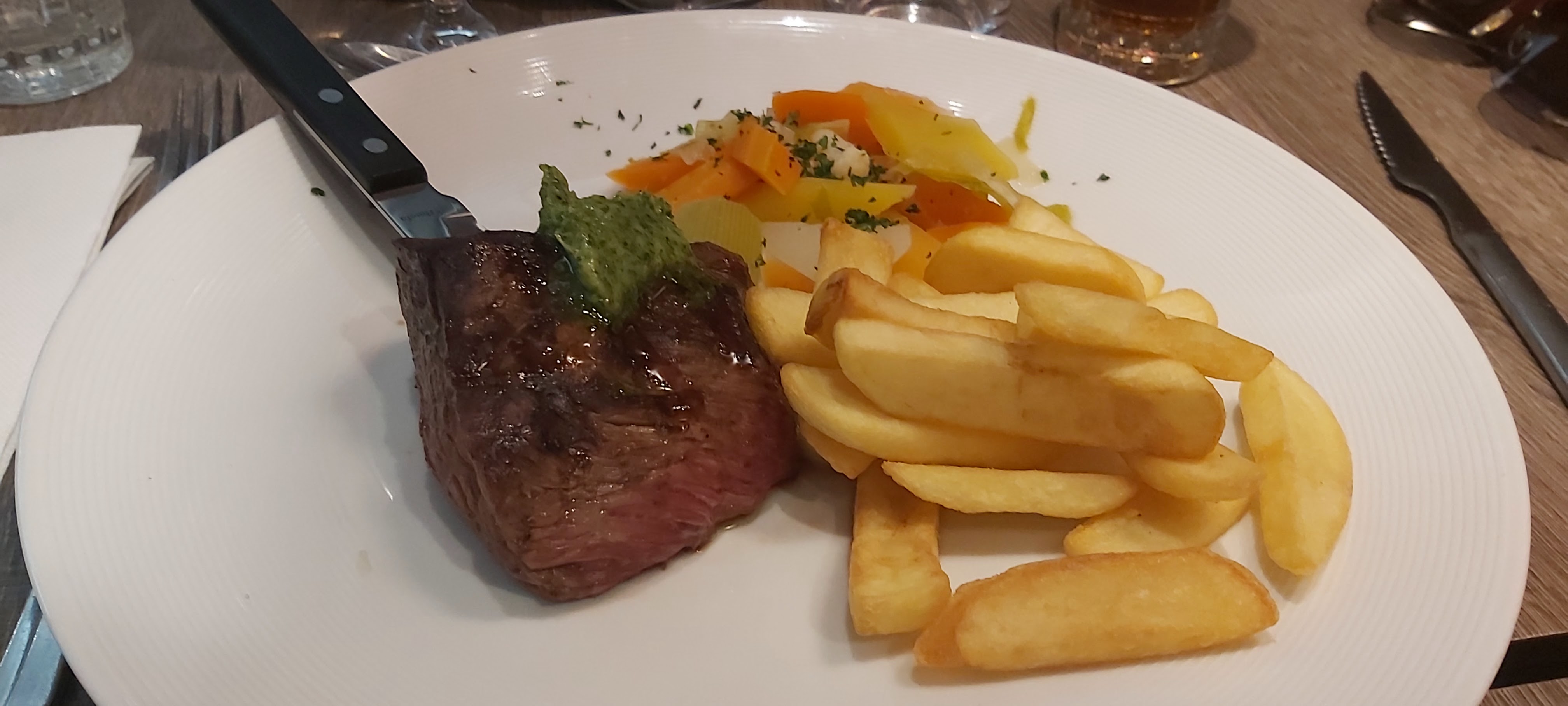 On reste mitigé sur la restauration 10 personnes : unanimité sur les diverses entrées : à peine mangeables (Une vinaigrette qui a subit une glissade sur la quantité de sel 😟) 2 types de viande choisies, le veau parfait et cuisson maîtrisée Le bœuf, trop cuit sur toute les assiettes Les desserts : plus que bof (crème brûlée froide, profiteroles bien molles, boules de glace minus) et pour la plupart avec un supplément de 4€ sur le prix du menu Bref, on attendait autre chose ...
