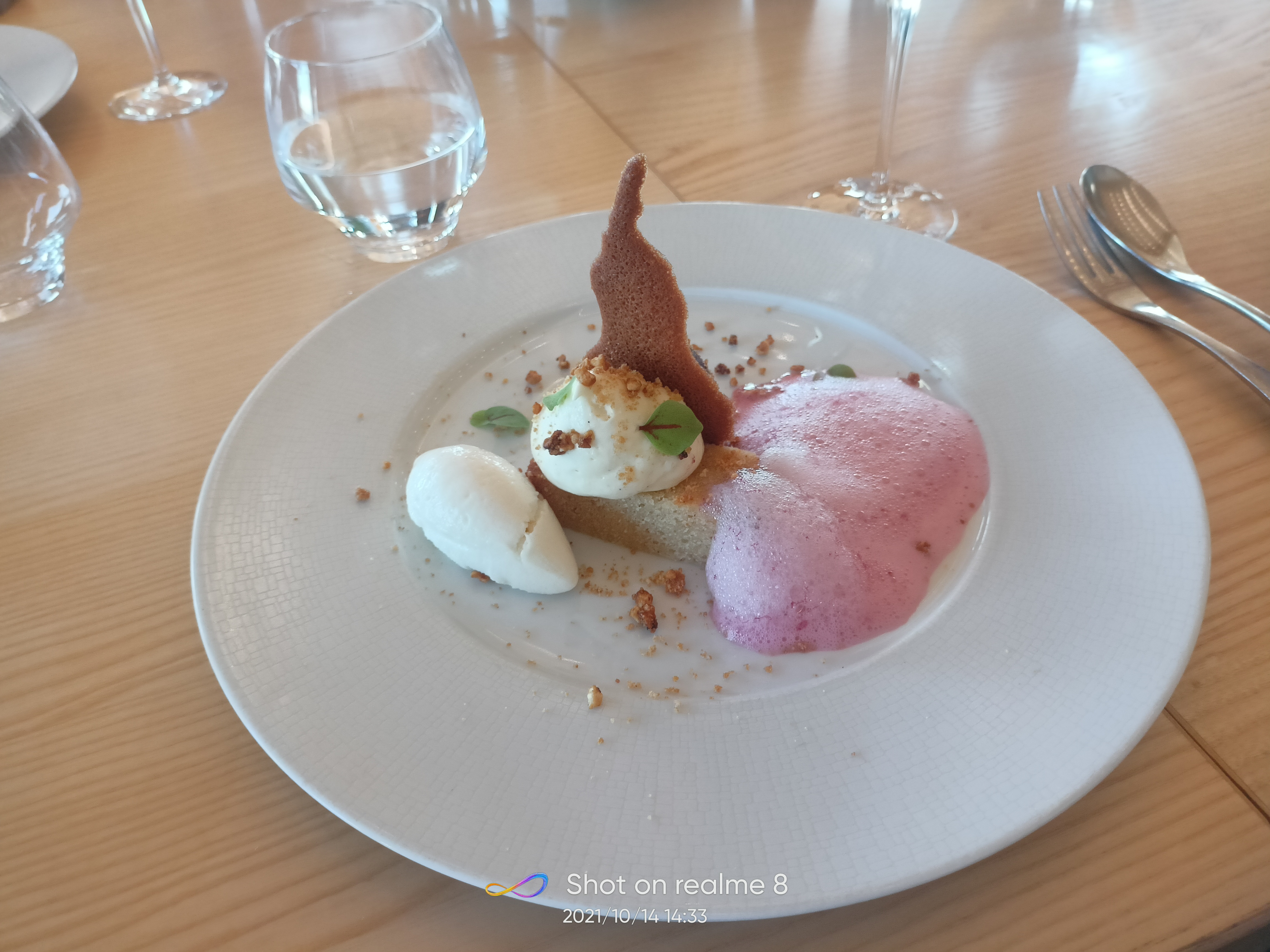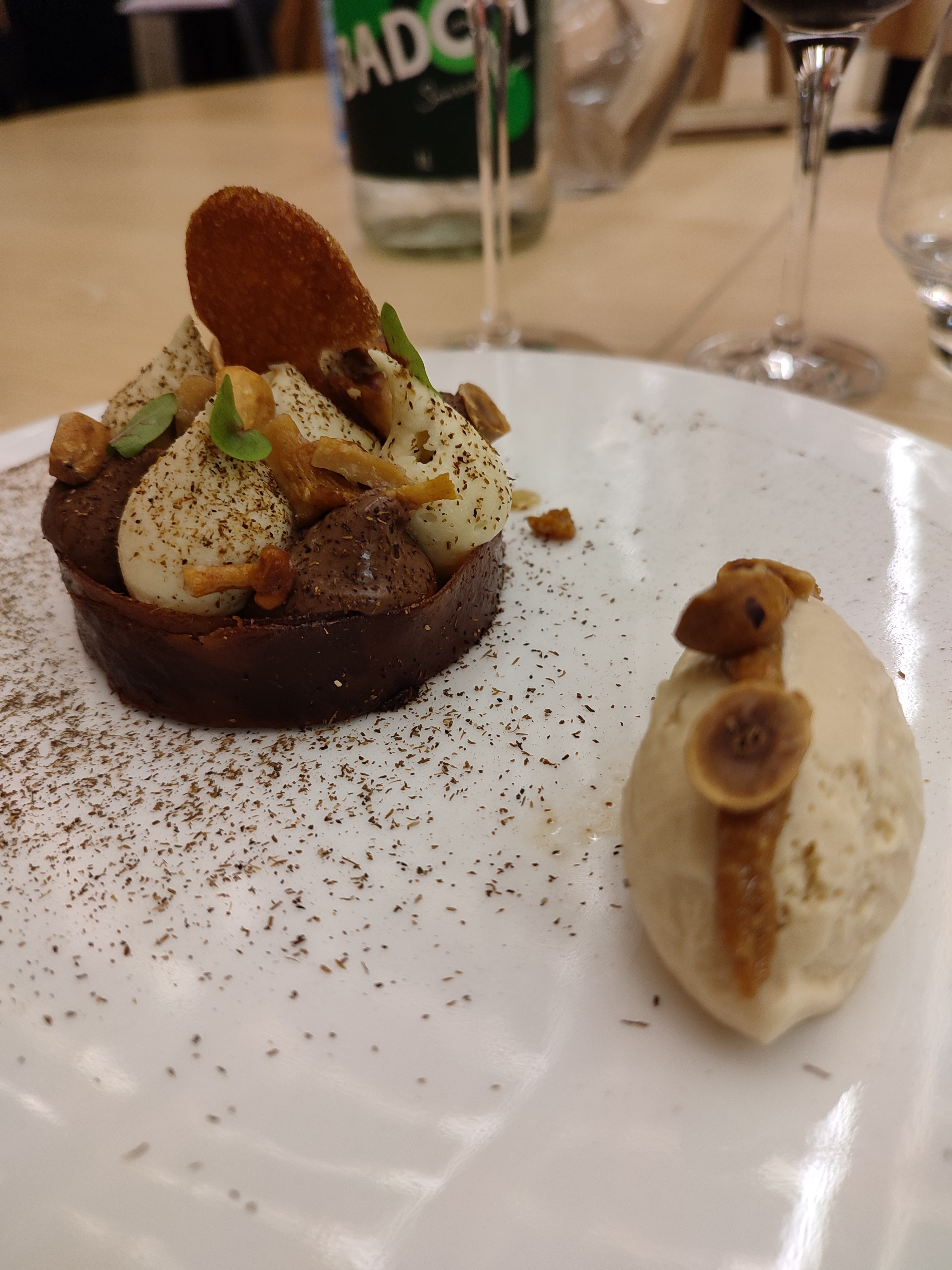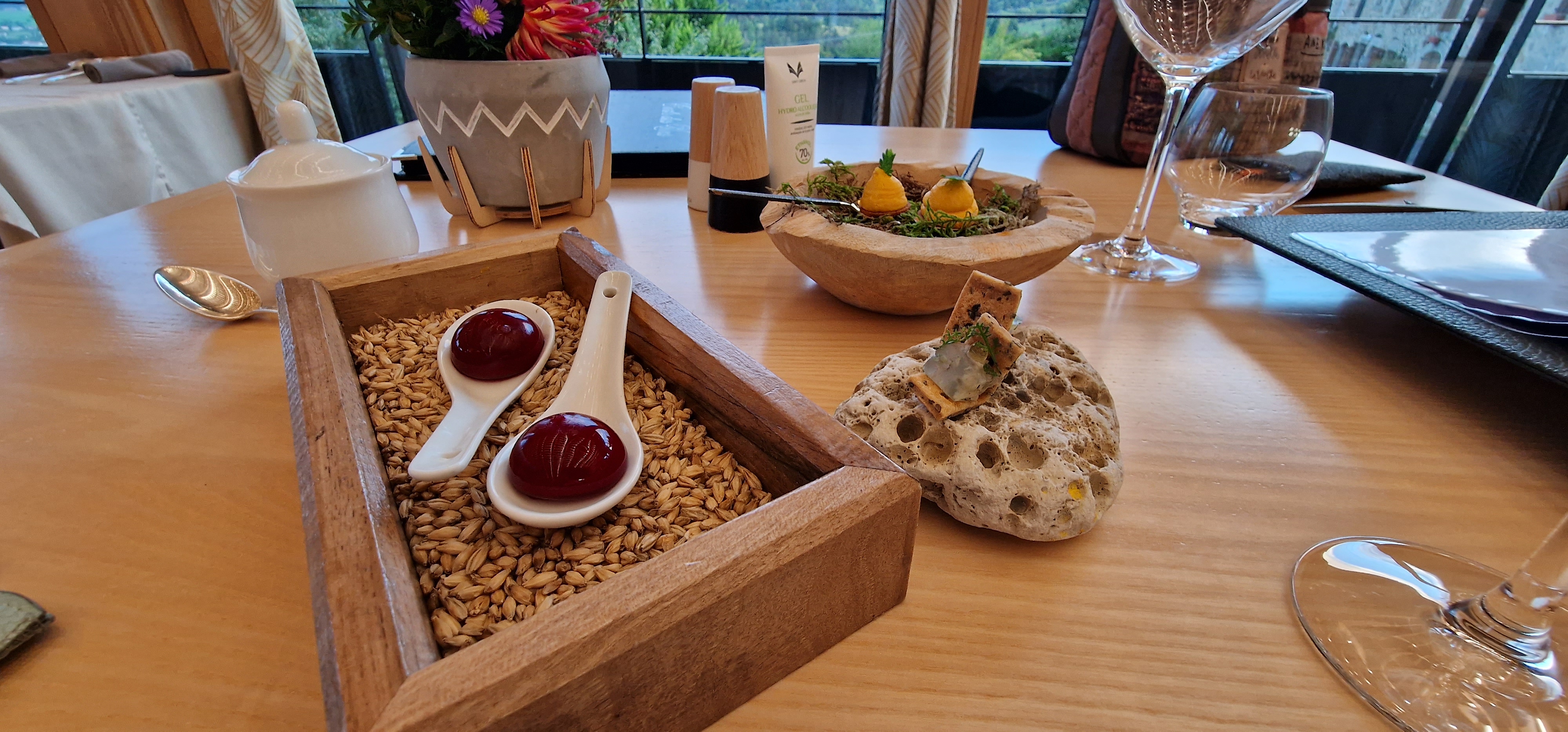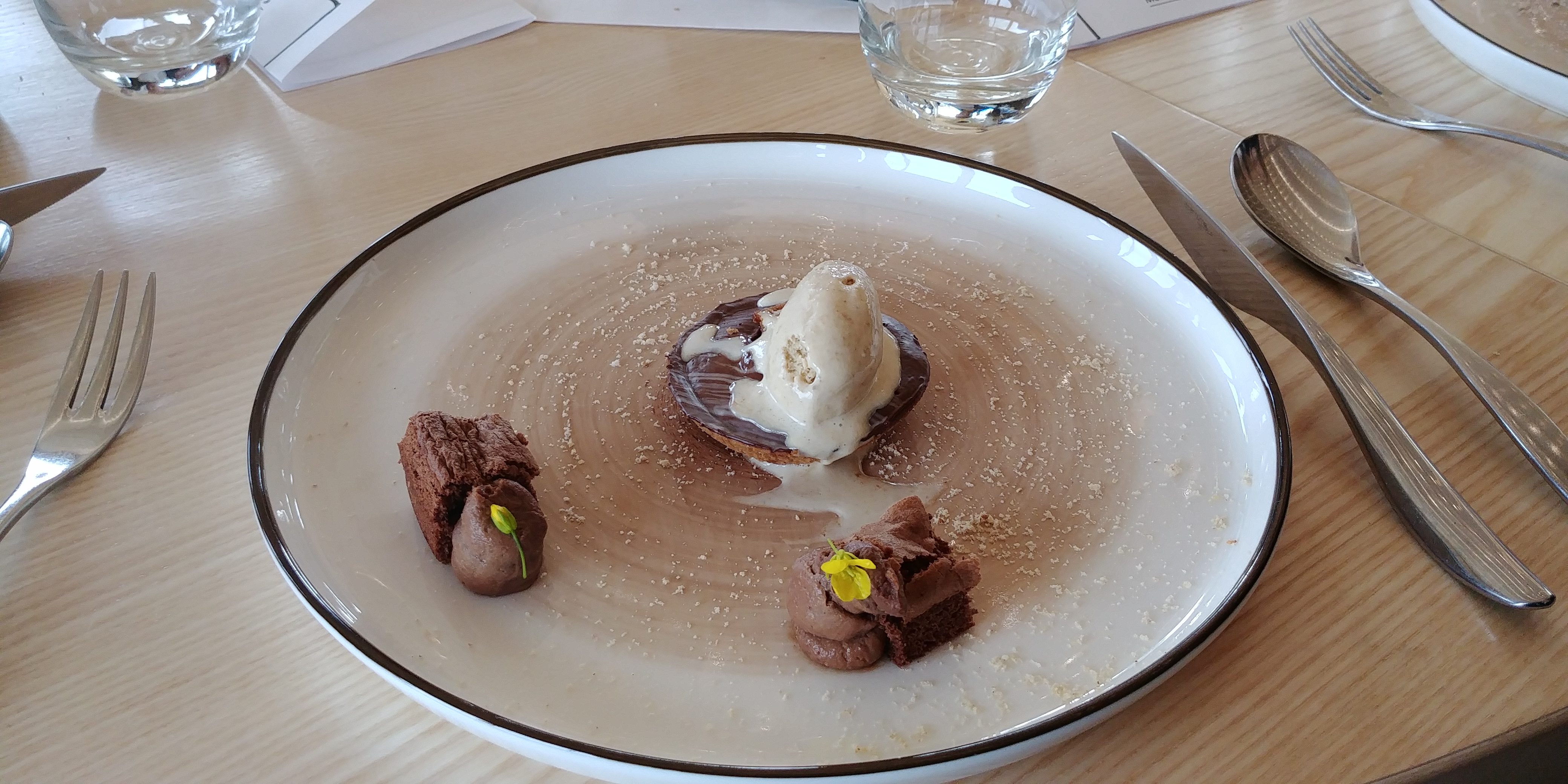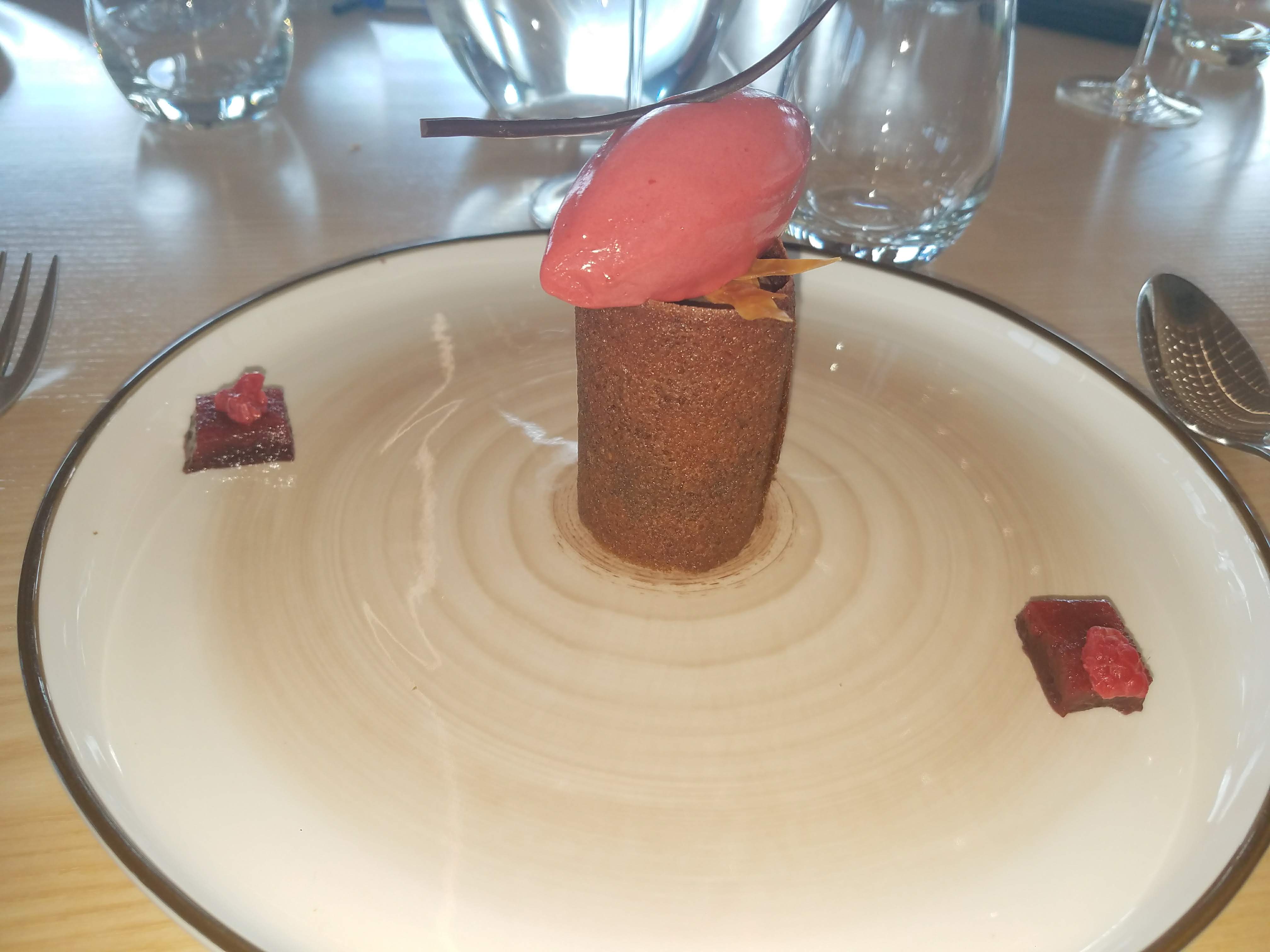 Belle découverte tant par la situation du restaurant que pour les plats Les plats font preuve de recherches et les melanges de saveurs peuvent étonner mais le résultat est bluffant quant aux explosions de goût lors de la dégustation Bravo pour cette nouvelle expérience gustative Un seul bémol pour le dessert chocolat des bois où la glace praliné poudre de cèpes laisse certains convives perplexes