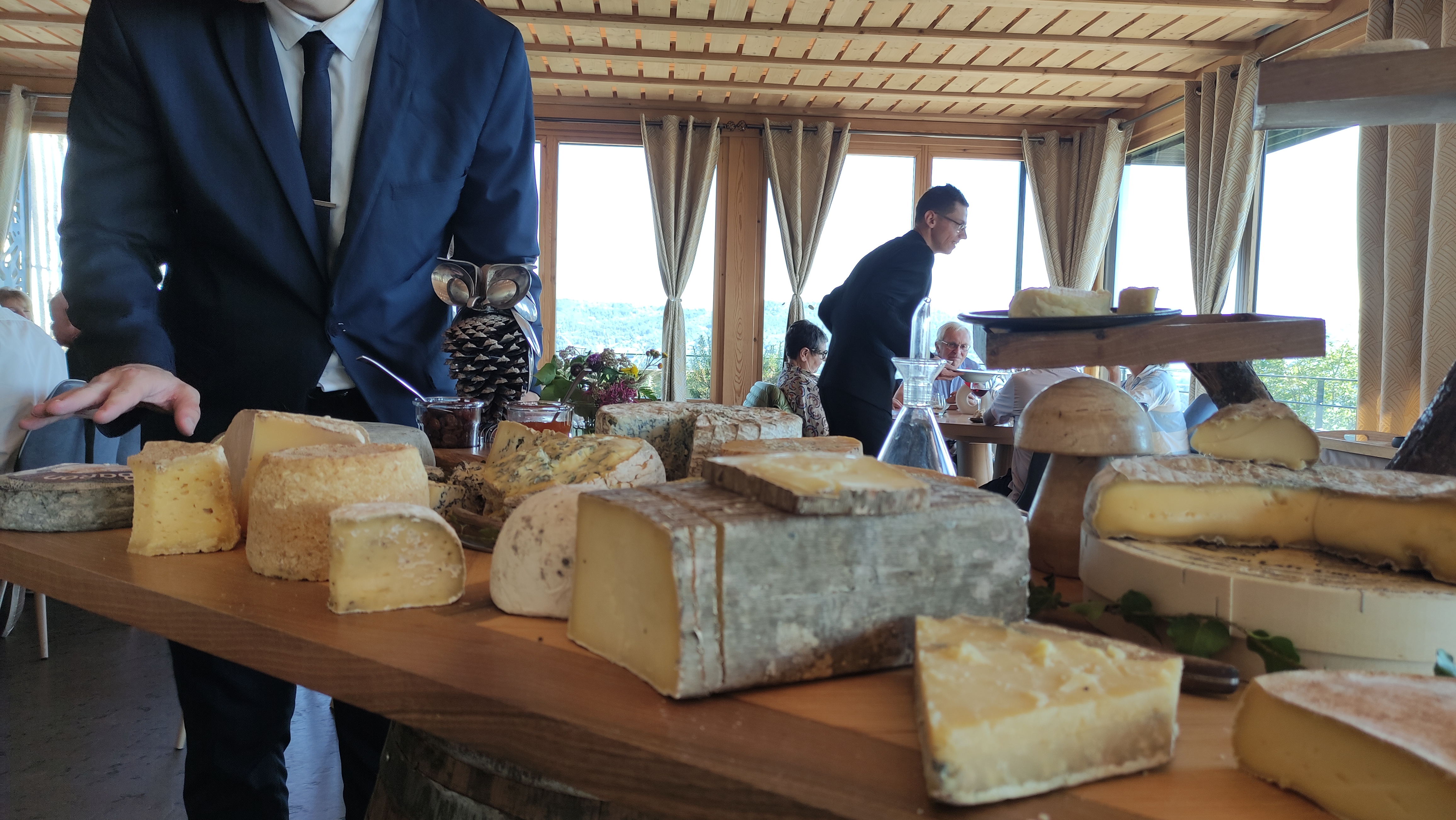 Très belle salle avec belle vue. Repas qui ne mérite pas de critiques du moins jusqu'au moment du fromage. Le chariot propose un choix important de fromages tous issus de grandes maisons de la région. Pour ce qui est des parts servies on peut remplacer la fourchette par une loupe. A ce stade autant supprimer le fromage.