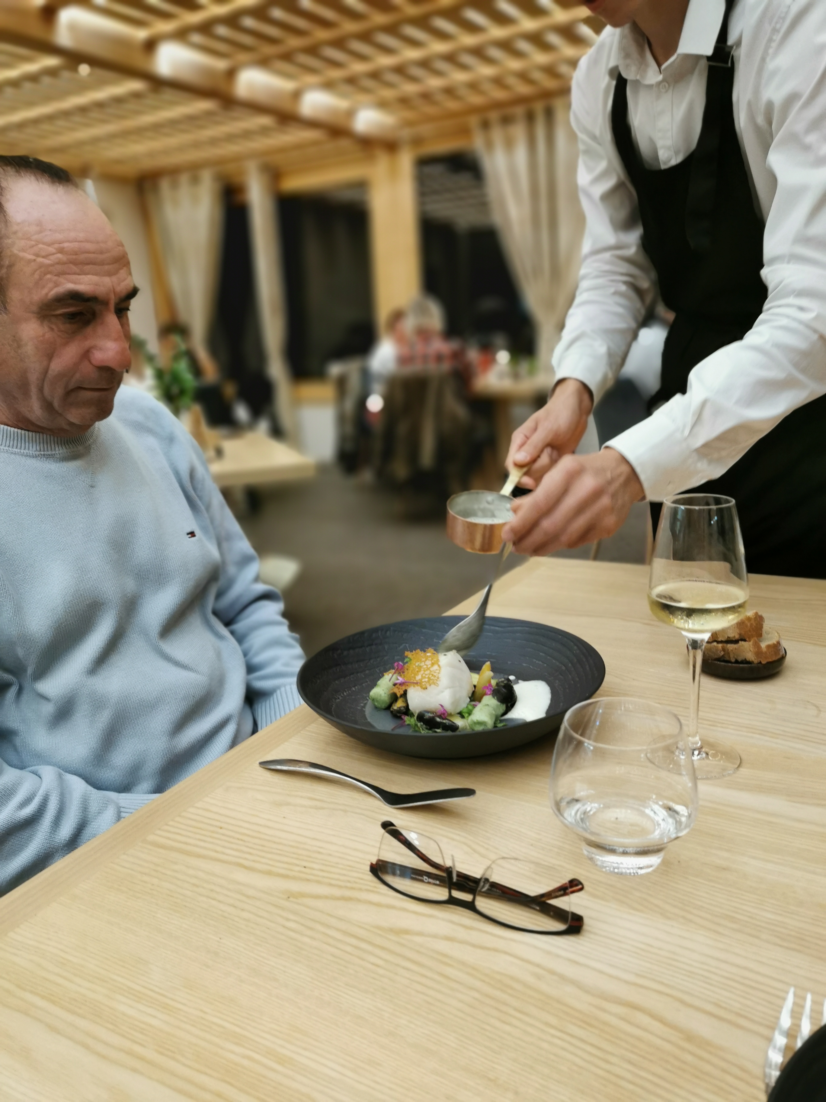 Absolument merveilleux merci pour ce dîner en amoureux 🥰 Grande première pour le couteau a poisson . Le tonneaux de fromage superbe idée tellement de choix ! Nous sommes venu visiter la région une semaine serveur très agréable une cuisine extraordinaire . Nous reviendrons quand nous serons de passage 😍