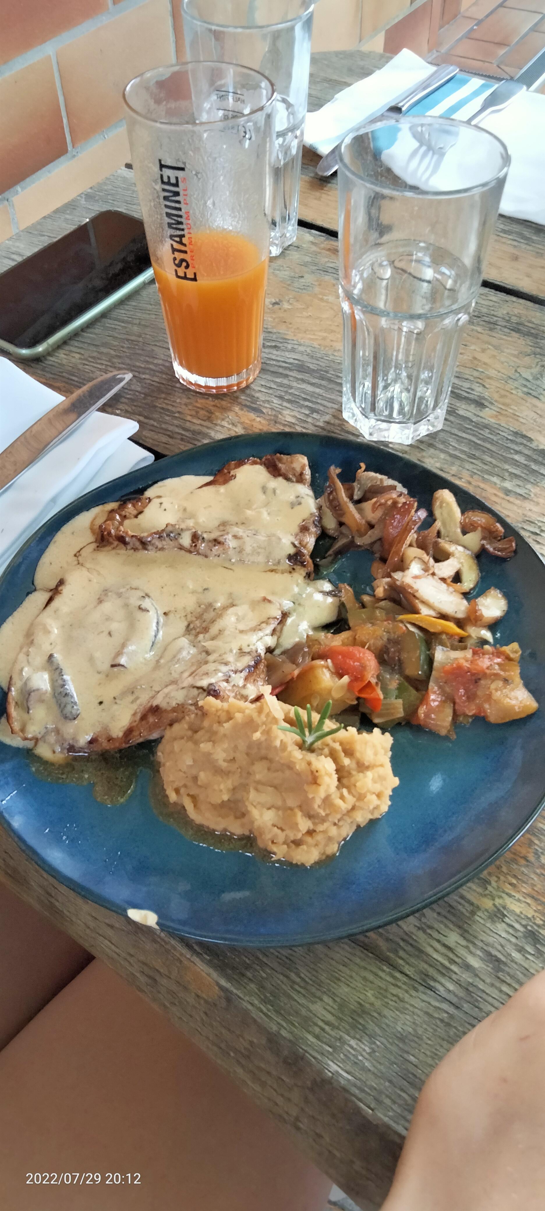 Très bon plat, dommage que je n'ai eu la possibilité de boire1/4 d'eau pétillante même pas une 1/2 c'était 2l où rien ...le service change.