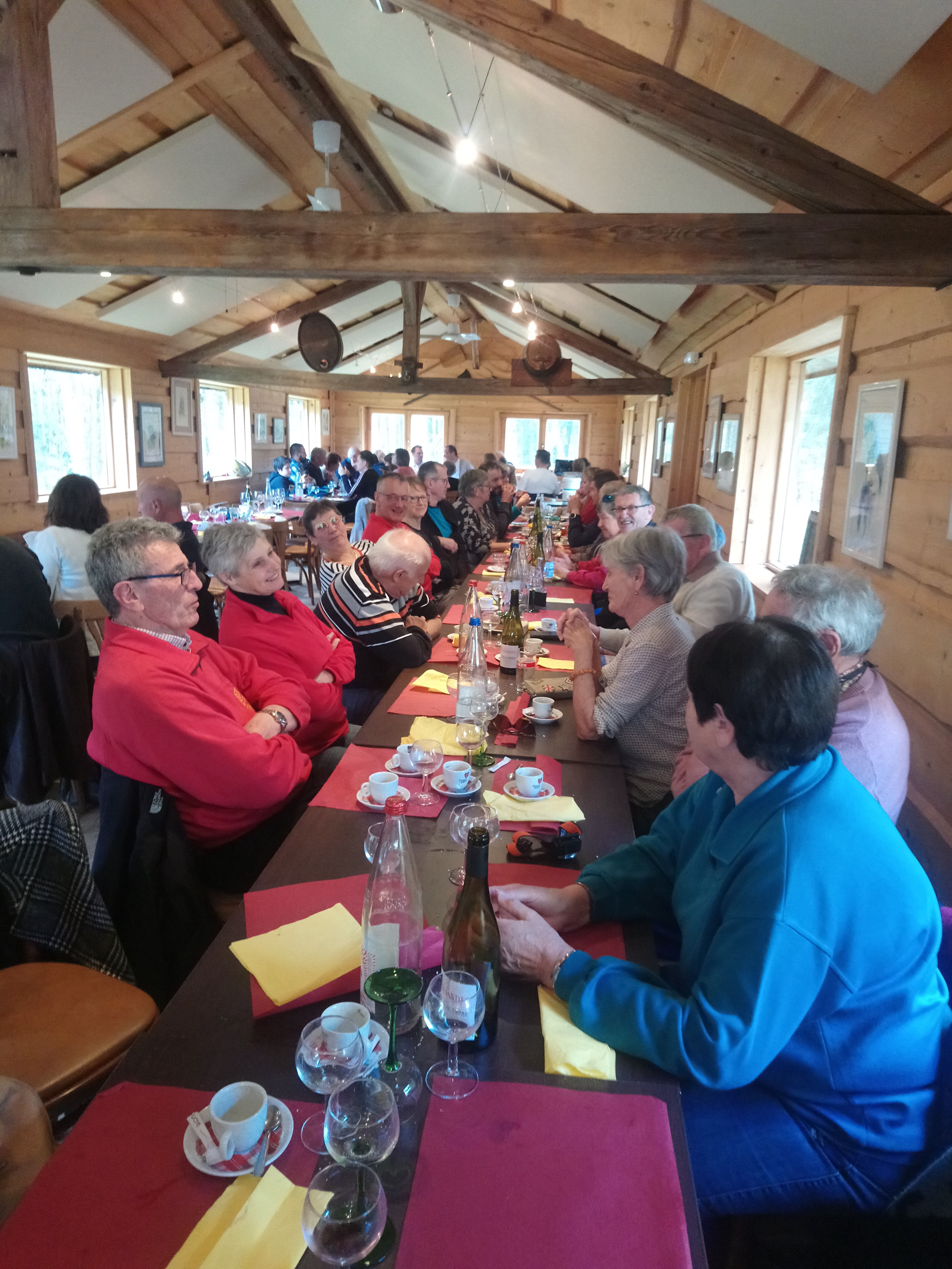 Nous sommes arrivés en bus vers 13h15 à 52 personnes environ, nos trois grandes tables étaient réservées à l'extérieur sous une grande vérandas couverte mais ouverte sur les côtés, avec une belle vue sur un grand pré et la forêt environnante. Il y avait à ce moment là déjà, à vue de nez, au moins 60 personnes installées à l'extérieur comme nous et environ 30 personnes à l'intérieur. L'établissement est adapté à autant de monde avec peut-être deux exceptions près dont je parlerai plus bas. Le service était efficace et rapide pour tout ce monde, mais visiblement excédé par toute ces demandes diverses et variées et ça se comprends. Le repas, intégralement réalisé sur place, était composé d'un bretzel frais avec l'apéro, d'une salade composée de diverses crudités et d'un morceau de saumon en gravlax, de bouchée à la reine et de mehlkneppfle, et d'une grande tranche de vacerin glacé. EXCELLENT !!! Le repas fut très copieux, très bon et avec beaucoup de goût. Pour autant de monde faire du fait maison, je dis bravo, ça se sentait dans l'assiette et le service repassait pour le plat principal pour reservir. J'en parlais plus haut deux petits bémols à cette belle expérience, le paiement et les sanitaires. Il a fallut donner un numéro de tables pour régler les consommations et dire ce qu'on avait bu après 1/2 heure de file d'attente qui gênait le service et les autres clients. Quelle confiance dans la clientèle pour autant de monde, il faudrait peut-être s'organiser autrement ??? (Paiement direct des consommations à table ou donner des tickets à chaque client indiquant ce qu'il a bu ???) Les sanitaires, pour autant de monde, sont largement sous dimensionnés. Là aussi il a fallut faire la queue. Un wc hommes un wc femmes, il y avait peut-être d'autres sanitaires ailleurs mais tout le monde a été redirigé vers ces lieux uniques. Je ne vous décris pas les lieux après autant de passages.... Malgré ces deux points noirs l'expérience fut tout de même très apprécié globalement. Nous y reviendrons à l'occasion d'une randonnée avec plaisir.