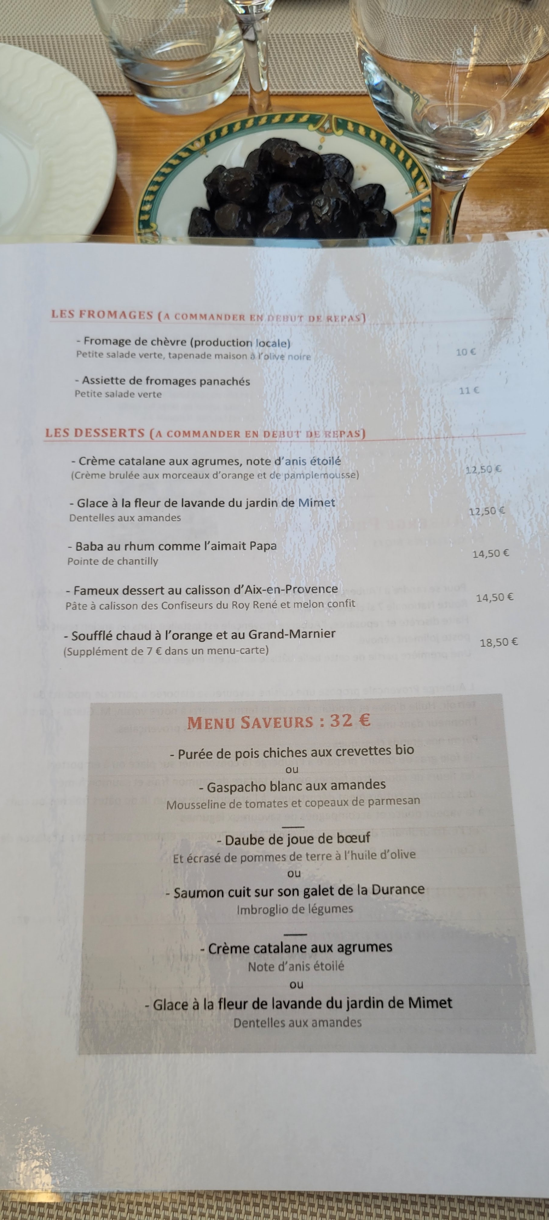 Depuis longtemps nous nous faisions une joie d'y aller. Avec des amis nous avons été déçus. Des desserts communs des plats qui ne donnent pas envie. Arrivés les premiers avec un menu à 28 euros 50 nous avons pour ainsi dire été servis les derniers pour le dessert. Le seul point positif est la carte des vins qui est précise et complète. A éviter, aller jusqu'à Saint Maximin vous ne pourrez que trouver mieux. Je ne comprends pas qu'il soit au Michelin.
