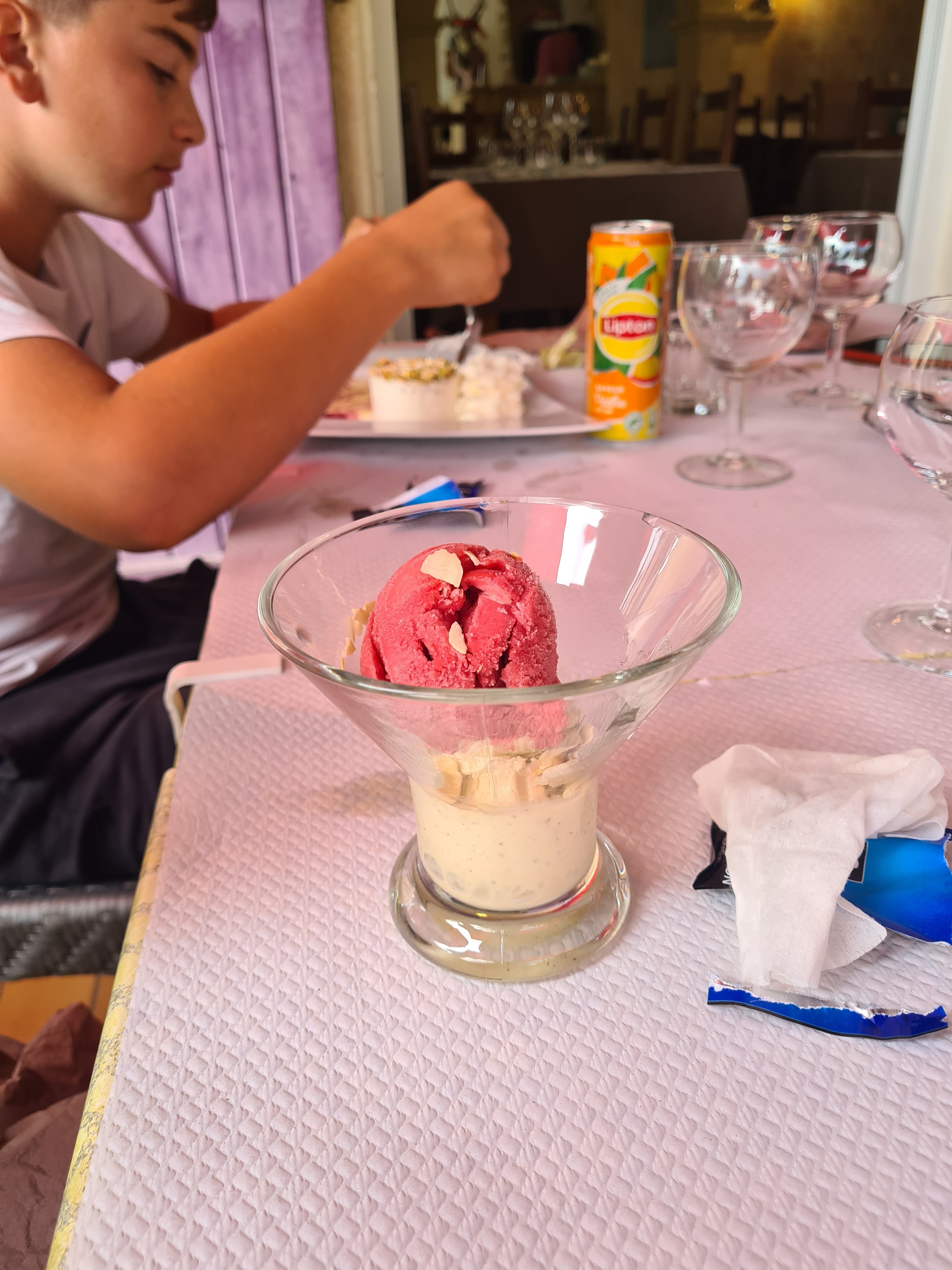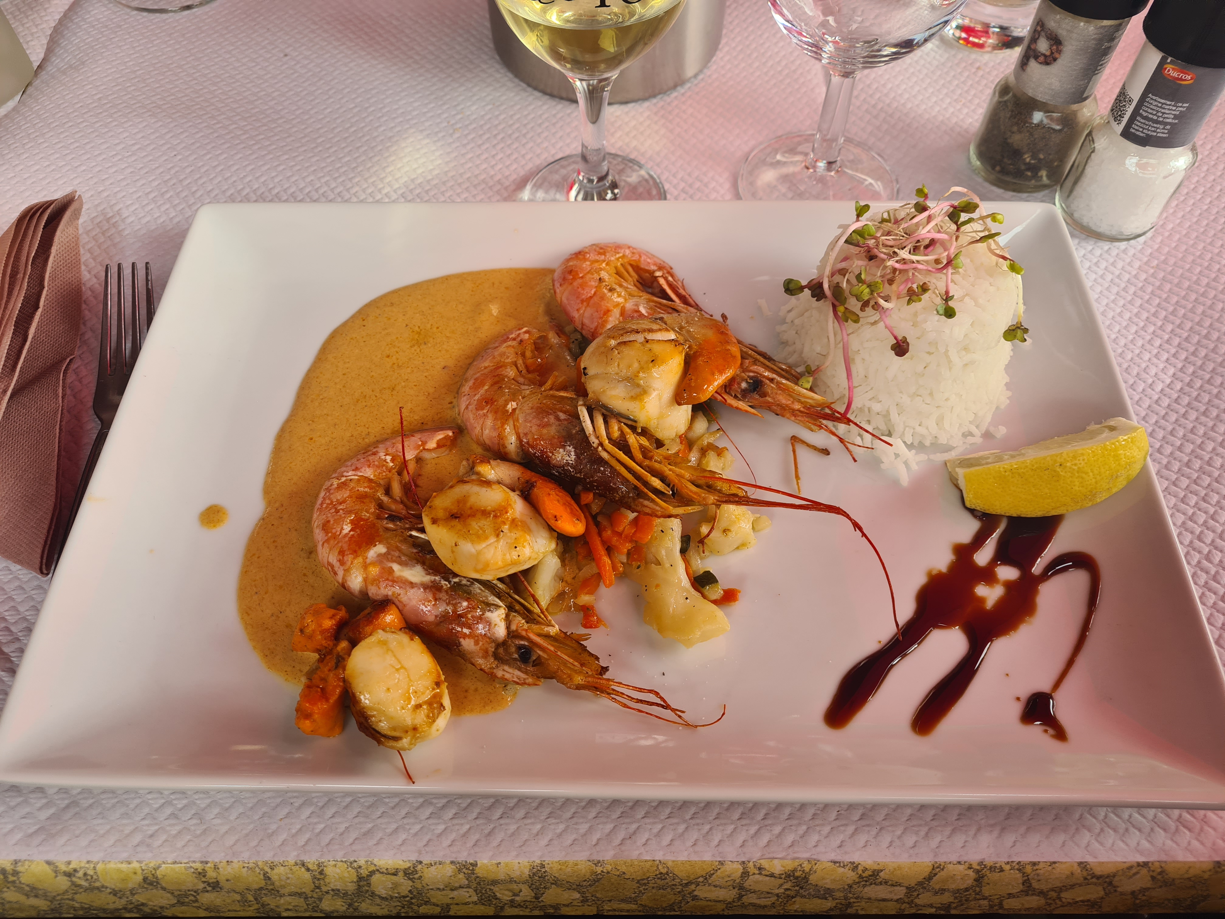 Le serveur m'a renverse mon verre de vin blanc pose sur la table sur mon short et mes jambes ! A peine s'est il escuse. Nous pensions que face à cet incident il aurait eu un geste :nous offrir un café ou le dessert...eh bien NON.j'ai paye mon verre et je je n'ai même pas pu le boire!!!. MANQUE DE SAVOIR VIVRE ET PAS COMMERVIAL LE PATRON !....