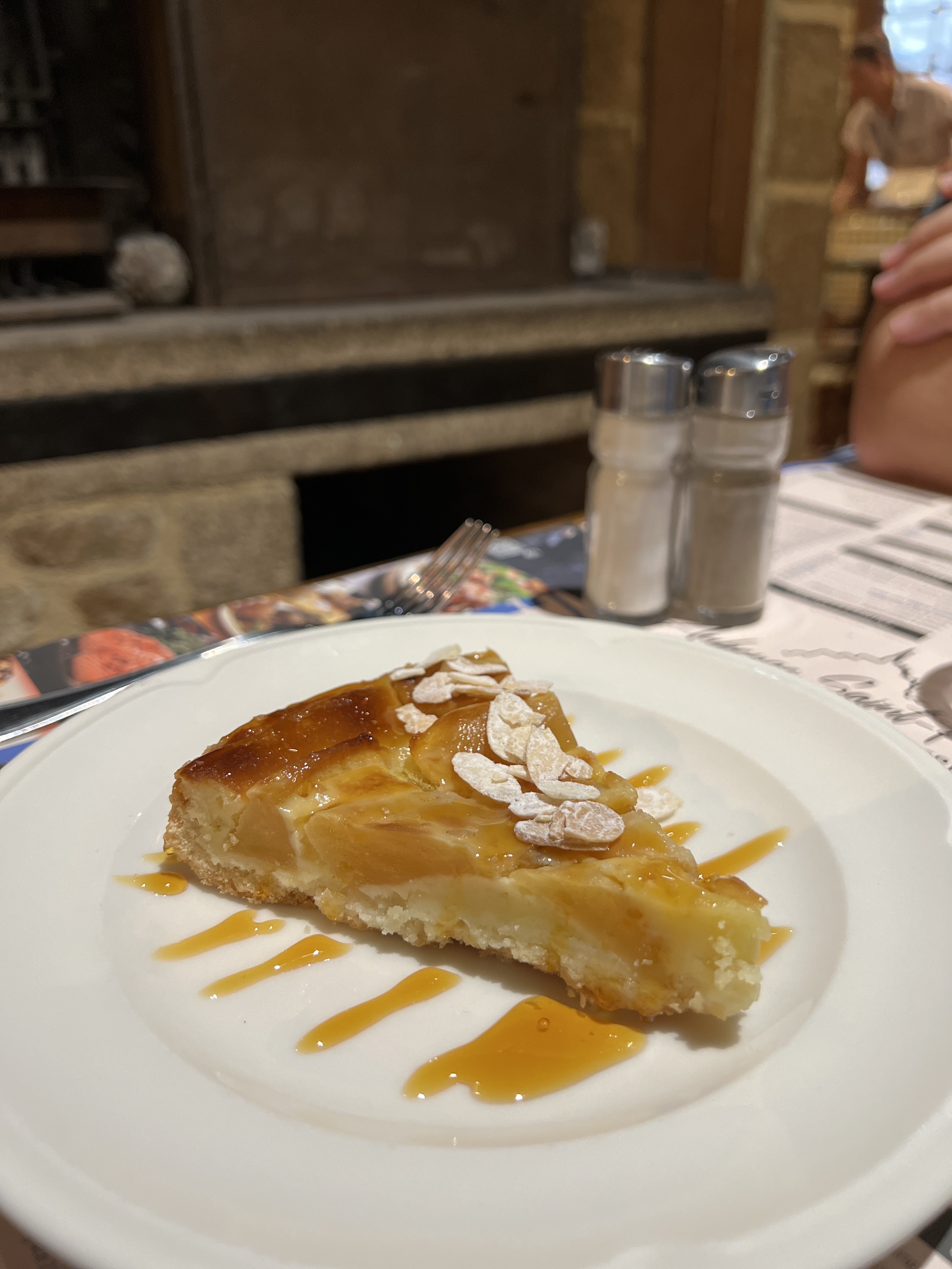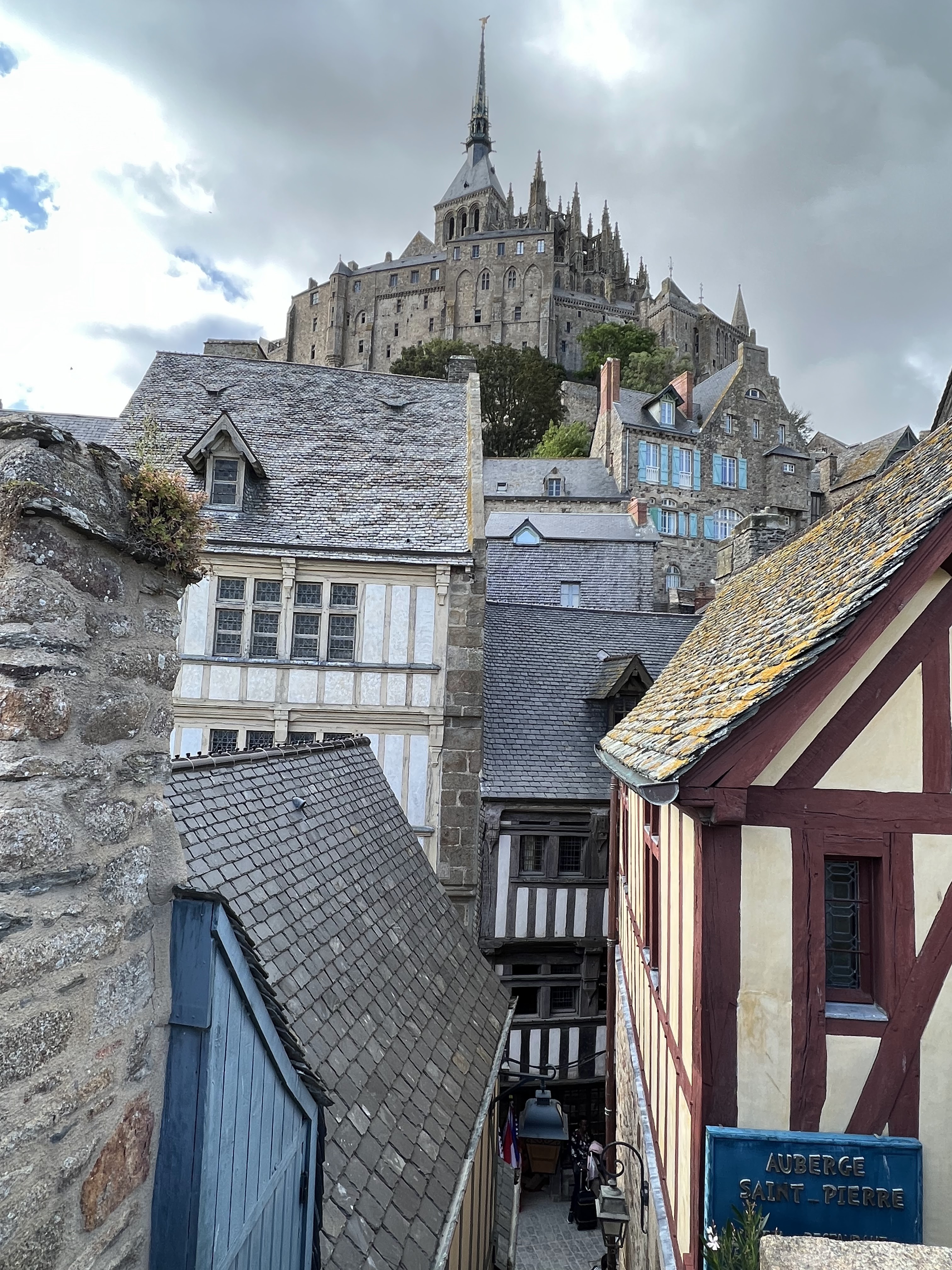 J'ai passé la nuit ici et j'ai vraiment apprécié la chambre propre et le personnel sympathique. L’île allait bientôt fermer et a décidé de dîner au restaurant de l’hôtel. Je suis content que nous l'ayons fait, c'était délicieux et leur omelette était meilleure que la célèbre en bas de la rue. C'est énorme, presque de la même taille que ma pizza. J’aurais aimé qu’ils aient l’option truffe, mais content qu’elle ne soit pas mousseuse et humide comme celle du coin de la rue, ce qui n’était pas attrayant. J'attends ma Tarte Normande, et je vous tiendrai au courant. La vue sur l'Abby que j'ai incluse est celle de l'arrière de l'hôtel et notre chambre est le toit de couleur rouge et crème que vous voyez. Nous avons dû fermer les rideaux pour empêcher les touristes de prendre des photos dans notre chambre. C'est une pièce positivement médiévale. Incroyablement Incroyable, comme un séjour dans un musée. Ce sera fantastique la nuit. Mise à jour : la Tarte Normande aux pommes est délicieuse. Très rustique et ressemble à la recette de grand-mère.