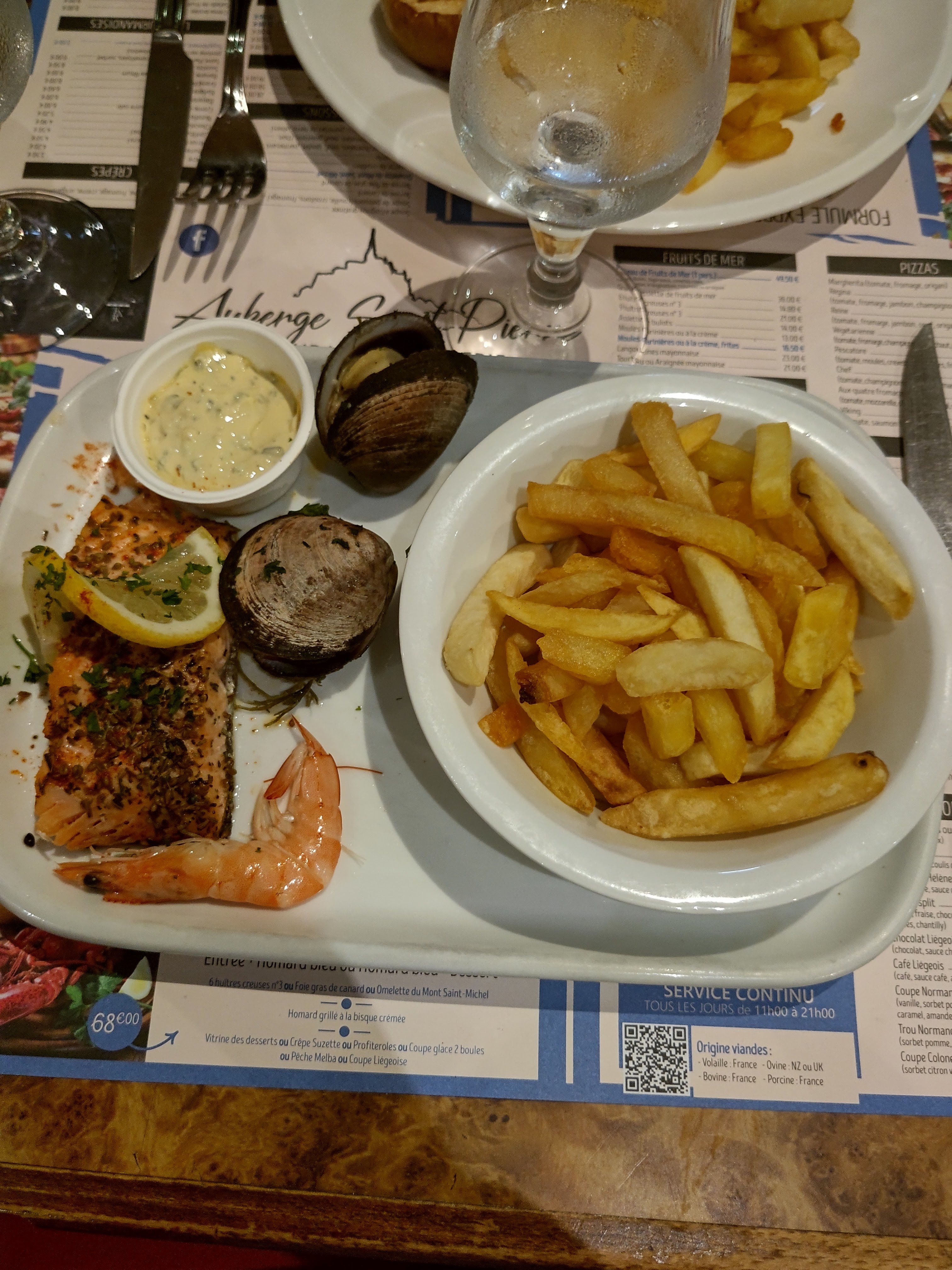 Soirée Grande Maréé au Mont alors plutôt que de nager pour le dîner nous avons commandé à manger dans ce restaurant. Le gars à la caisse était un peu pointu et antipathique mais le serveur qui nous a servi a fait du bon travail. La nourriture n'est pas mauvaise du tout même si les prix sont un peu élevés. Il n'y avait pas grand-chose d'autre ouvert mais j'y retournerais volontiers de toute façon !